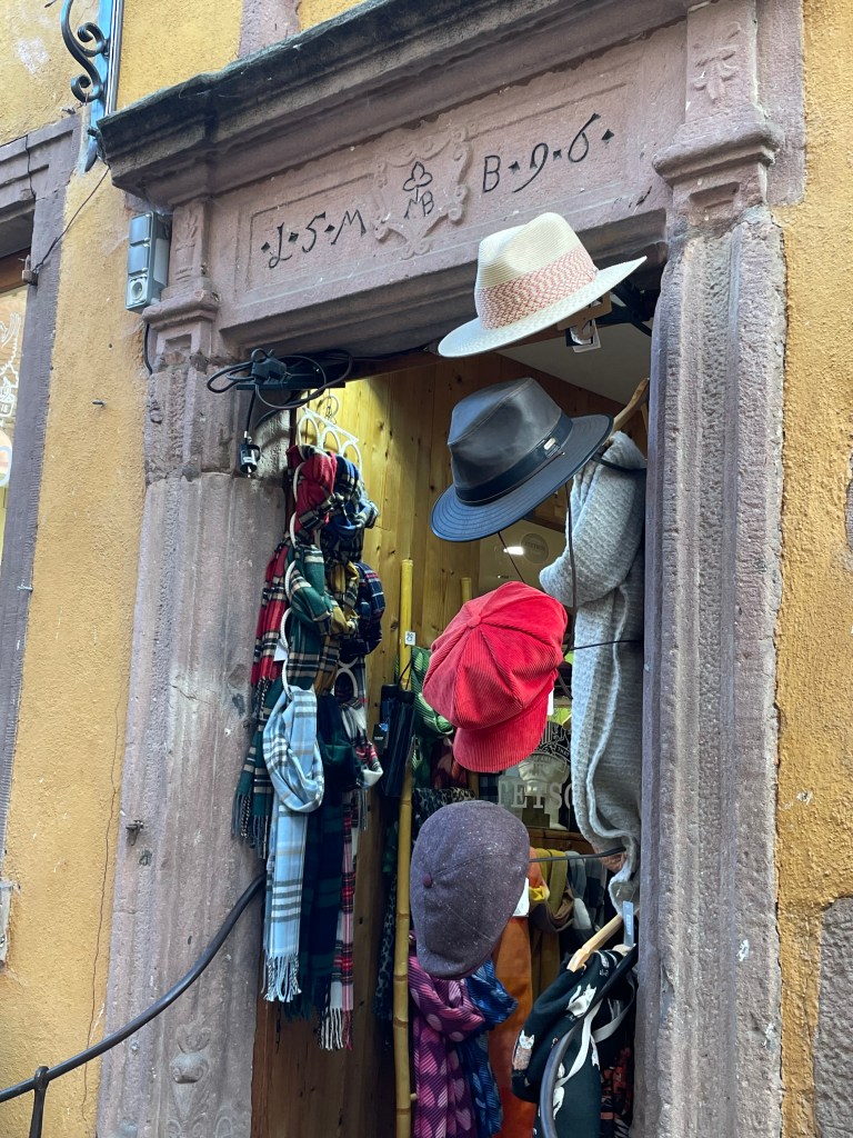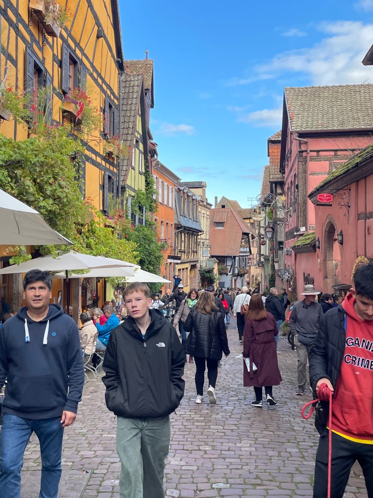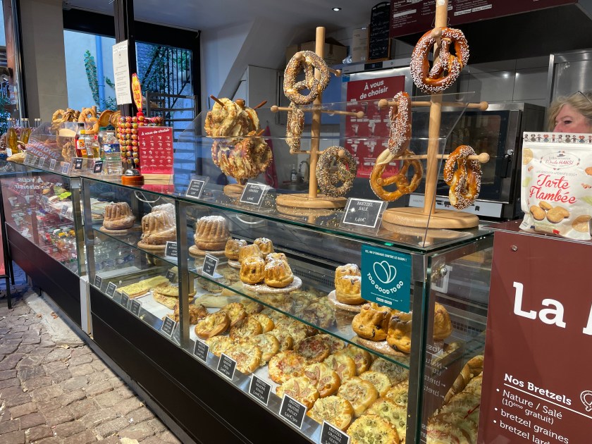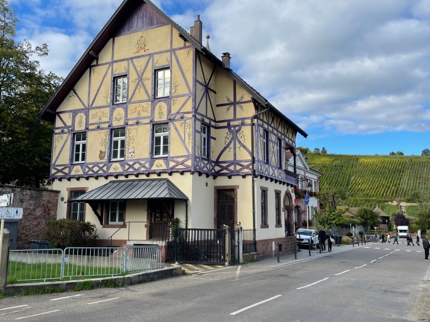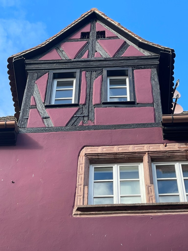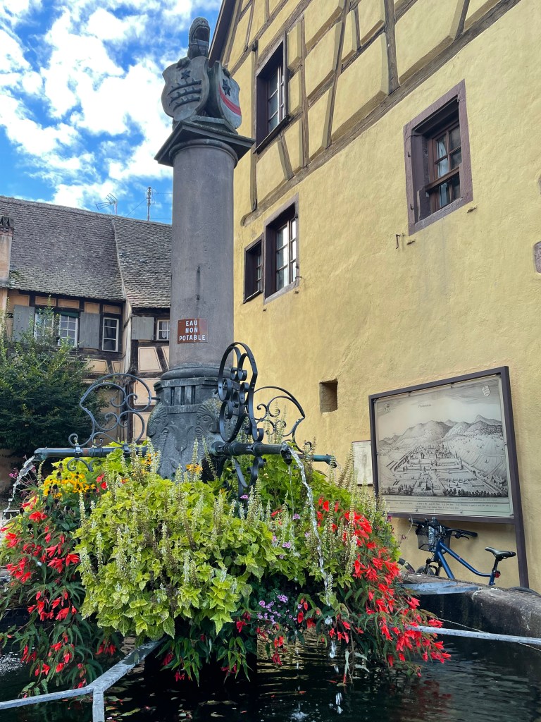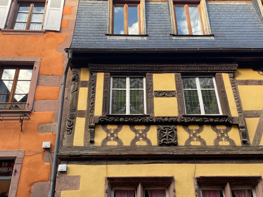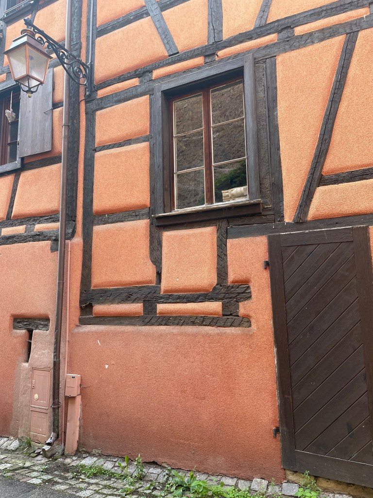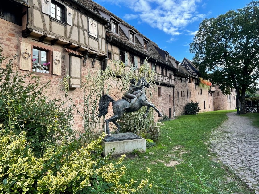 We walked through the main street in the center of Riquewihr, then circled inside the walls on the narrow cobblestone street. Last time we were here was in the dark at the end of a cold December day. It was lovely and charming and delightful to see today in the daylight.