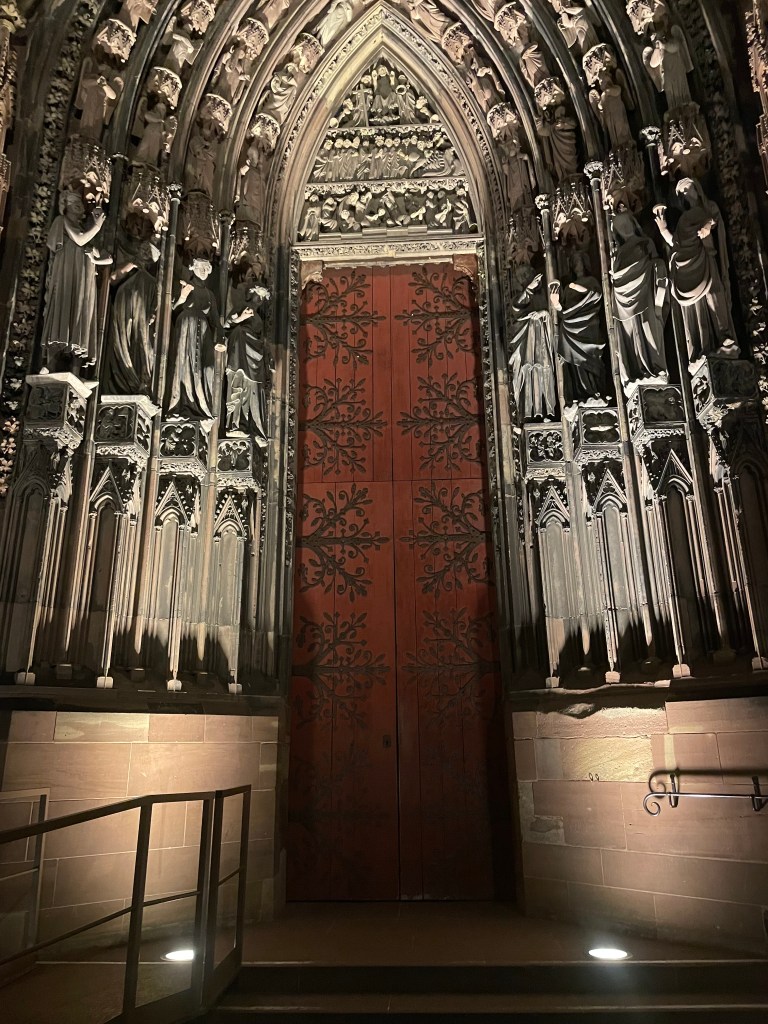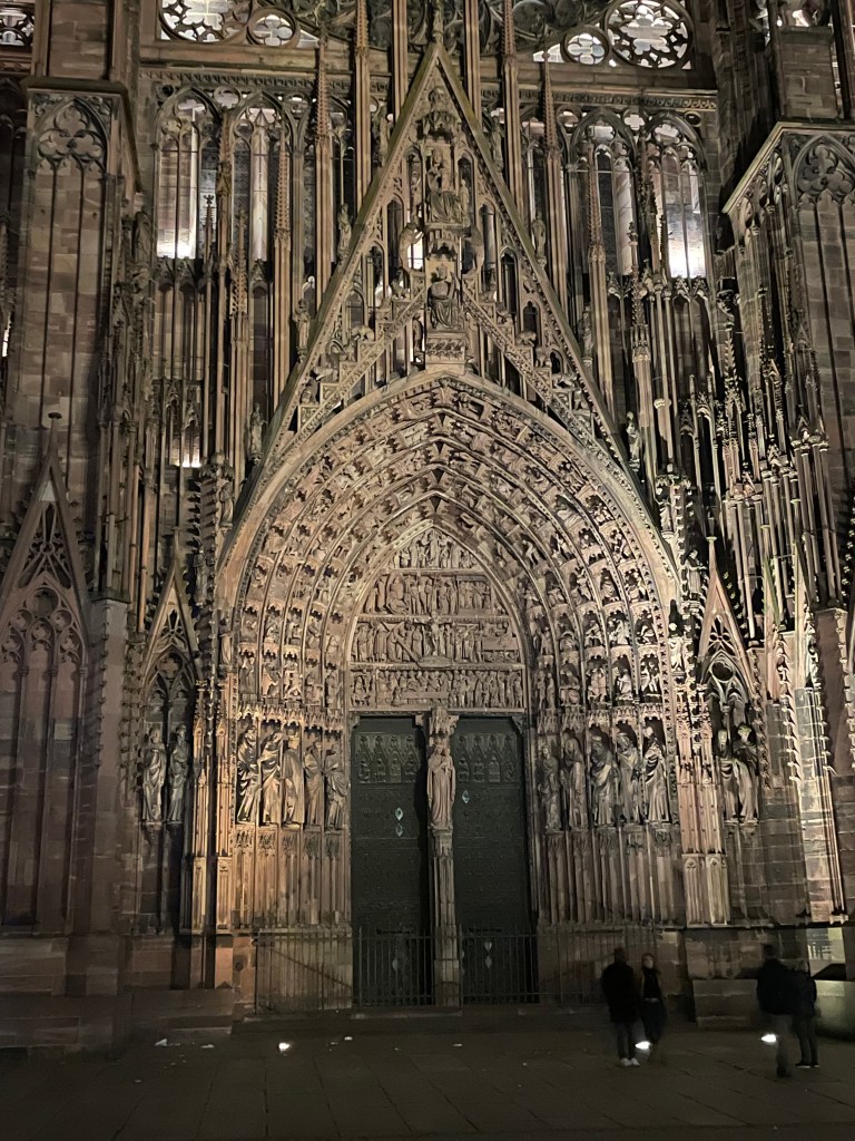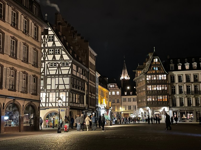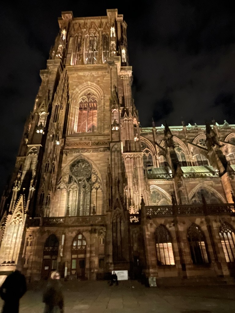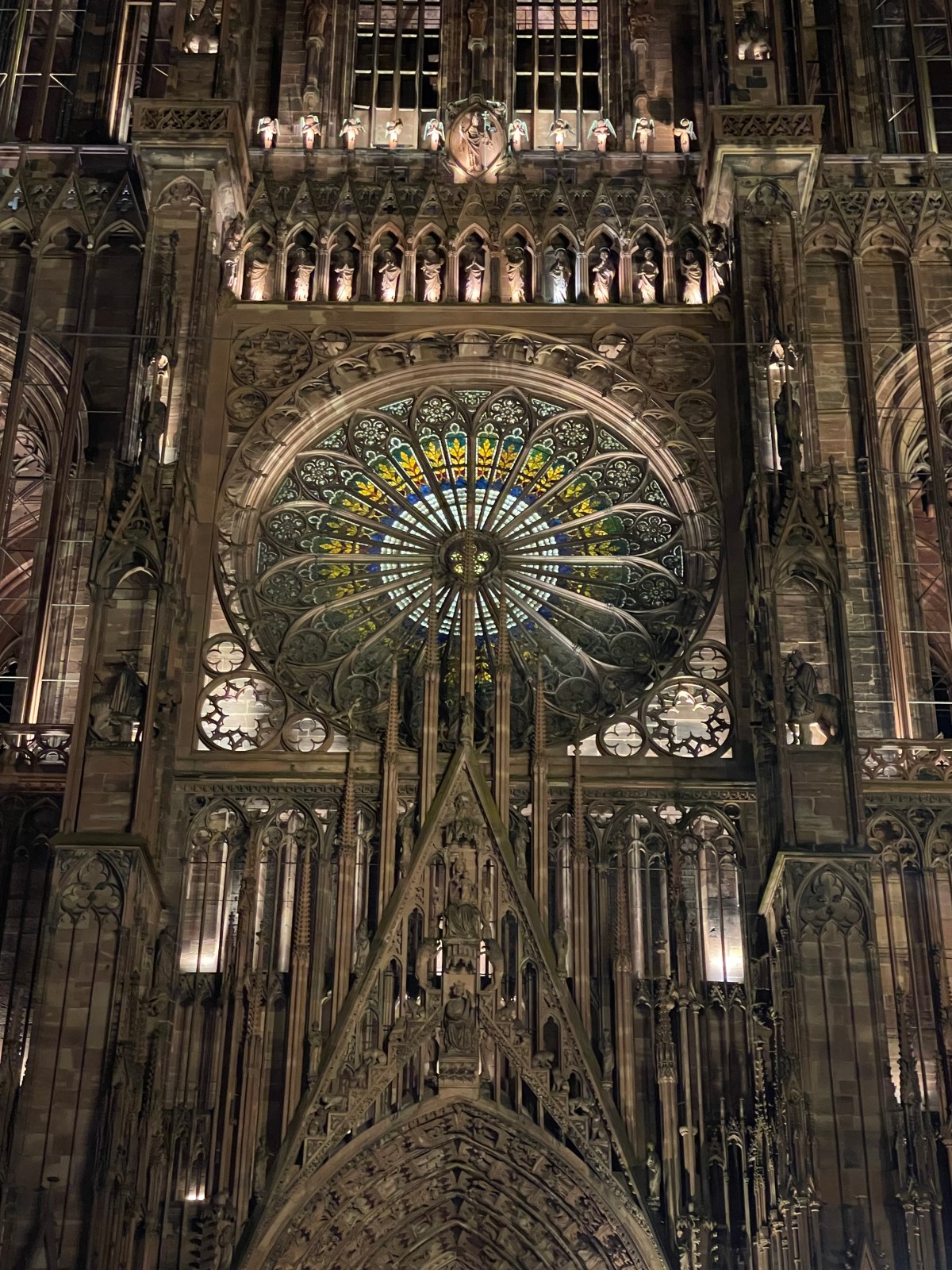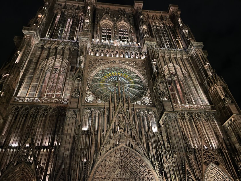 We got to Strasbourg as it was getting dark. Tonight we split up for dinner. John and I went to see the Cathedral by night and it was SPECTACULAR. Oh my, Goethe said, “Architecture is frozen music.” He must have been looking at this cathedral at the time. We just stood and stared and the beauty. I think this is one of the most beautiful cathedrals we’ve seen. It was delicate and detailed and lit perfectly. The stone looked like lace. It took our breath away.