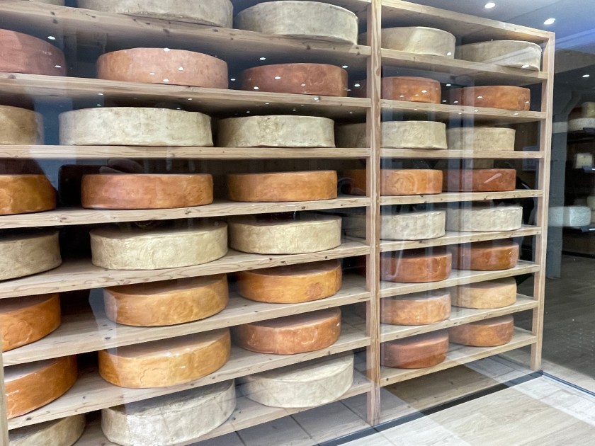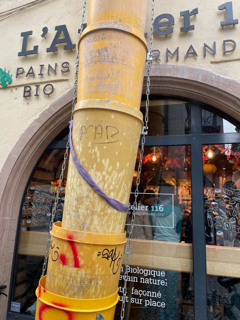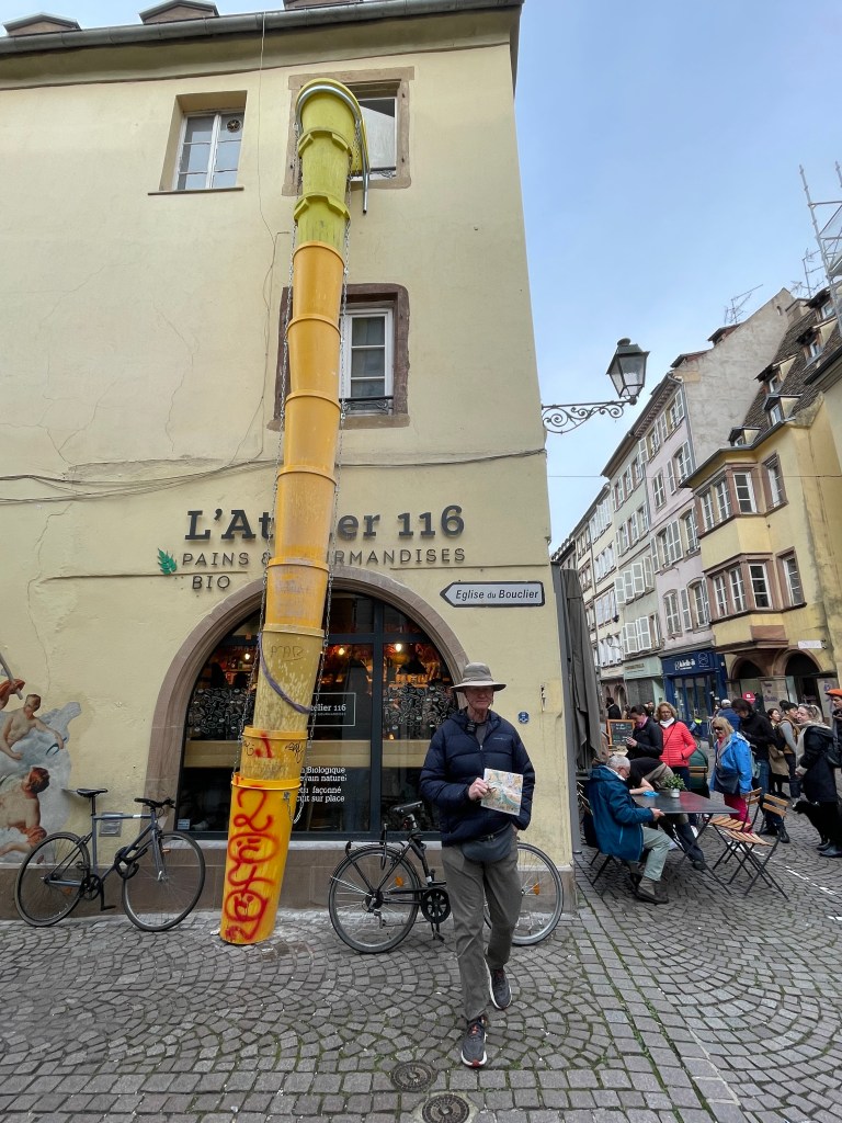 While they waited in line, I watched people going by. I also noticed some construction workers upstairs over the bakery. Look at the shute they made to get rid of the construction debris.