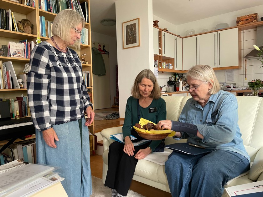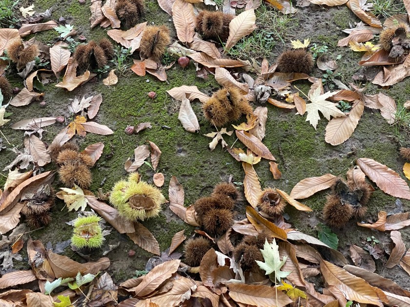 Today in our peaceful German class, we learned about Fall and about chestnuts (Kastanie or Maronen). There are many varieties, not all are edible. Some have spiky shells, some are bristly. The bristly ones are edible. Chestnut trees line the streets here and the nuts fall to the ground from October to November. It’s hard not to step on them, and cars crunch them as they pass.