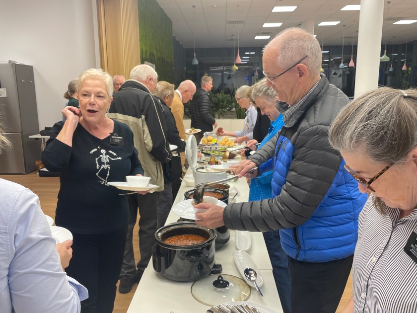 Here’s our monthly potluck meal, featuring chili and cornbread. It was really fun to see some of the Polish pottery showing up here!