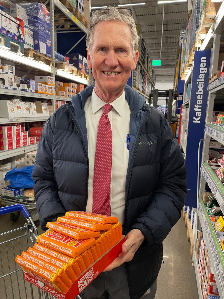 We’ve prepared the agendas, the seminar topics, the food, transport, lodging and all the logistics. John has a spreadsheet for every aspect of the seminar and the 14 directors flying and traveling to Frankfurt to join us. This week we’ve worked with caterers and have picked up food, snacks and gifts (John in the photo above with his favorite Tony’s chocolate bar).