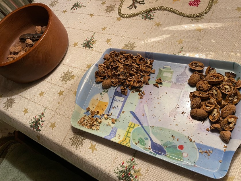 I noticed this tray of walnuts on his dining table. Immediately I thought of my Grandma Elsa, who always had a try of walnuts to shell on her lap during the winter months. We had a couple dozen walnut trees on our farm. She kept her hands busy this way in the evenings. Our friend here said he shells the nuts to feed the birds. What a kindness!