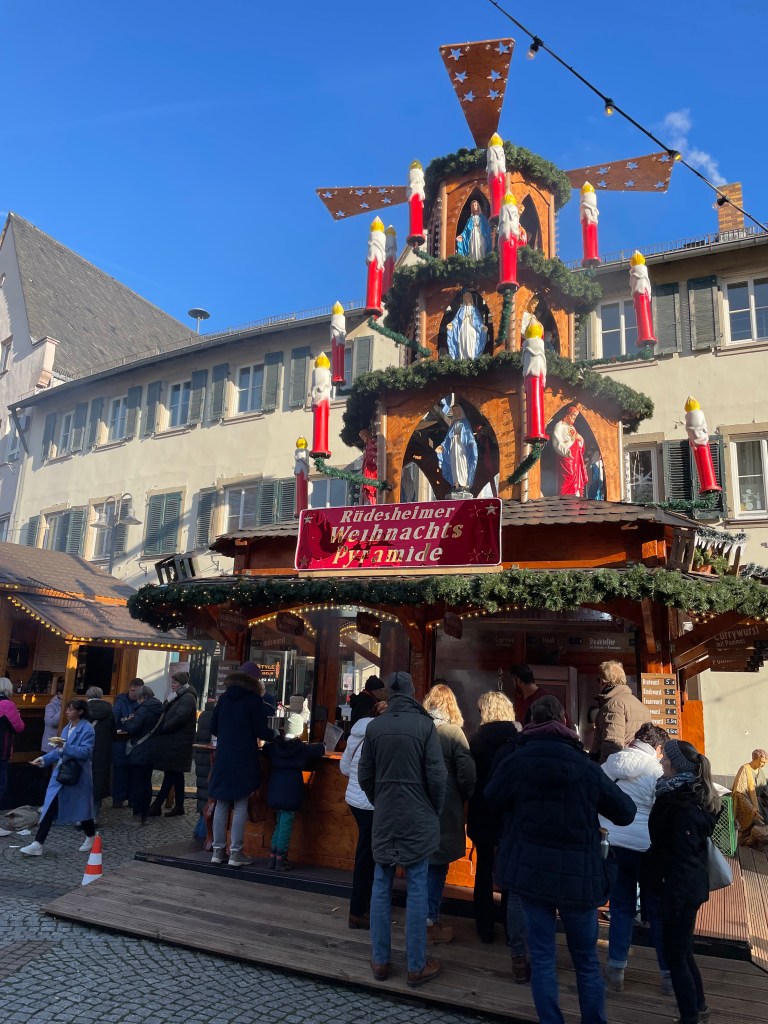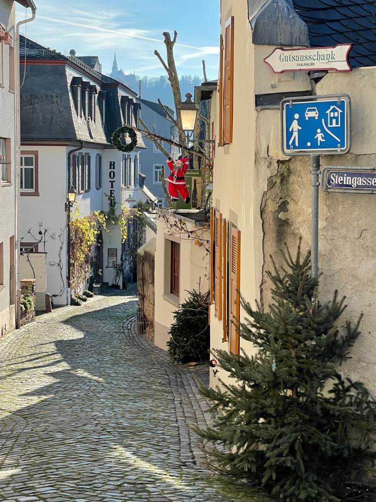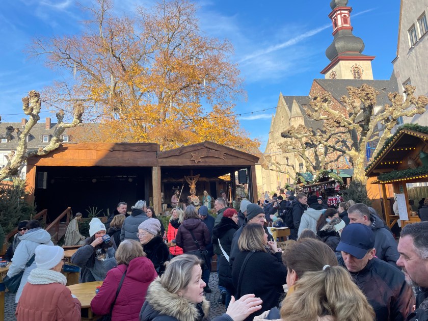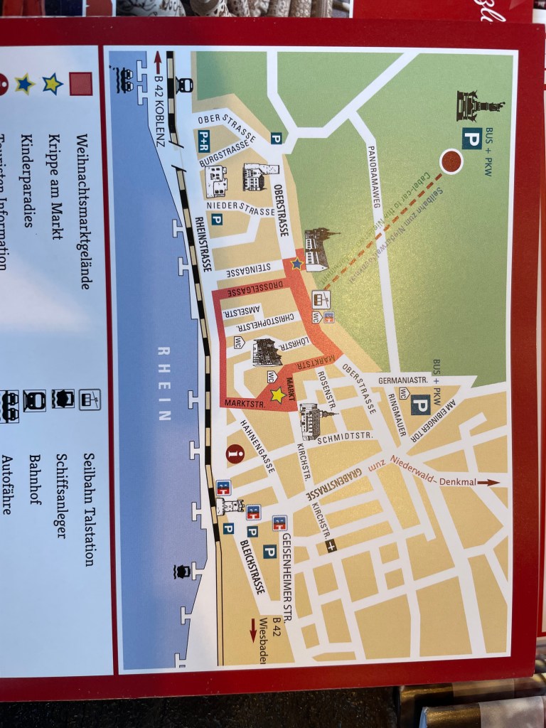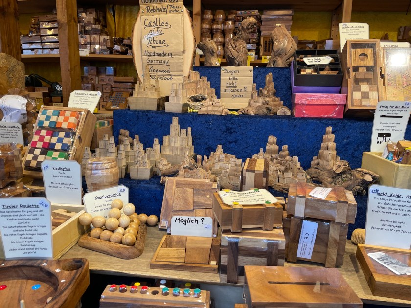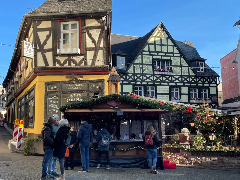Rüdesheim is the town we went to a few months ago to ride the gondola up over the vineyards to a memorial up above the Rhine River. It’s a wine-growing town. The description of the market sounded fun and it was.