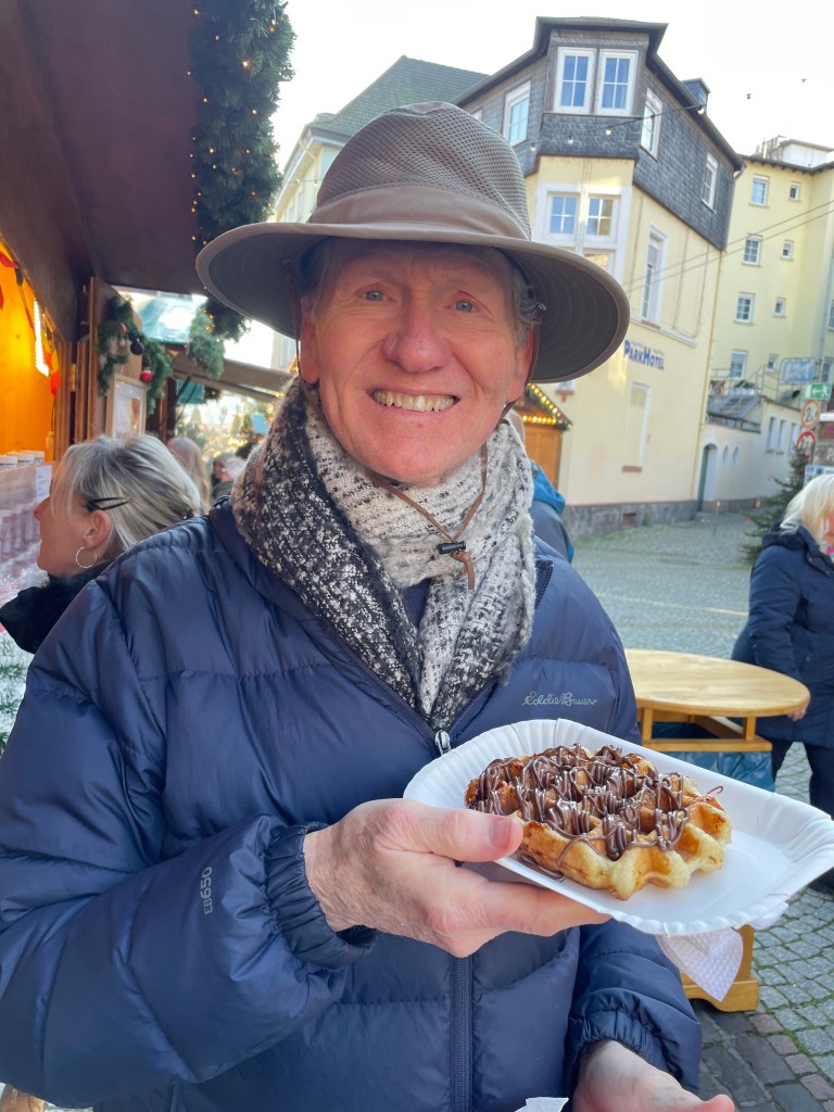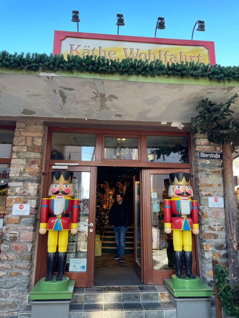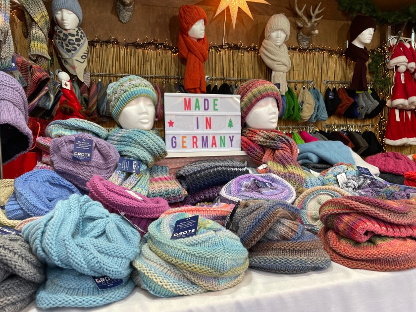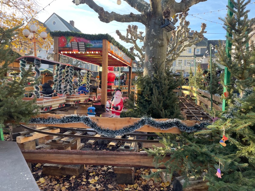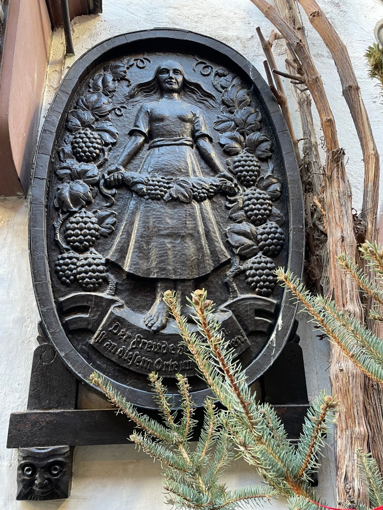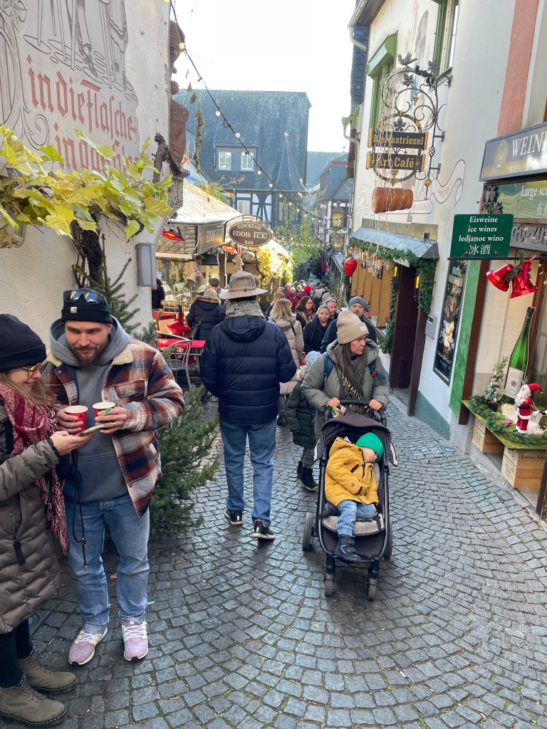 Rüdesheim is the town we went to a few months ago to ride the gondola up over the vineyards to a memorial up above the Rhine River. It’s a wine-growing town. The description of the market sounded fun and it was.