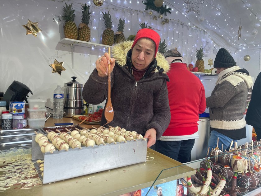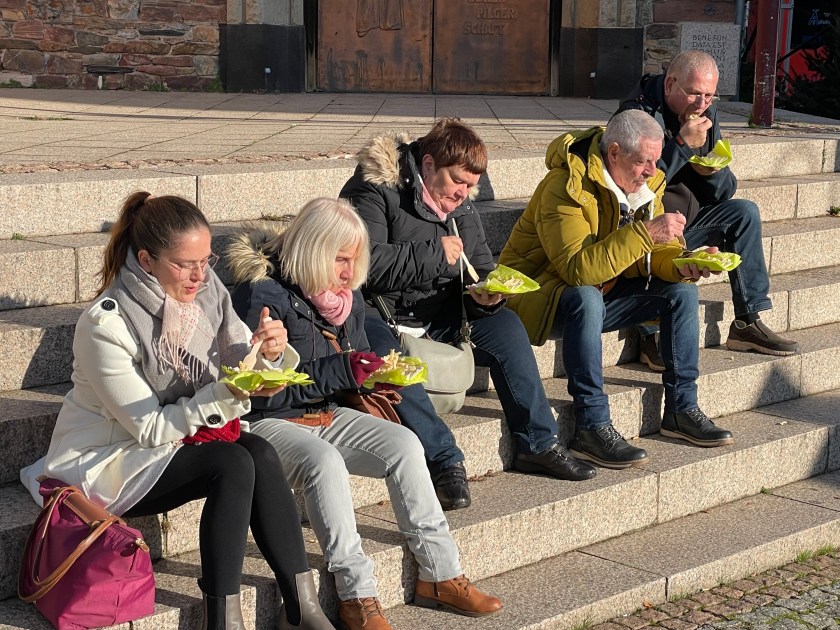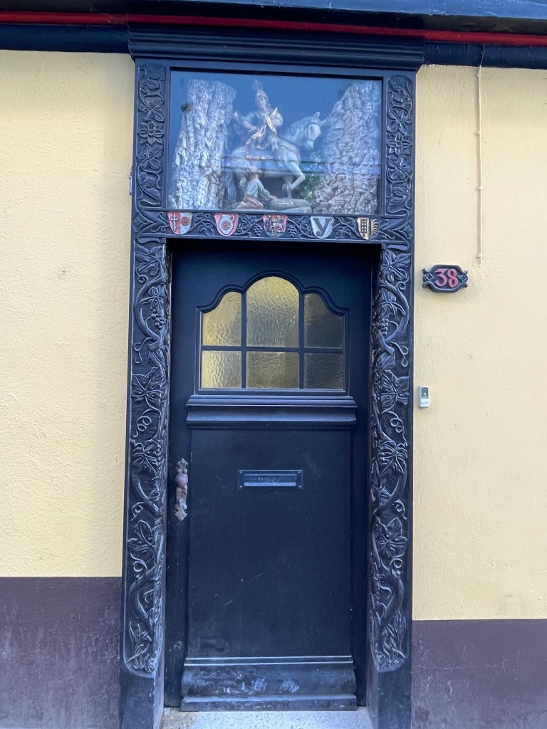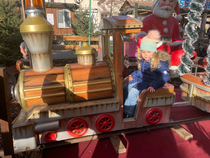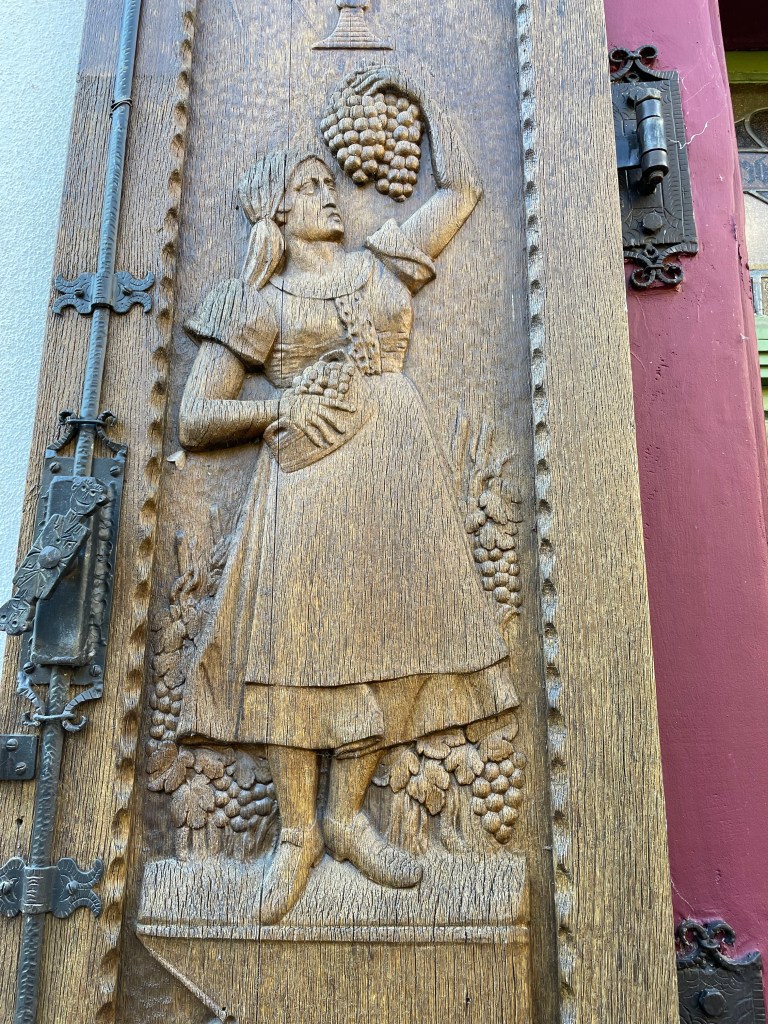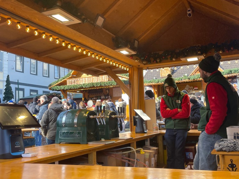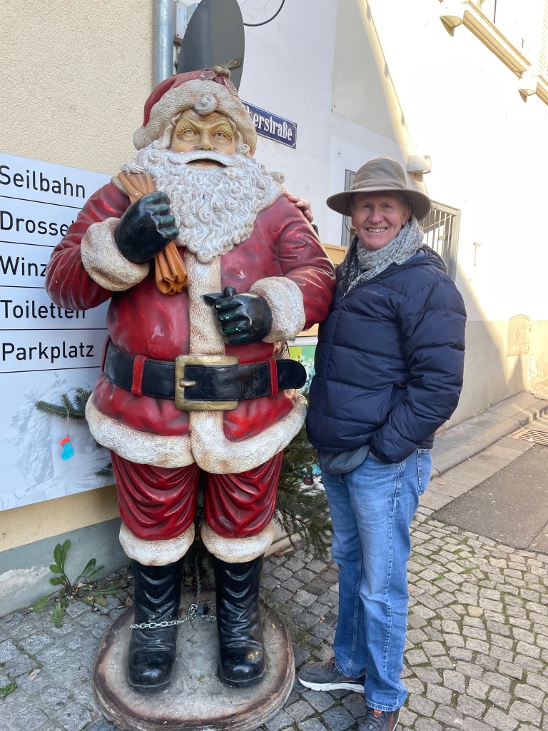 Rüdesheim is the town we went to a few months ago to ride the gondola up over the vineyards to a memorial up above the Rhine River. It’s a wine-growing town. The description of the market sounded fun and it was.