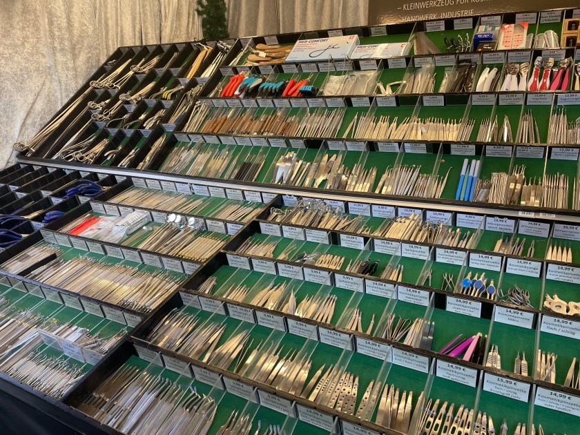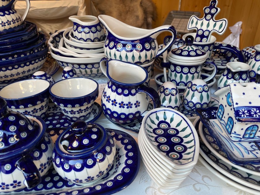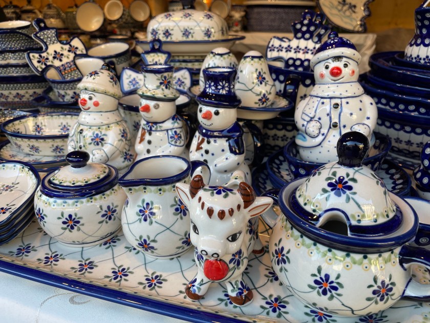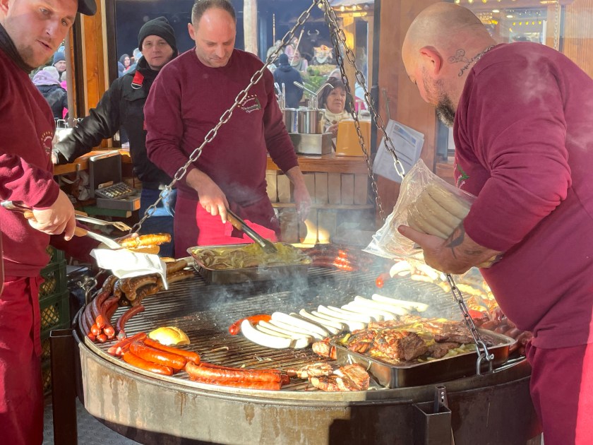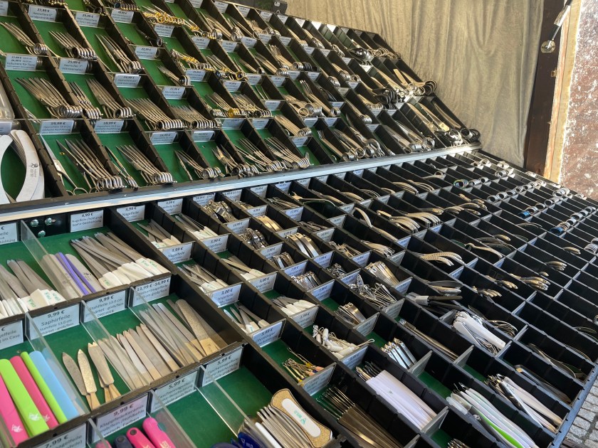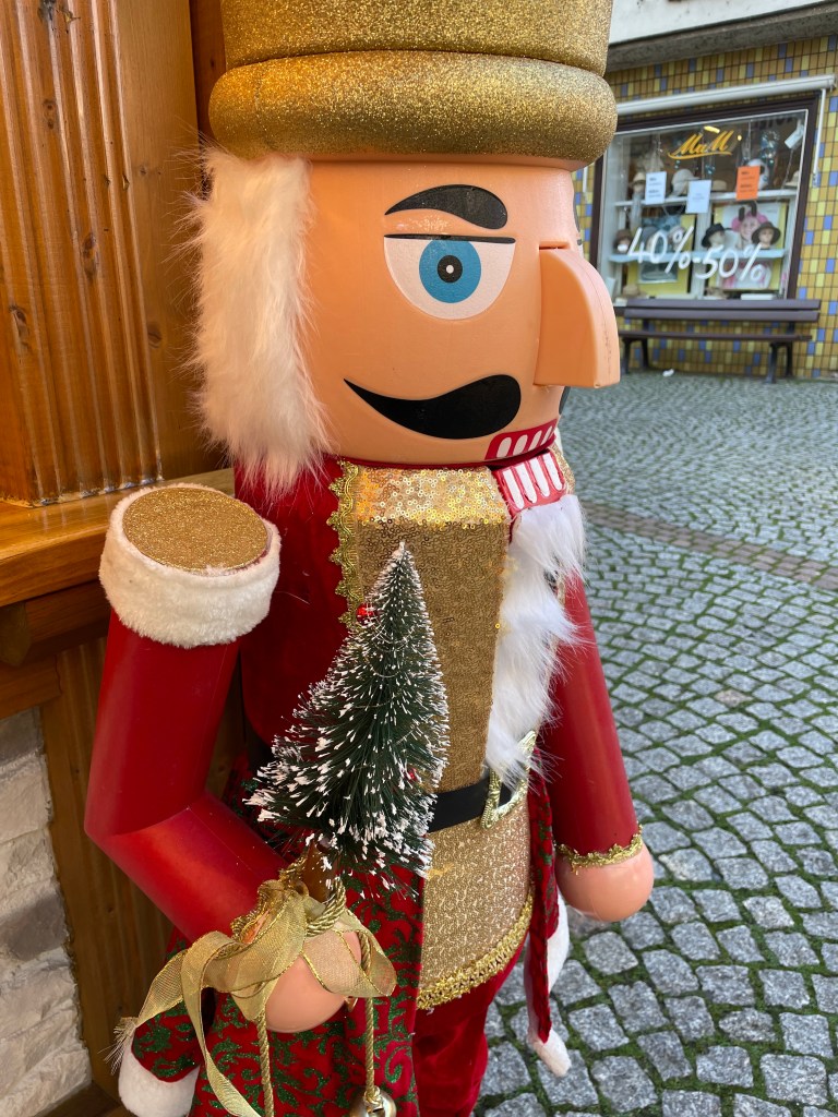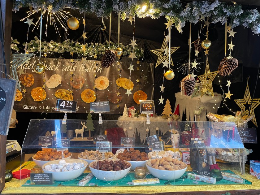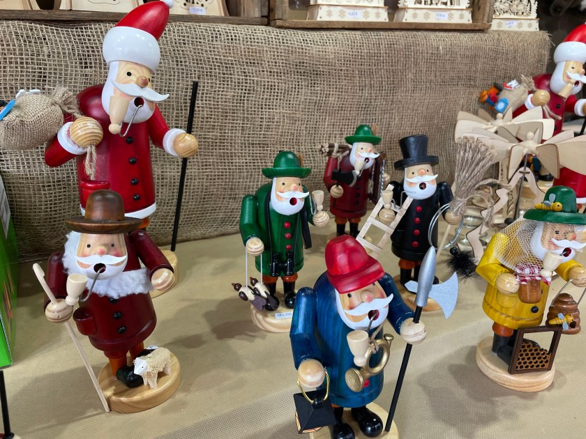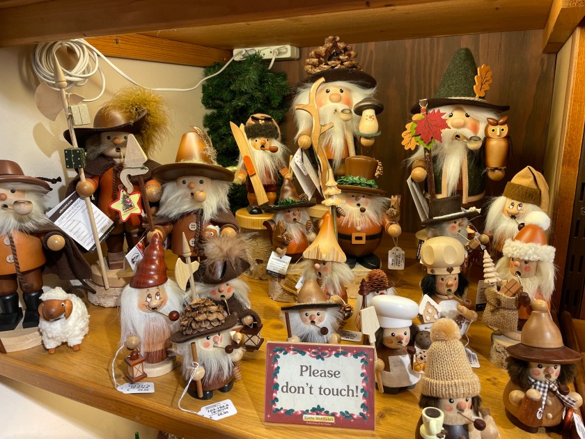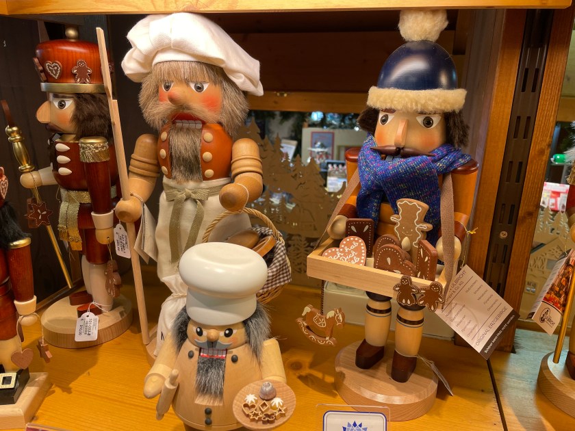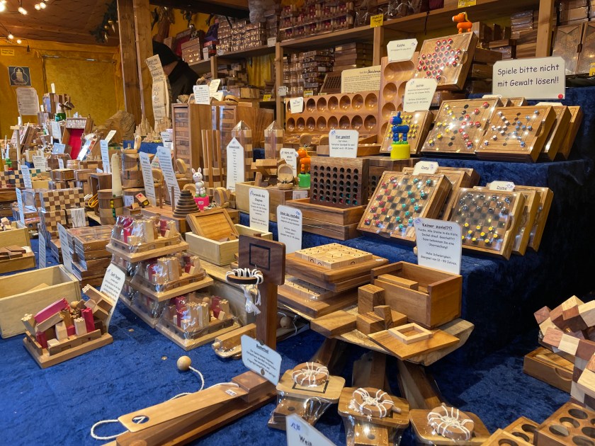 There was plenty of Gluhwein and beer served. For most, the markets are all about the food. I am always looking for something hand-crafted or unique. I bought one ornament–a hand carved moon with a face. And we found a stall with wood carvings and got a small (African) frog and cricket to add to our collection. There was a smaller Katie Wolfahrt store here. Those are so fun to walk through (but not for John).
