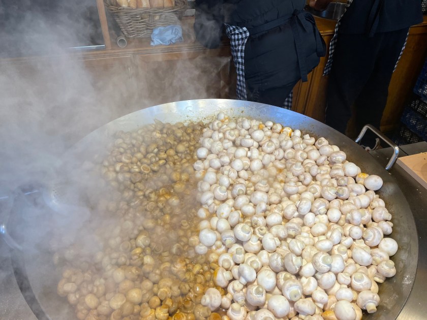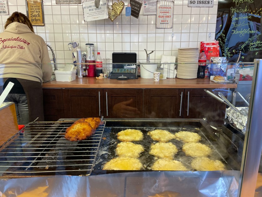 John got some of the deep fried potato patties (Püffer)–you get 3 large patties served with applesauce. I had a couple of bites. He also got a waffle covered in Nutella. I had a bun with ham and cheese baked inside. Later we saw Raclette, but we’d had enough.