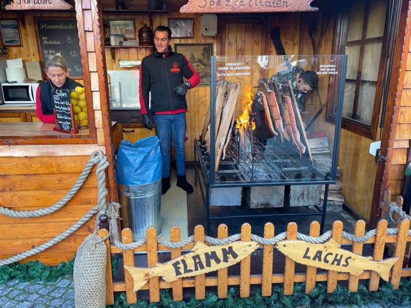 Flamm Lachs is smoked salmon, grilled over a fire, served on a bun. It’s delicious.