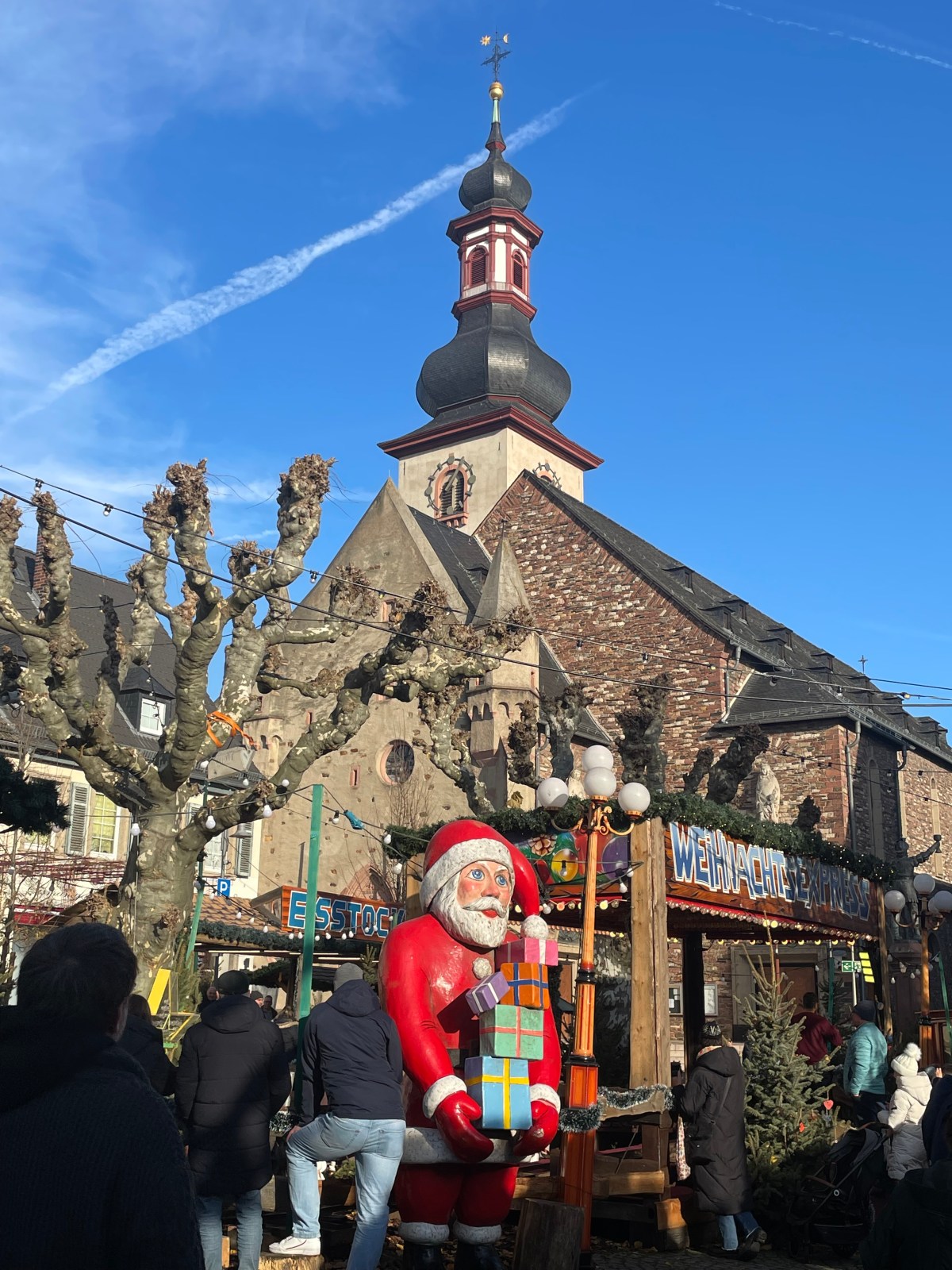 Rüdesheim is the town we went to a few months ago to ride the gondola up over the vineyards to a memorial up above the Rhine River. It’s a wine-growing town. The description of the market sounded fun and it was.