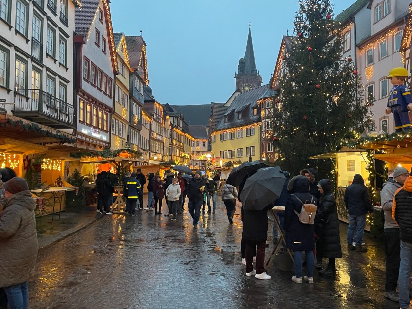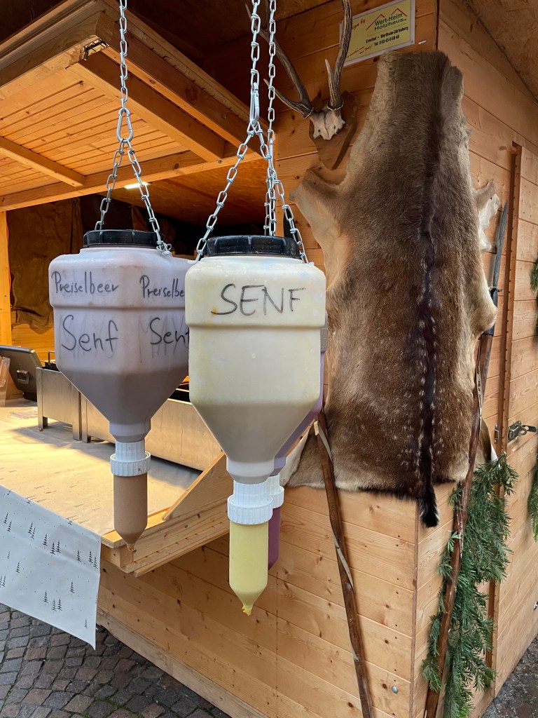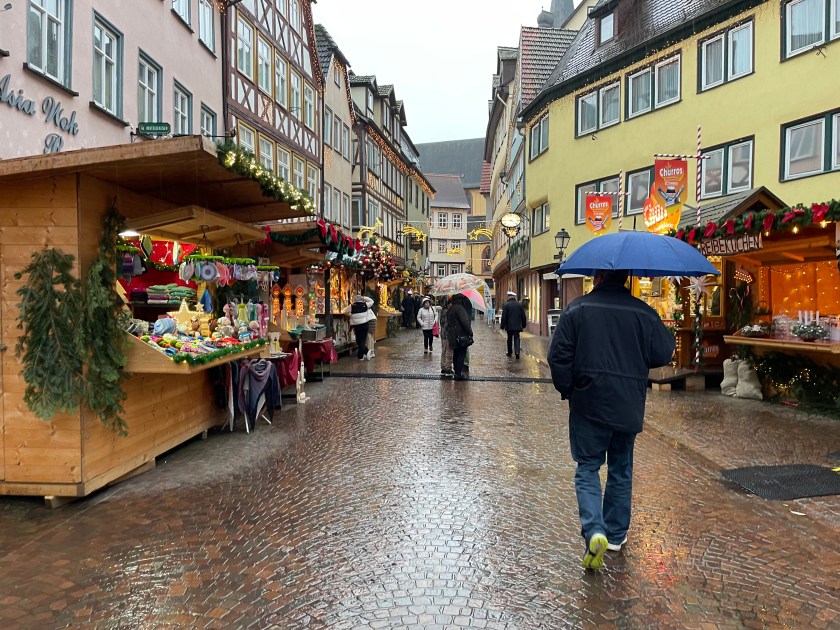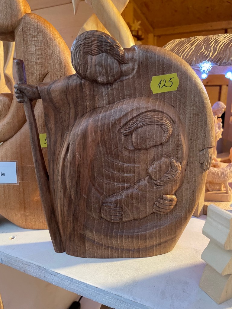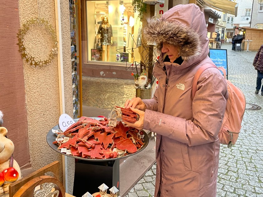 I am always on the lookout for unique hand-crafted items made locally. Today we met Johann Zimmerman. He said his family had a tradition of woodcarving in Hungary–his great-grandpa, his grandpa, his father, and now he carries on the tradition, the last. His sons aren’t interested in it. He had a small stall. We bought a carved Nativity from him–it’s one piece with Mary, Joseph and Baby Jesus. Johann’s initials are carved on the back. He was thrilled that we’d come all the way from America to buy his Nativity. We took photos with him. He was great. That purchase made his day and ours too. Really. It was worth every Pfennig just to see him so happy.