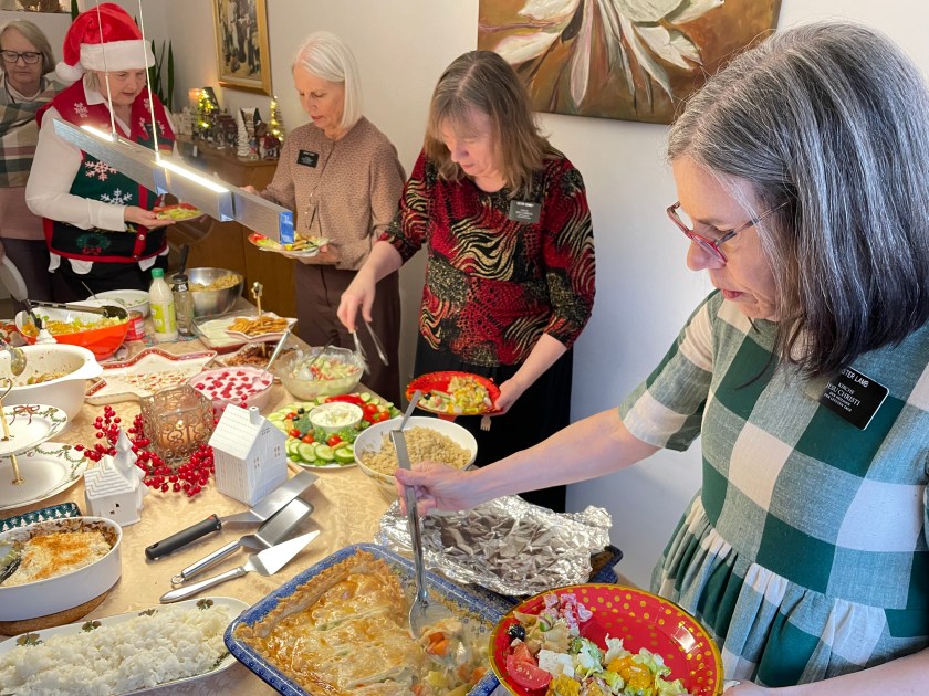 Every year the wives of the Area Presidency invite all of us over for a Christmas luncheon at one of their homes. Today we went to Sis Alliaud’s home. We came bearing salads and desserts. They provided the main courses–a chicken pot pie, a beef dish and a chicken dish. The food was fantastic.