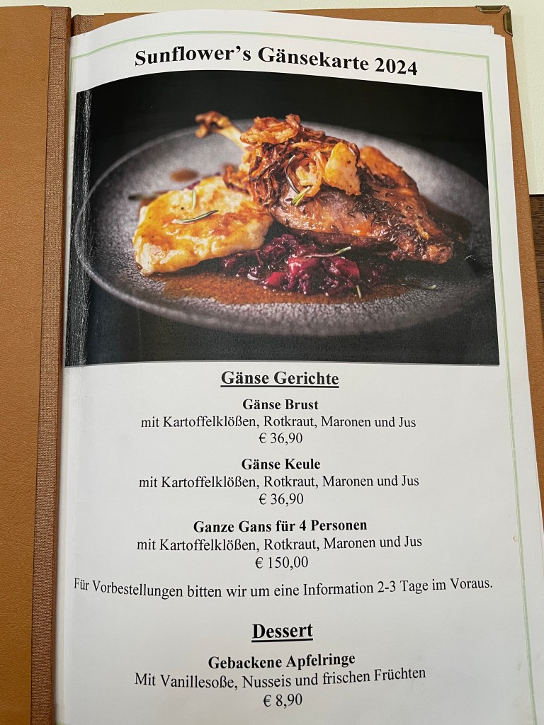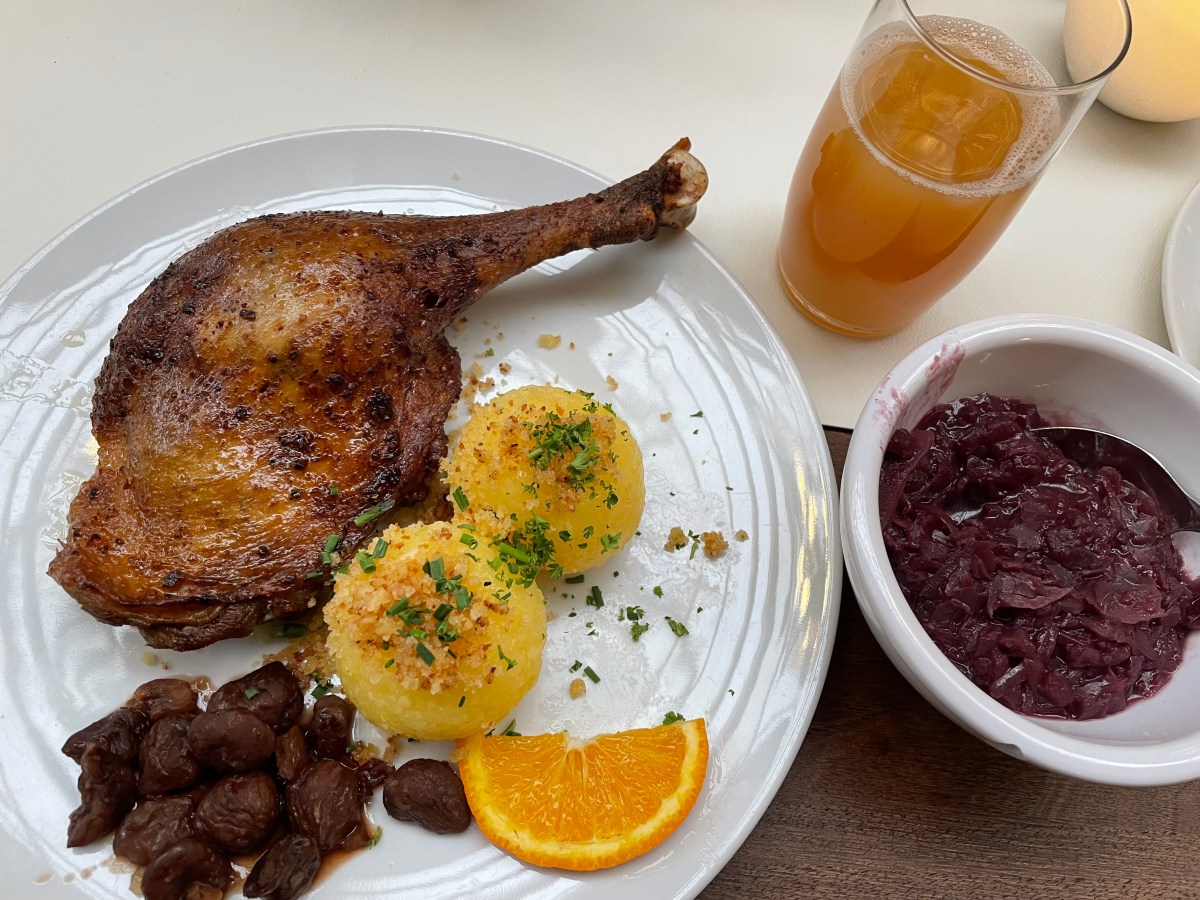 First we were brought some fresh brown bread and a bowl with a spread made from goose lard and roasted onions. Then the meal came: a leg and thigh, 2 Knödel (dumplings), some roasted chestnuts and a bowl of warm Rotkohl (red cabbage). This is the beloved and traditional meal duplicated all over Germany right now.