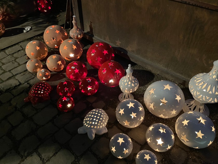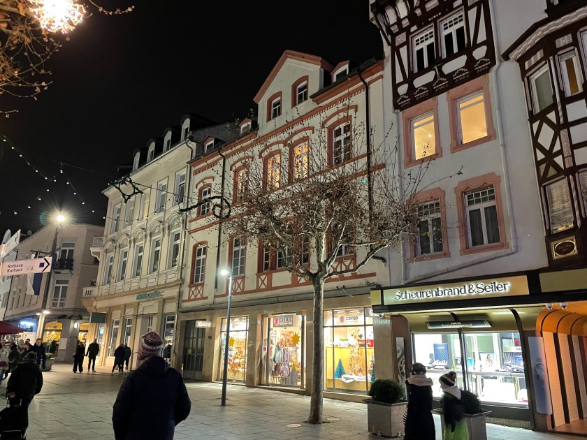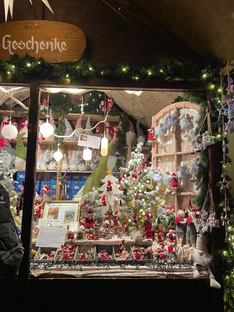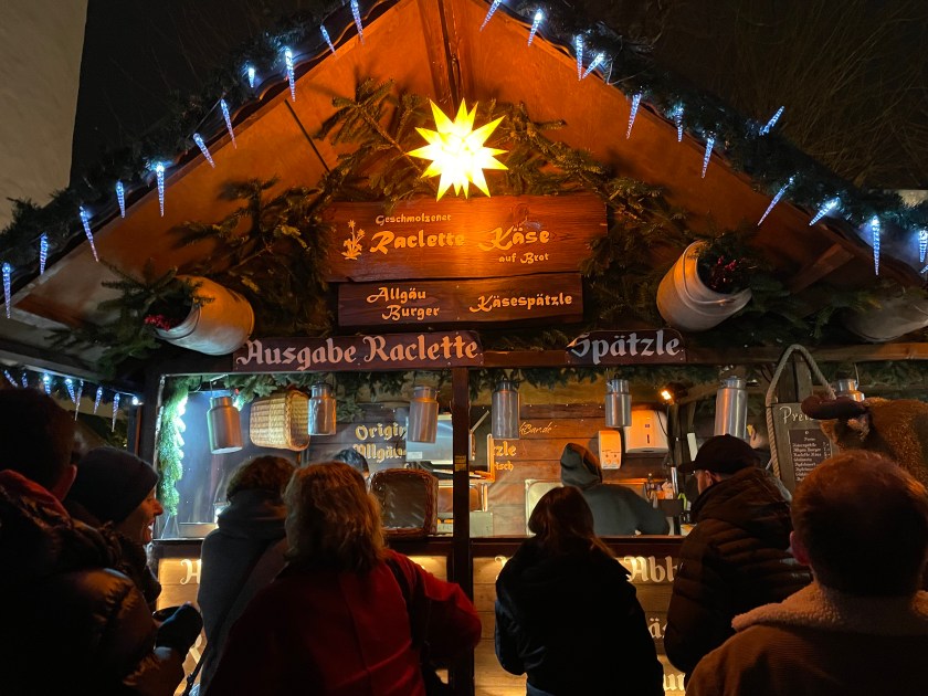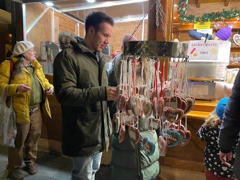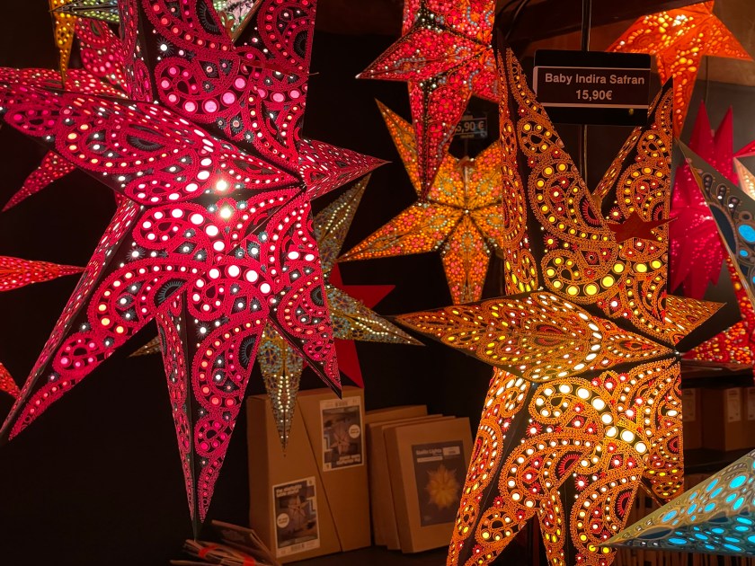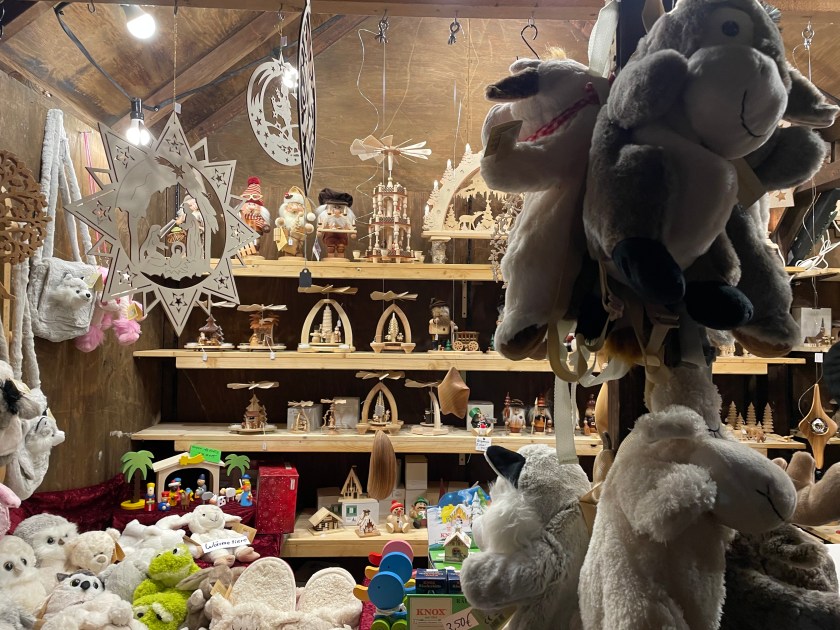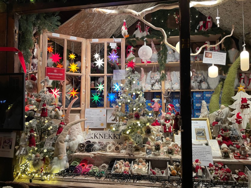 We got off the bus at Luisenstrasse, the walking promenade that leads to the castle and the Christmas Market area. The whole distance was festive with a few market stalls along the way. At Christmas time in Germany, the shop windows are decorated and beautiful. There are stars and lights in windows. Everything feels festive.