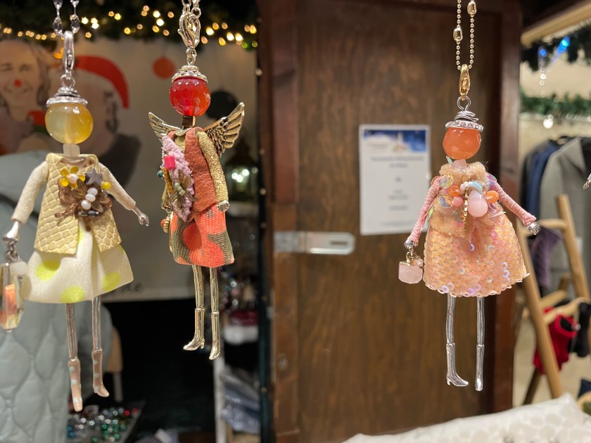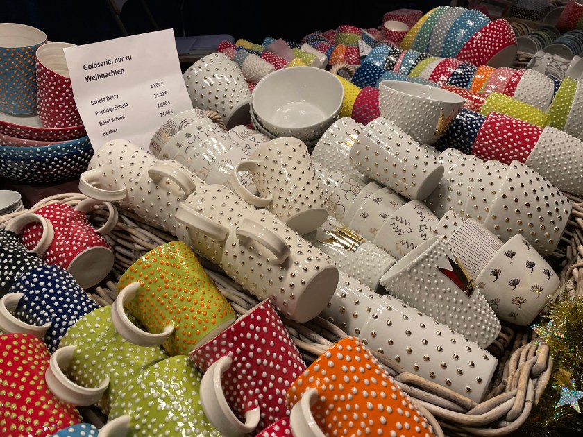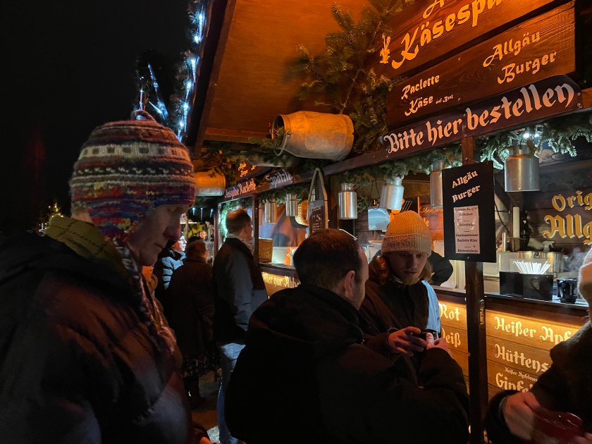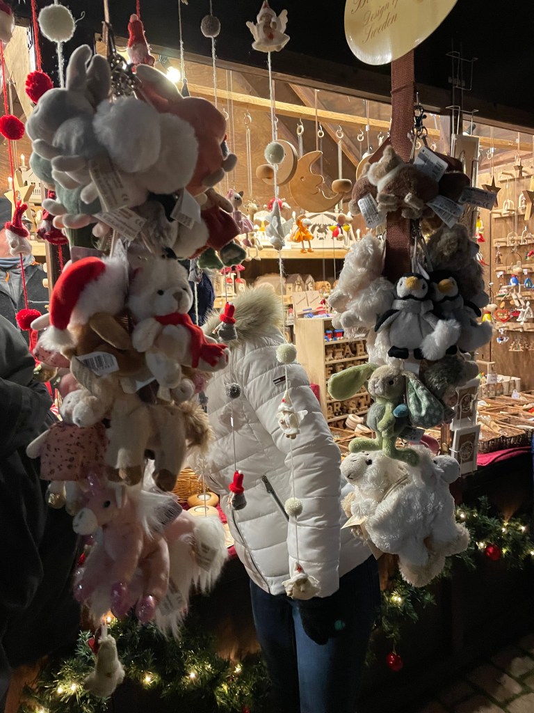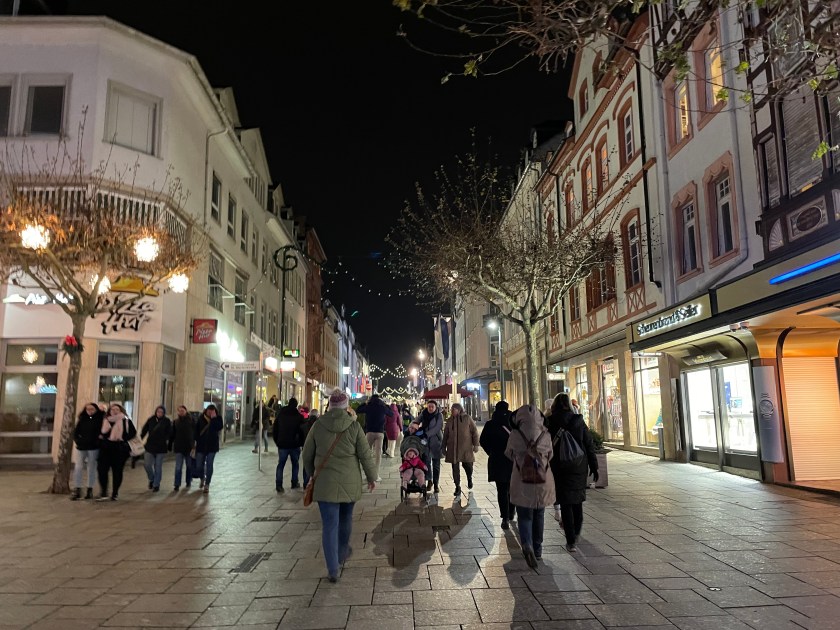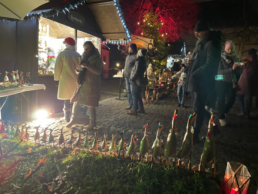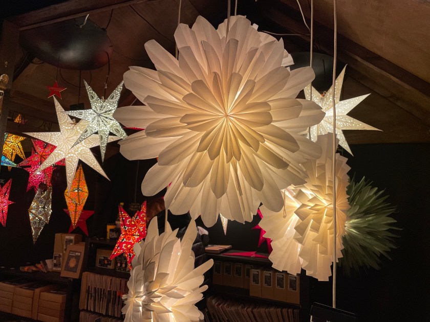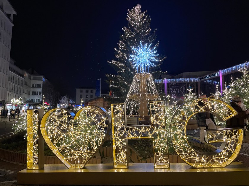 We got off the bus at Luisenstrasse, the walking promenade that leads to the castle and the Christmas Market area. The whole distance was festive with a few market stalls along the way. At Christmas time in Germany, the shop windows are decorated and beautiful. There are stars and lights in windows. Everything feels festive.