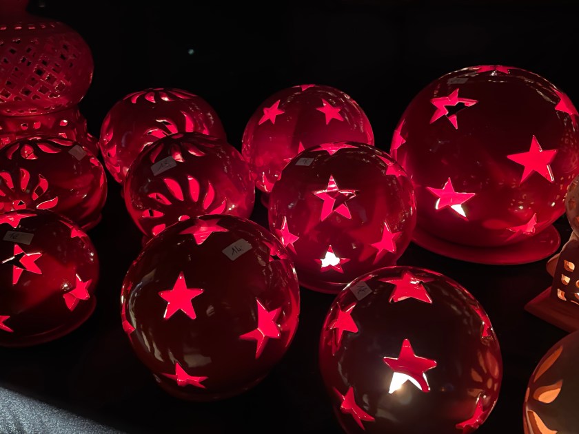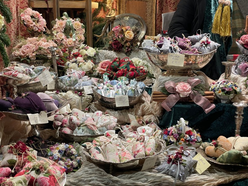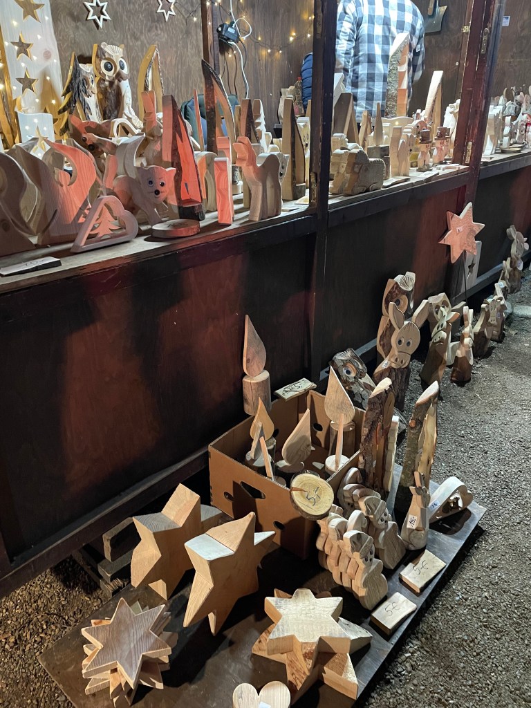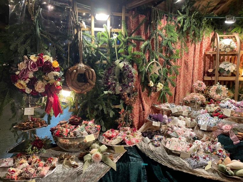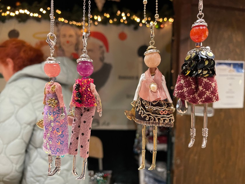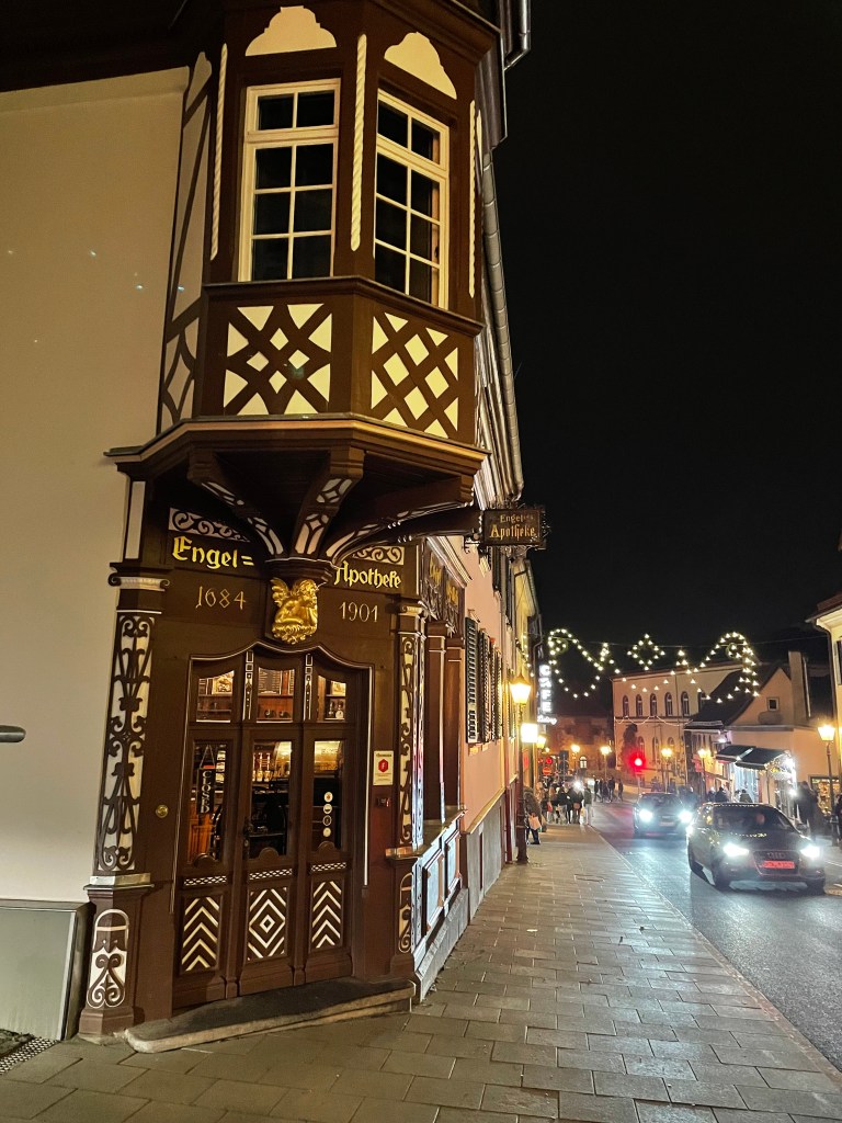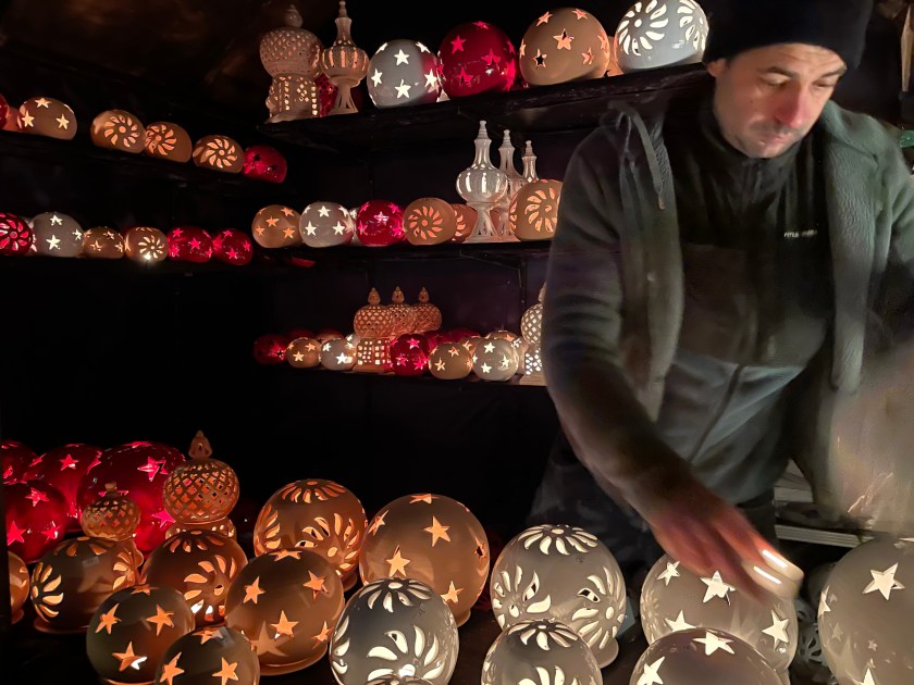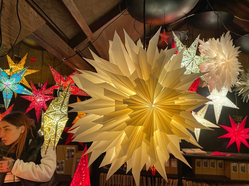We got off the bus at Luisenstrasse, the walking promenade that leads to the castle and the Christmas Market area. The whole distance was festive with a few market stalls along the way. At Christmas time in Germany, the shop windows are decorated and beautiful. There are stars and lights in windows. Everything feels festive.