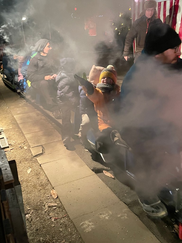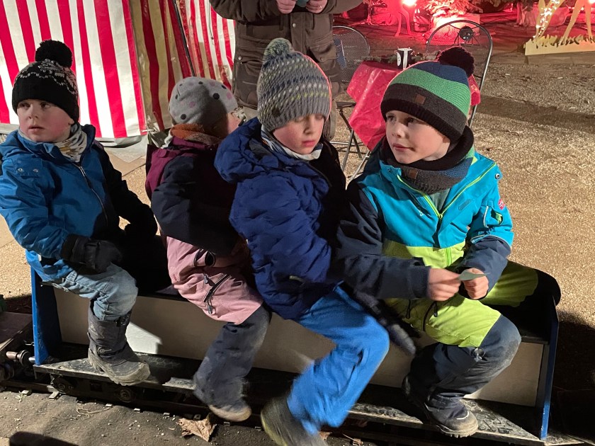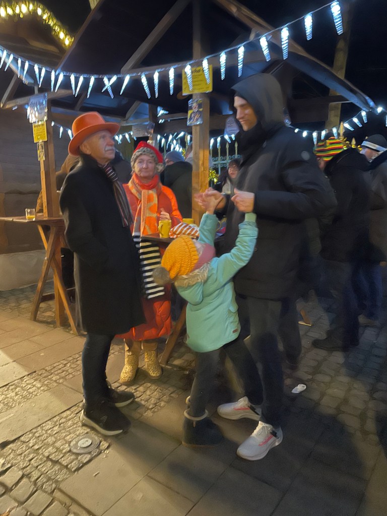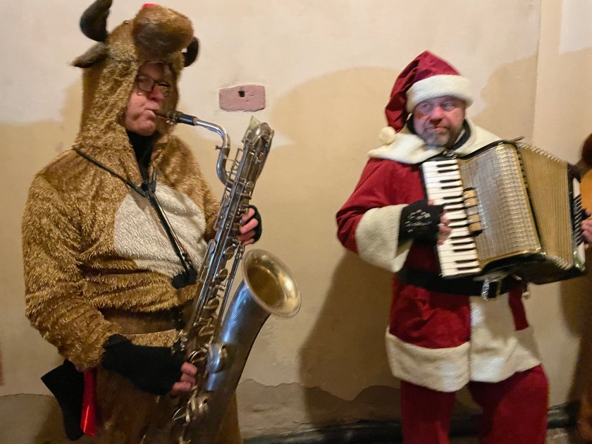 Running into friends –the Wolfert family–and enjoying some Christmas street music!