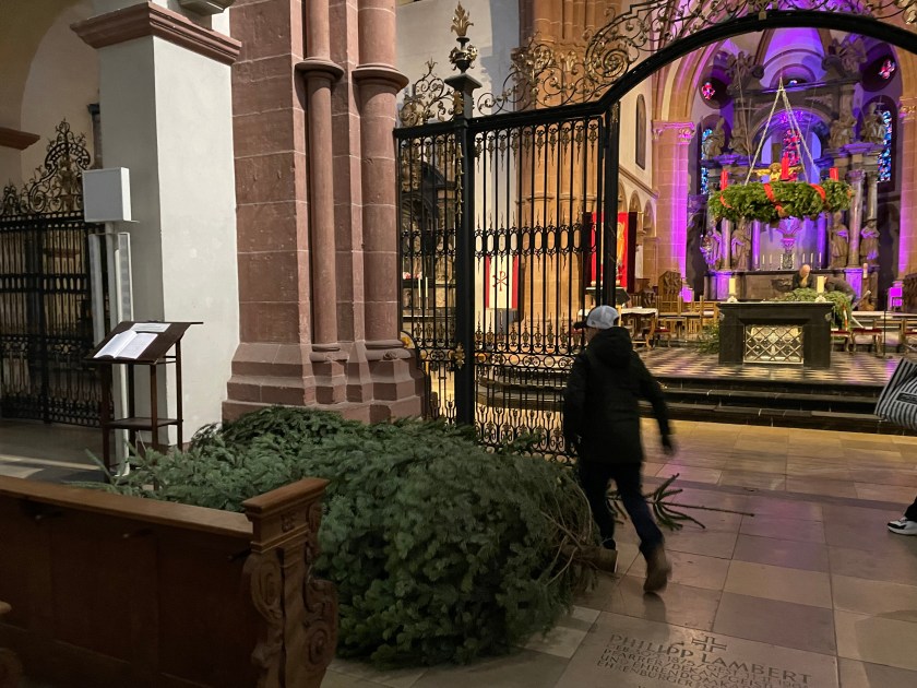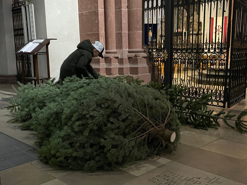 Today we got to watch a father and his son and some other church members setting up the Christmas trees here.