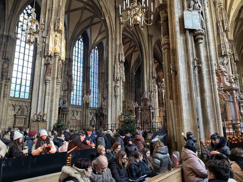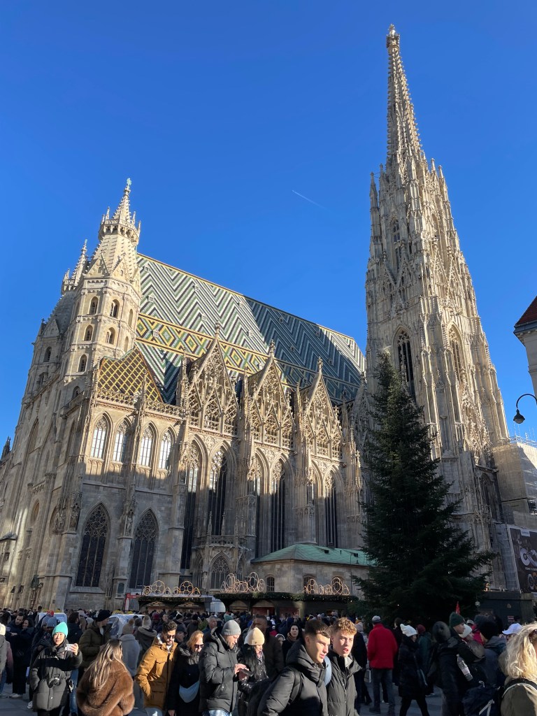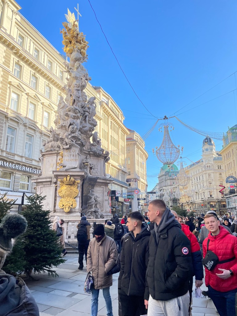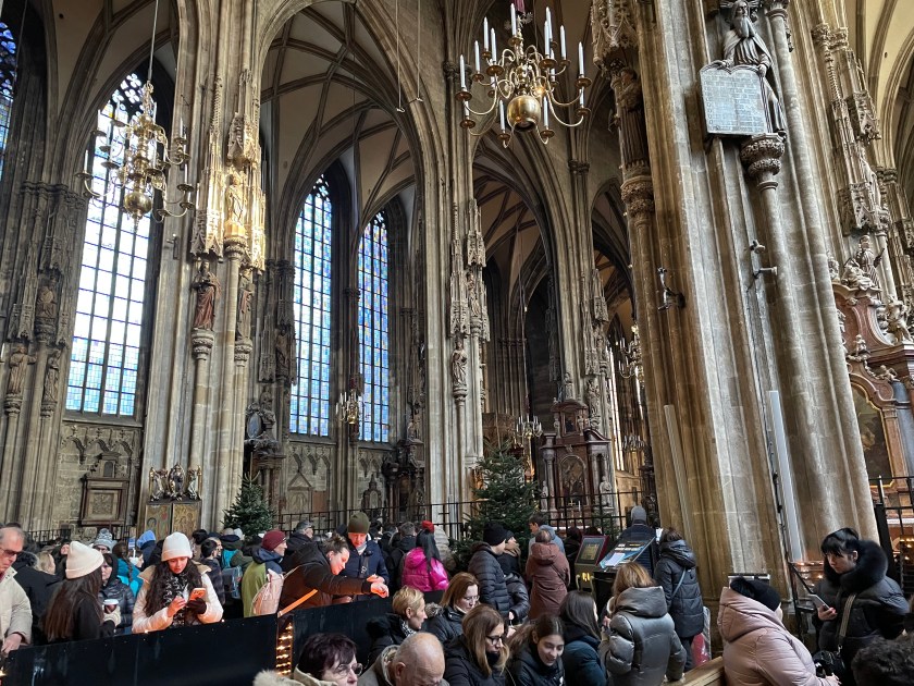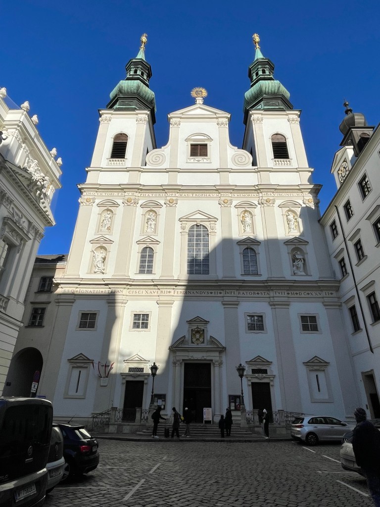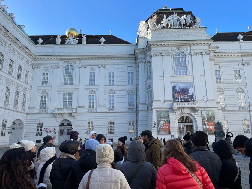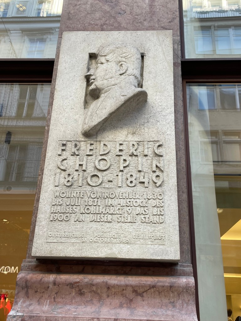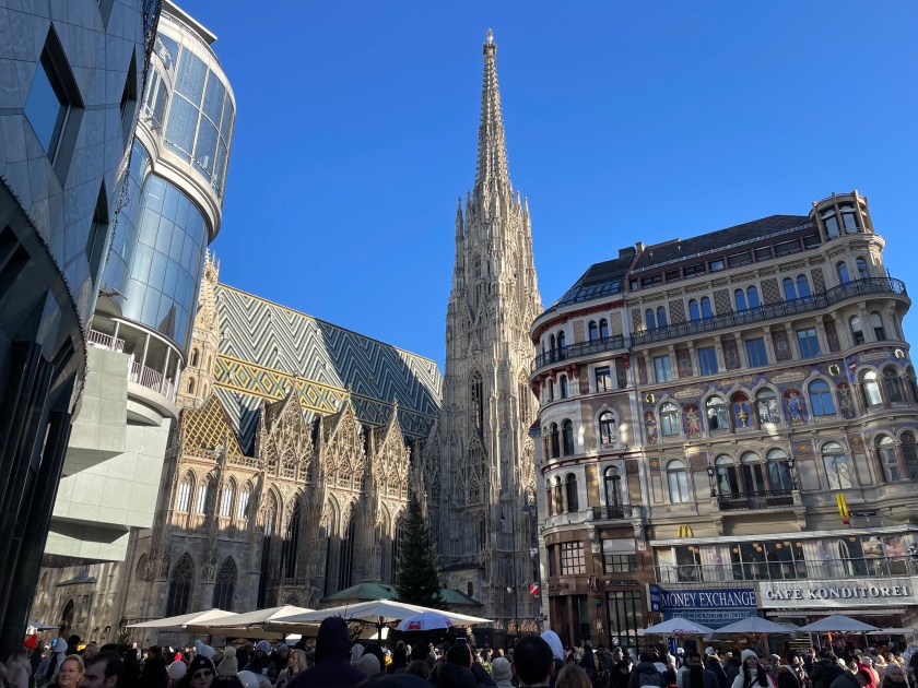 After the Opera House, we learned about Sacher Cakes, the Albertina, the Hofburg (former principal imperial palace of the Habsburg dynasty in Austria, originally built in the 13th C), Emperor Franz Josef I and his wife, Elisabeth (Sisi), the Spanish Lipizzaner stallions, the very expensive Kohlmarkt (where we saw the house where Chopin lived in 1830-1831) and Graben, the statue memorializing the plague, and the Stefansdom exterior.