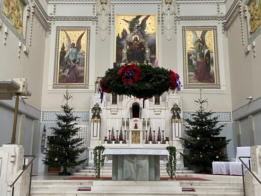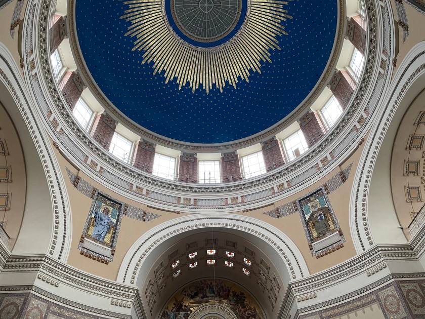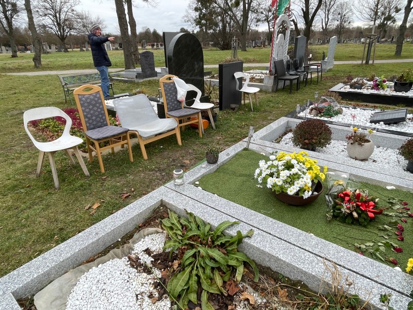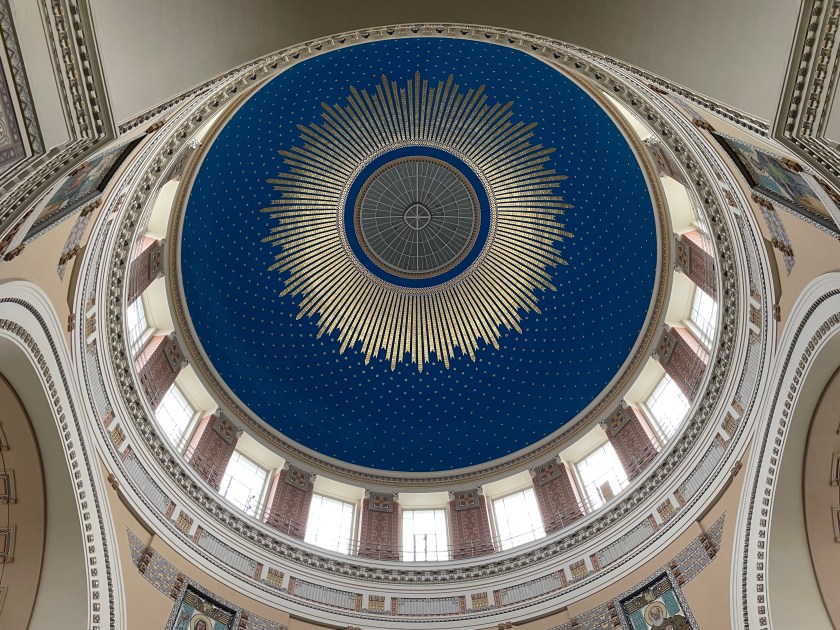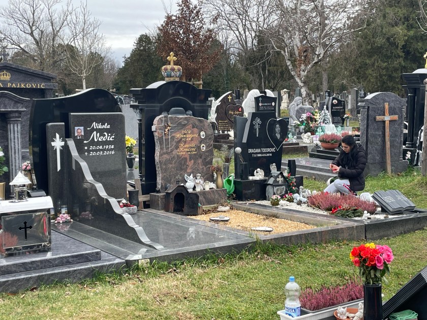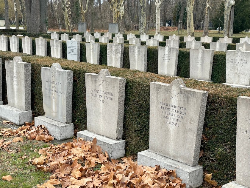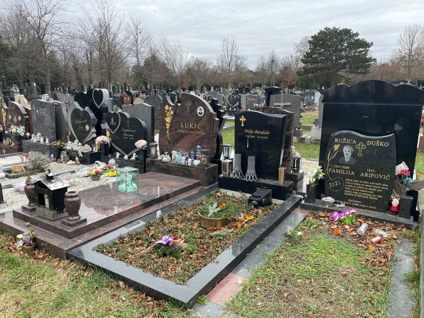 The cemetery was pretty organic (not manicured). Long grass. Most of the more normal stones were dark granite, tall and narrow. Not much statuary or religious markers. The graves were crowded. There were also war sections with rows and rows of fallen soldiers. One section was all Russian soldiers. The Jewish section had Holocaust victims, row after row. There is a wooded area for scattering ashes. There is a park area for kids to “recreate.” There are deer who live in the cemetery and come out early in the morning or in the evenings. There was a beautiful church–we went in it. Art Nouveau. Important people have funerals there. The presidents of Austria are buried here. Lots of history all in this place. Signe said she loves thinking about the stories of each person. Sometimes she sees an interesting stone in the famous people sections, then looks up the person to see what they did. She’s gotten to know many of them and she has her favorites.