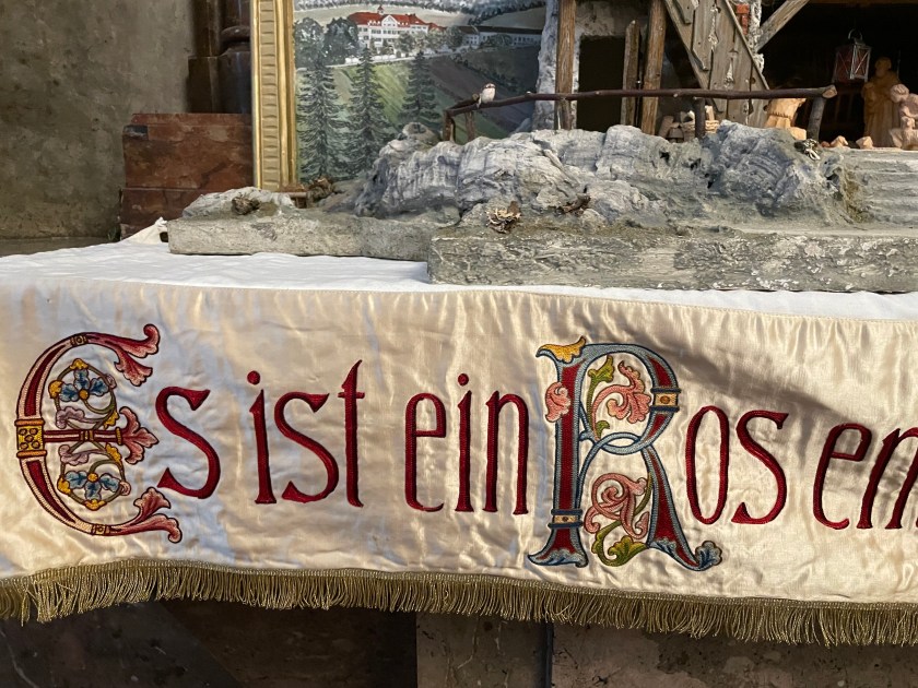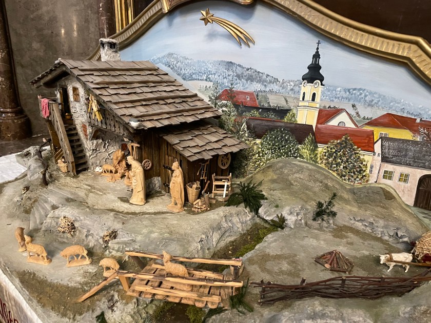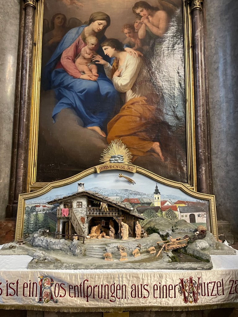 The music for the mass was from Haydn–his St Nicholai written for Dec 6th in 1772. It was really beautiful. After the mass and sacrament had ended (about an hour), the choir above sang Stille Nacht and then the organist played a beautiful arrangement of O Come All Ye Faithful (Adeste Fideles). Then we were excused. We lingered to enjoy looking more closely at the church and the Nativity there. It was a really beautiful chapel.
