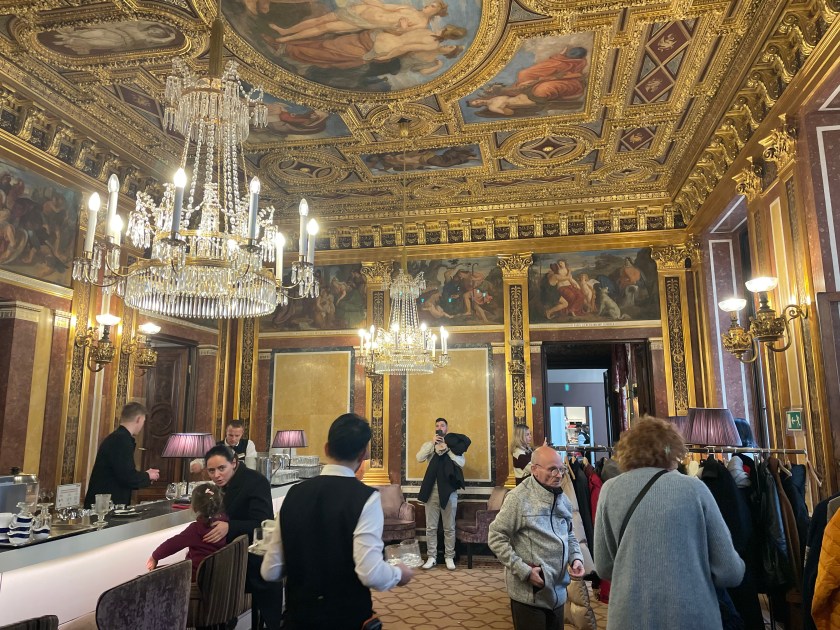 Gerster’s coffee shop is one of those kinds of places. A “must visit” according to the tourist books. Austria is known for its coffee house or cafe culture. We decided to pop our heads into Gerster’s, a very historic coffee house, just to have a look around. We were told these historic cafes are beautiful inside.