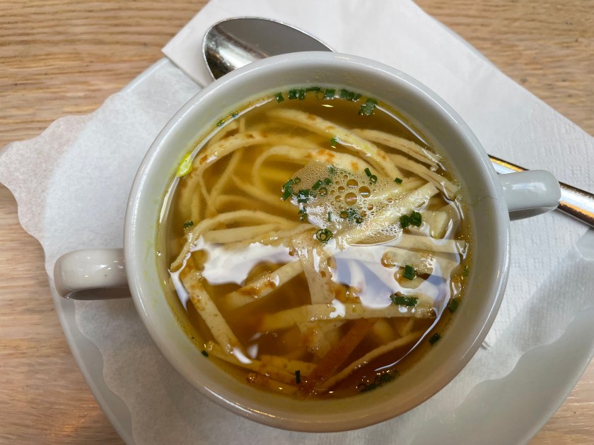 Instead of this hoity toity cafe house, we found a little local restaurant and we each had a bowl of soup. I had chicken broth with a cut pancake (my Grandma used to make this) and it was delicious.