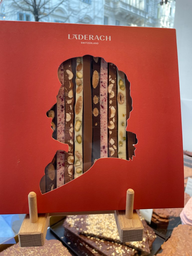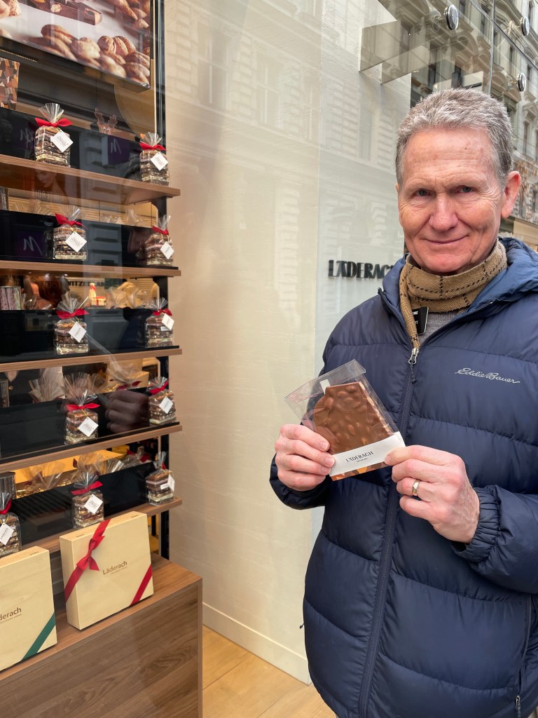 John will not walk quickly by a chocolate shop. This shop has some of his favorite Swiss chocolate.
