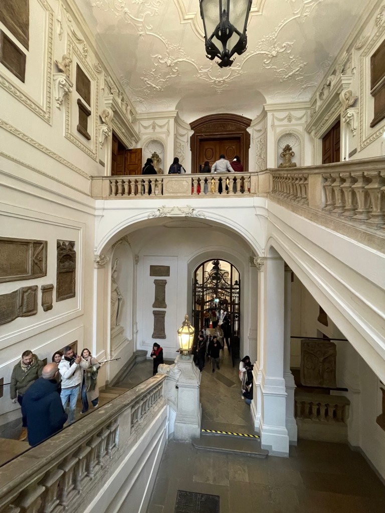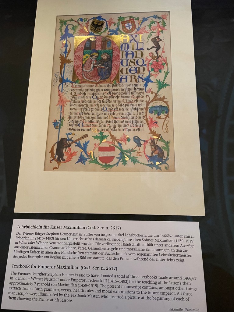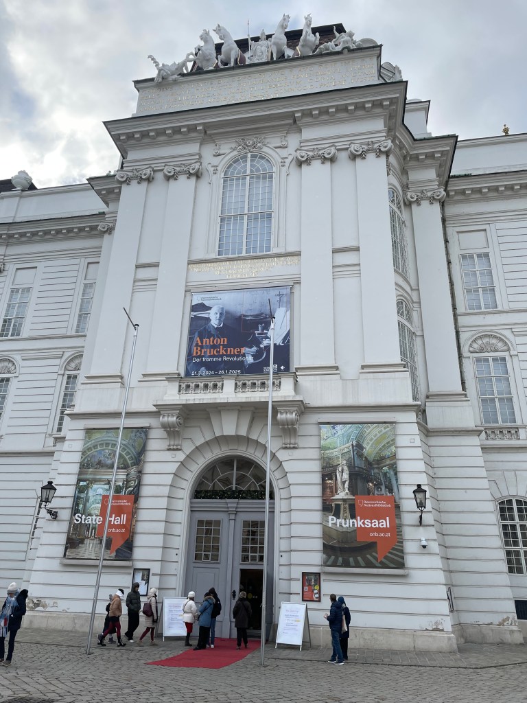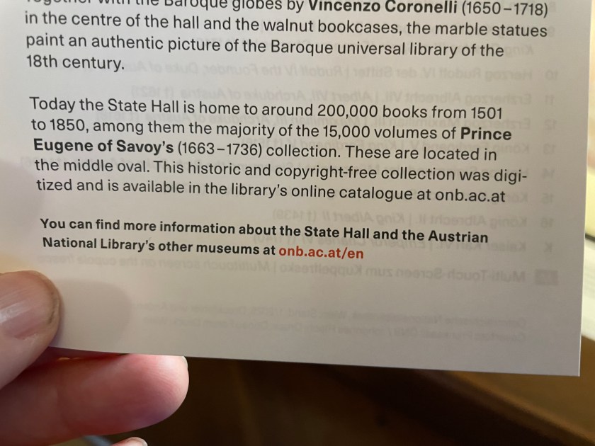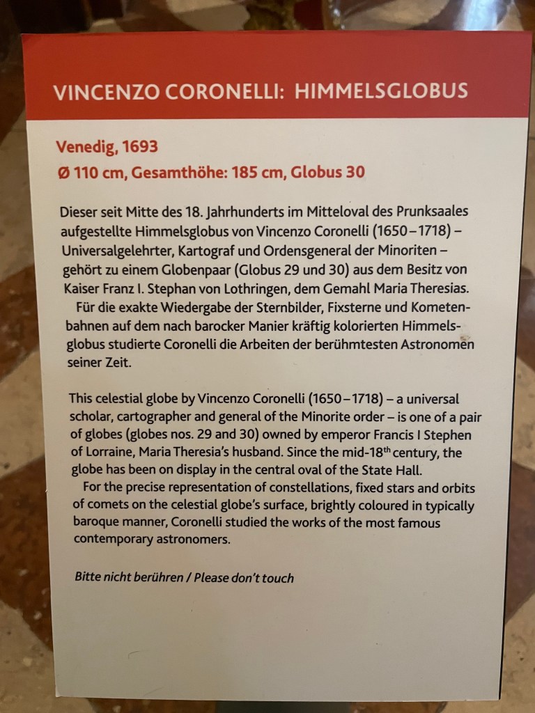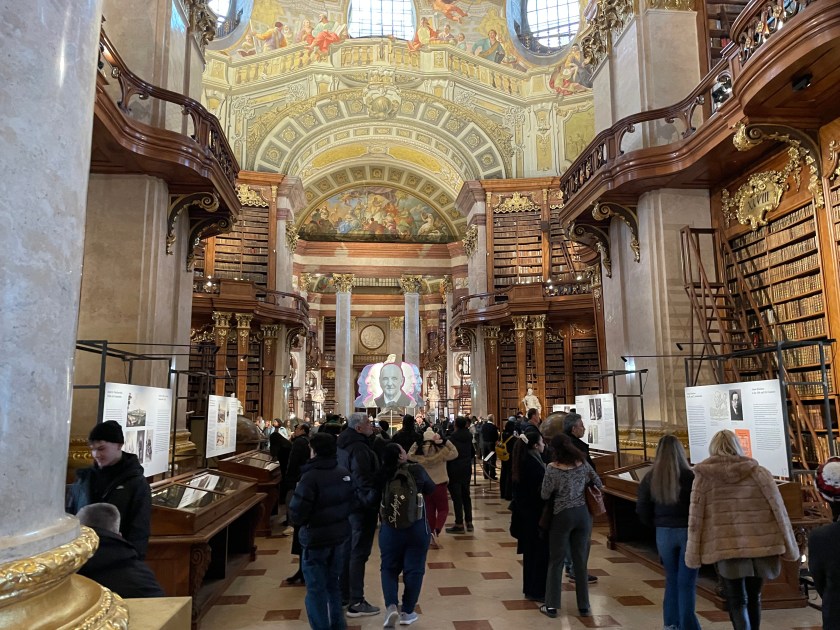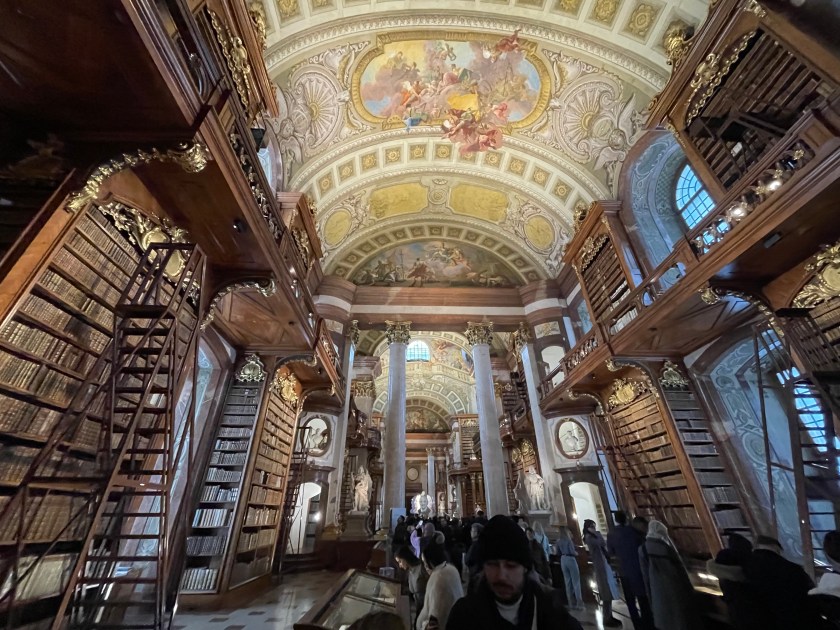 After attending Christmas Mass, we went to the National Bibliotek (library). We were told not to miss it. (8 Euro Sr Citizen price.) We went up a floor and then into a huge hall that ran the length of the building. It looked like the library in Beauty and the Beast. It was incredible, floor to ceiling OLD large brown books. The Library was built by Emporer Karl VI. Built from 1723-1726.