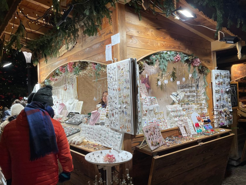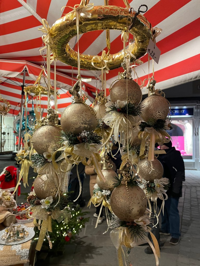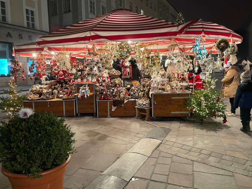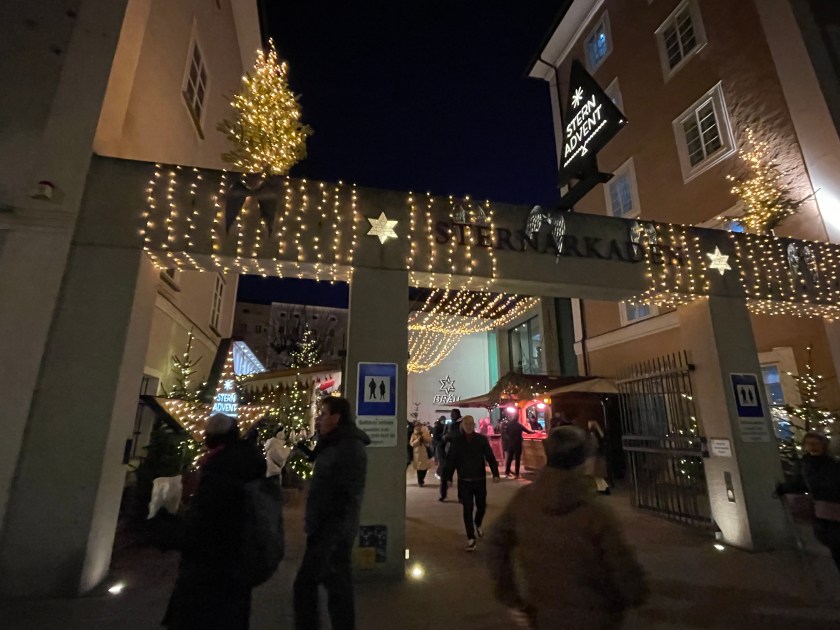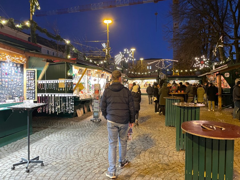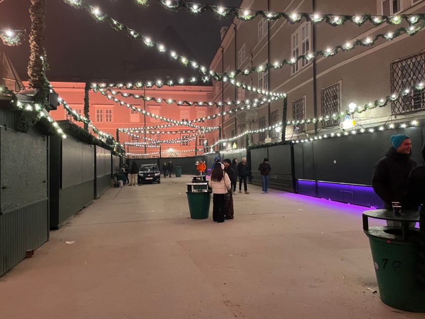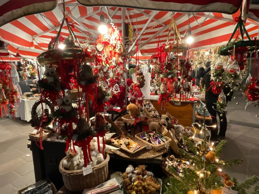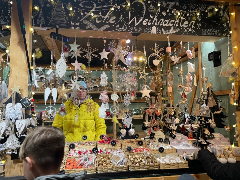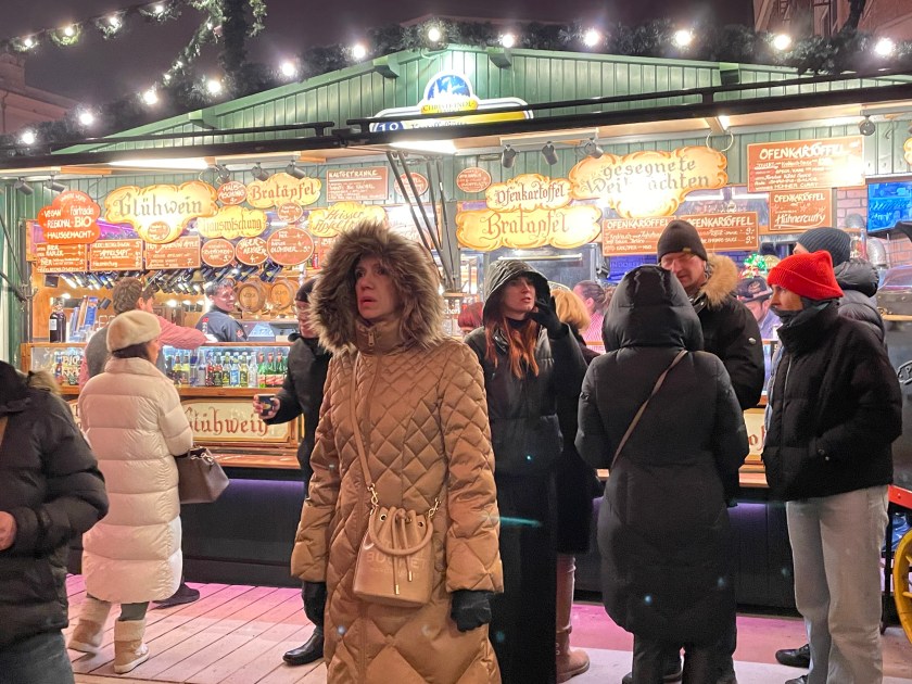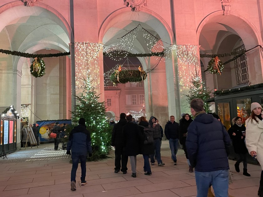 After checking in to the Grand Sheraton, we set out to see the city by night. What do you know–there are MORE CHRISTMAS MARKETS HERE. They are around every corner! We walked through this small one on our way into the heart of town. I haven’t gotten tired of the markets.