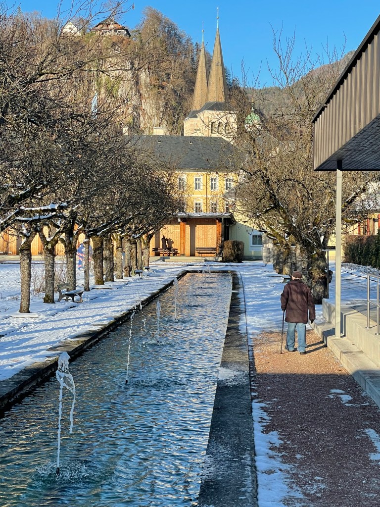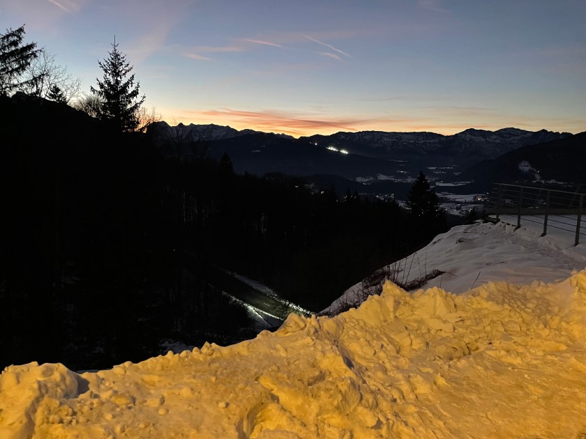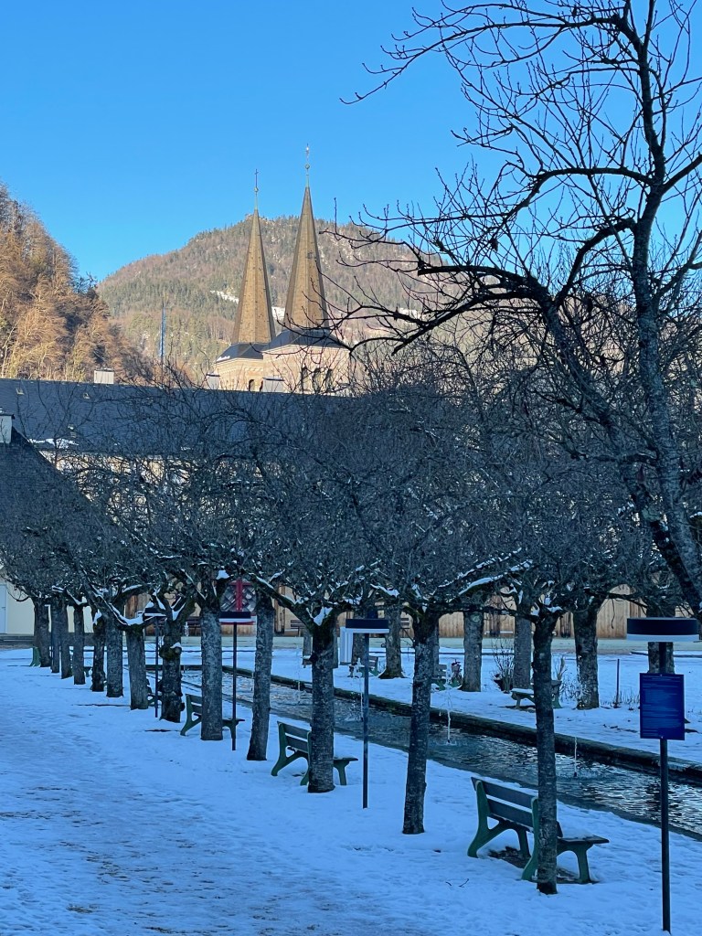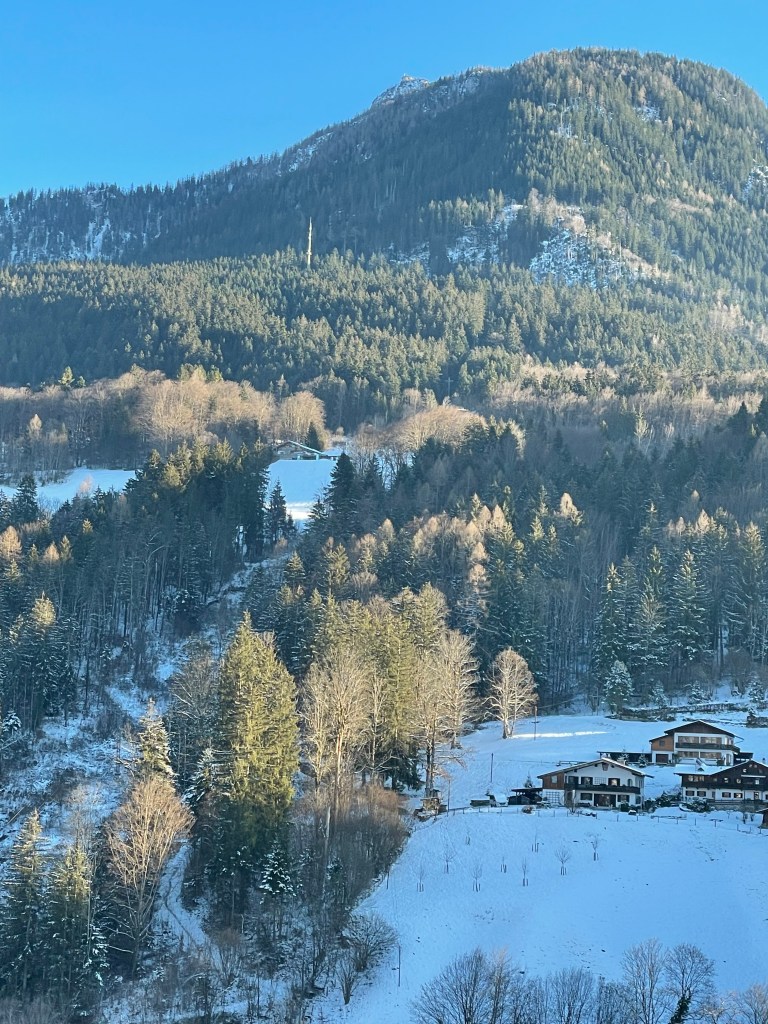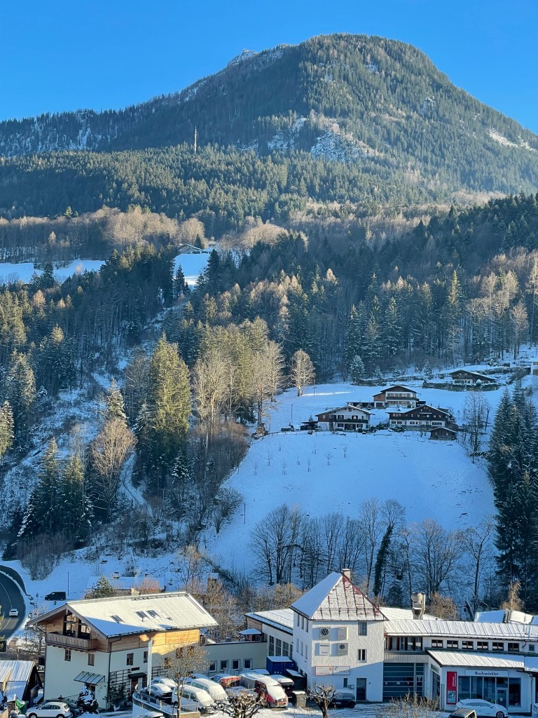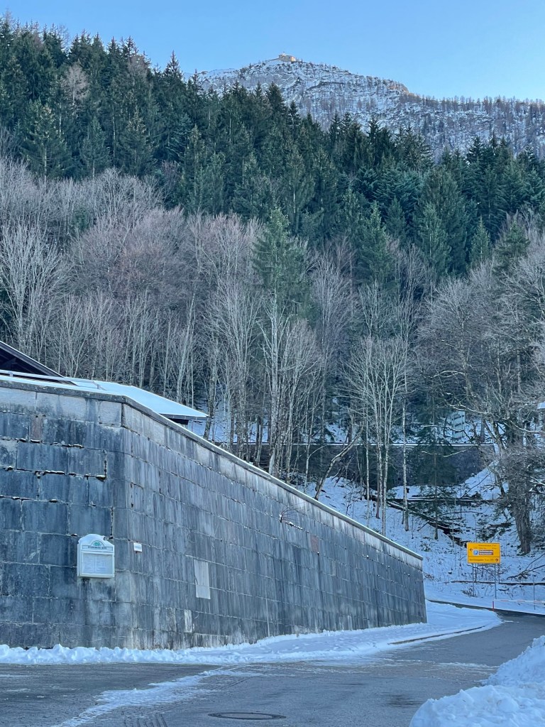 After seeing Berchtesgaden, we found a place from which we could look up the mountain to see the Eagle’s Next perched high on top. There is no way to get to it in the winter. In the photos below, it’s the little bump in the top center of the skyline.