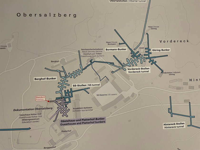 We were a little confused about the difference between The Eagle’s Nest and Berghof. Berghof on the Obersalzberg mountain,was Hitler’s summer home and eventual HQ of the NAZI movement (or one of them), NOT the Eagle’s Nest (Kehlsteinhaus) at the top of the Obersalzberg mountain. The Berghof was lower on the mountain (actually just below the Documentation Center) and originally part of a little town that the NAZI party took over and everyone else deserted.