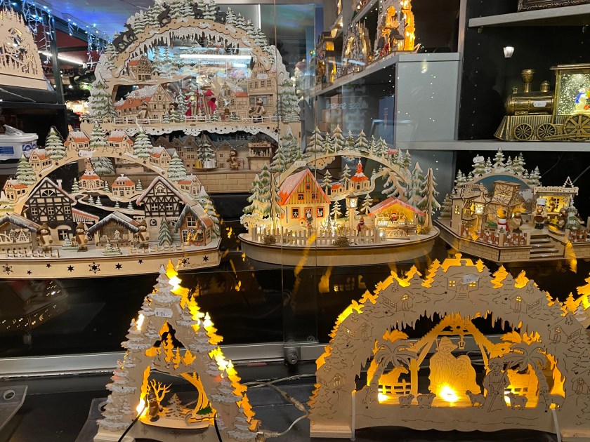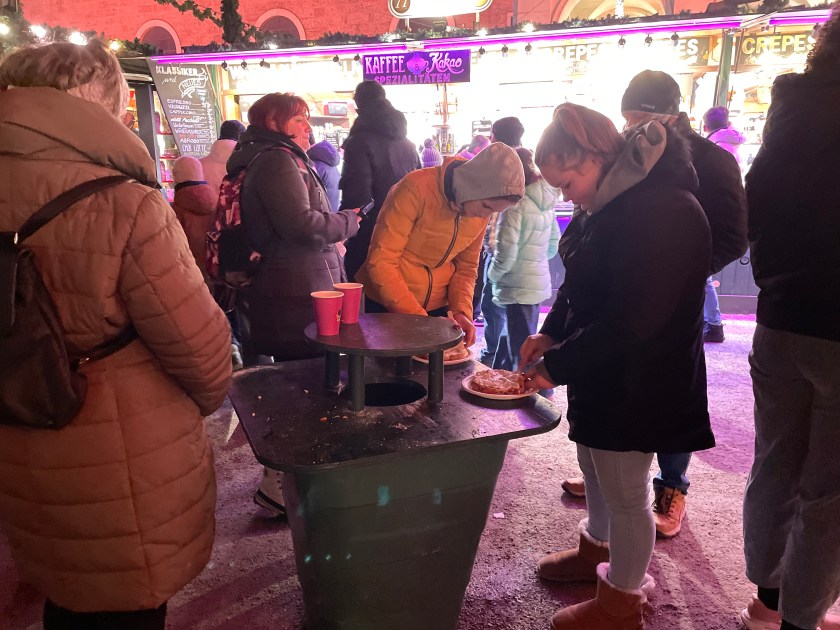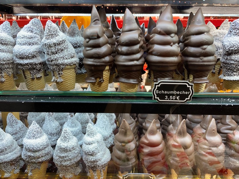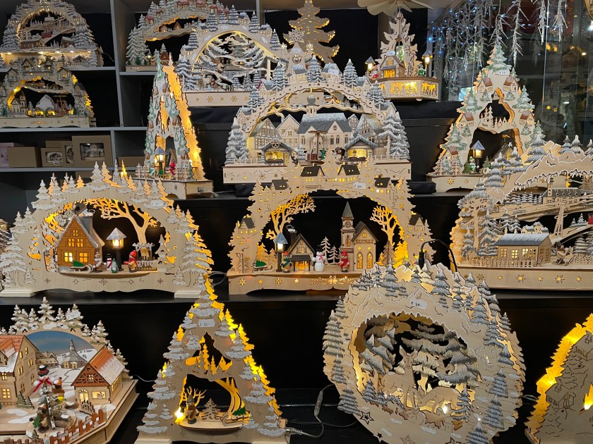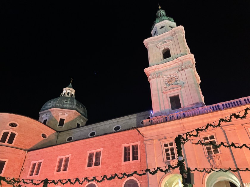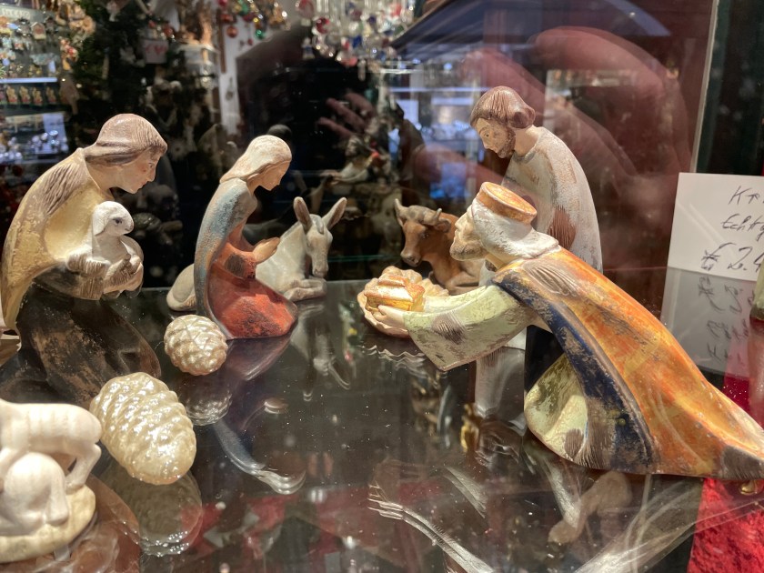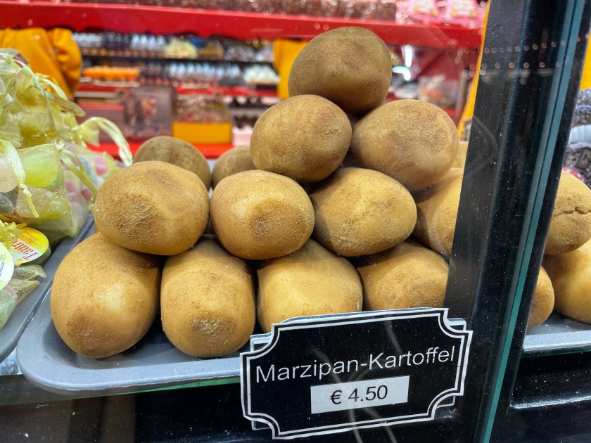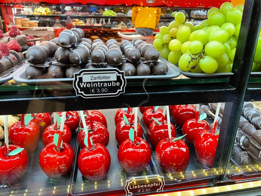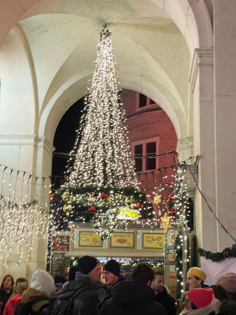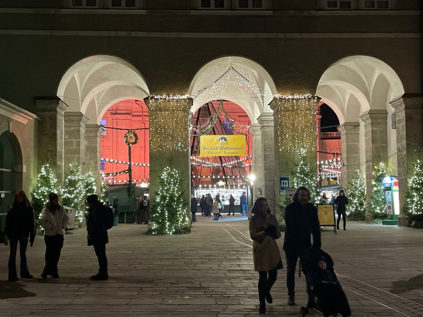 Next to the Residenz Market. Something magical happened while we were in this market–music started floating over us from three different church bell towers. There were brass musicians playing Christmas carols, one after the next, from the church towers. We learned it’s called “Trumblasen” (tower blowing).