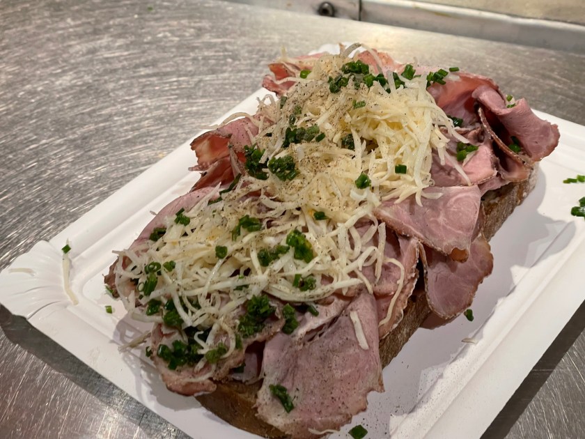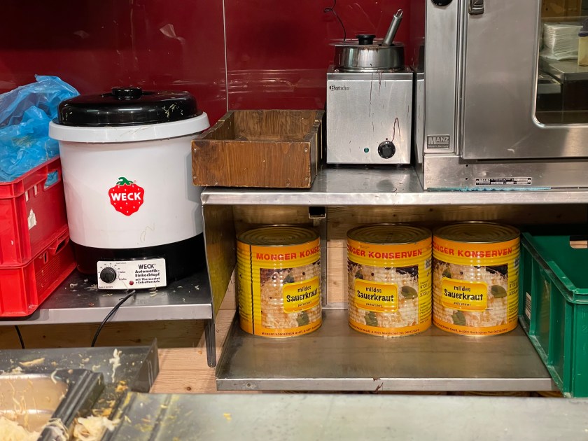 Seemed that one of the more popular versions was a scone topped with Sauerkraut. In the pic above you can see huge tins of sauerkraut.