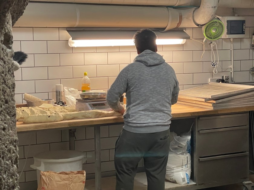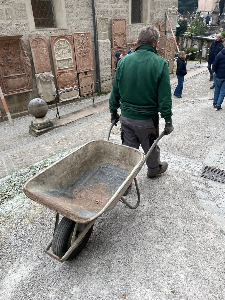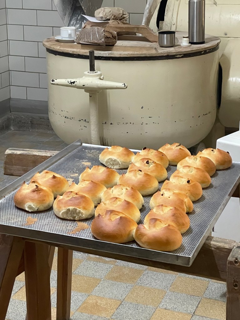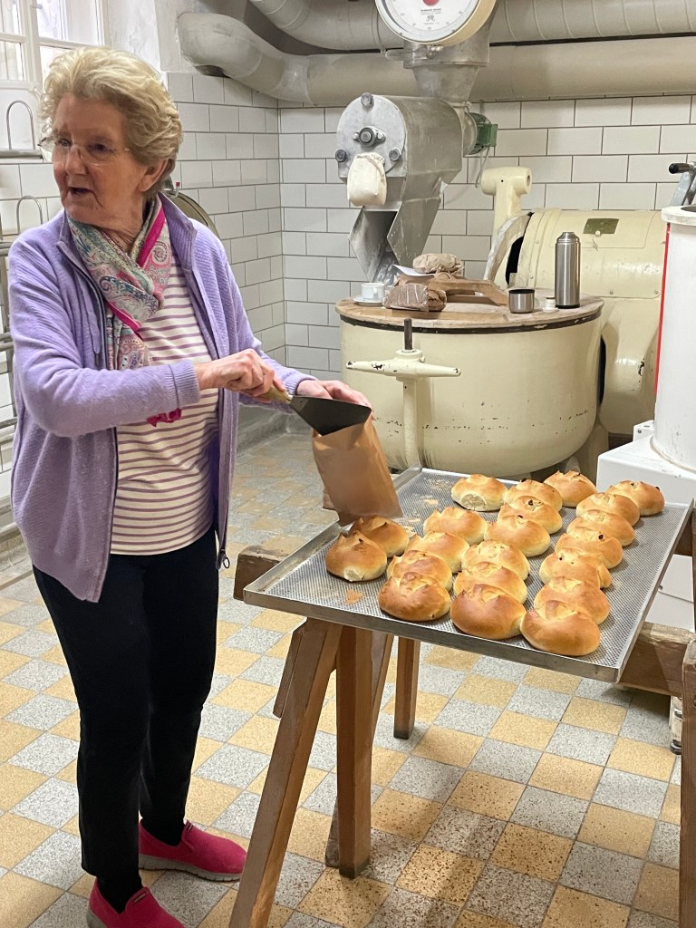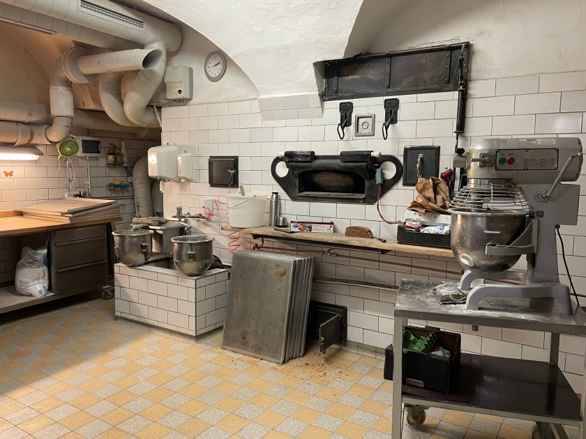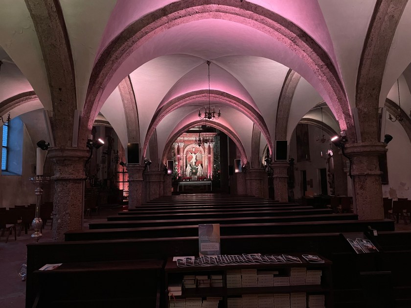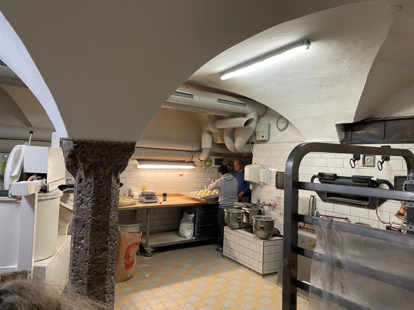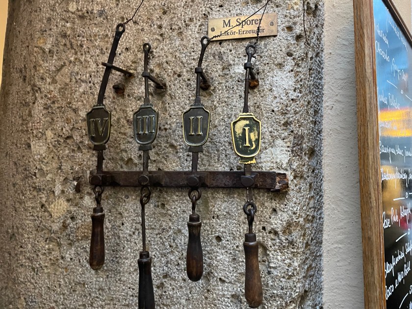 We had 2 bakeries on our list today. This is Salzburg’s Oldest Bakery–more than 800 years old! It was by the watermill. You could smell the bread baking from outside. We got in the line to go down into the old bakery. They showed a video of the bread making on a wall as we stood in line. They still make the old style dark bread made with a sourdough starter, and rye. Just three ingredients. When we got to the counter, they’d just brought a big pan of white bread rolls out of the oven. They were piping hot. We bought 2 for 3,40. Oh, so good. Warmed us.