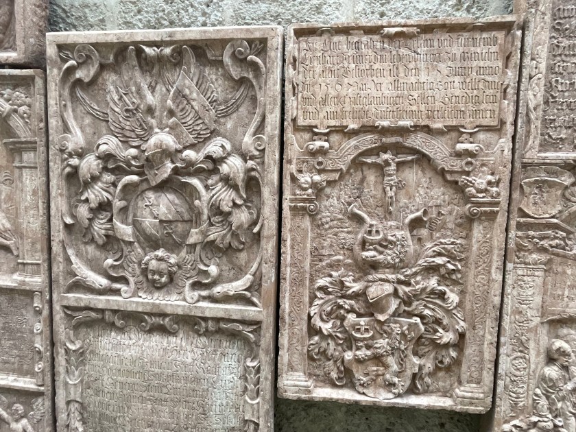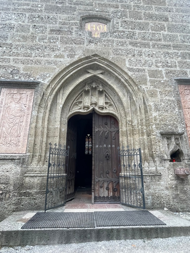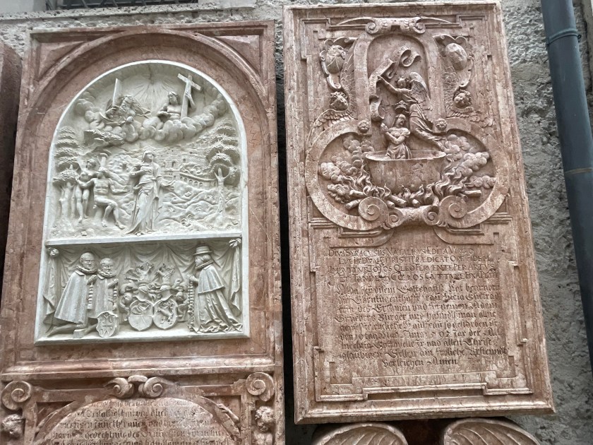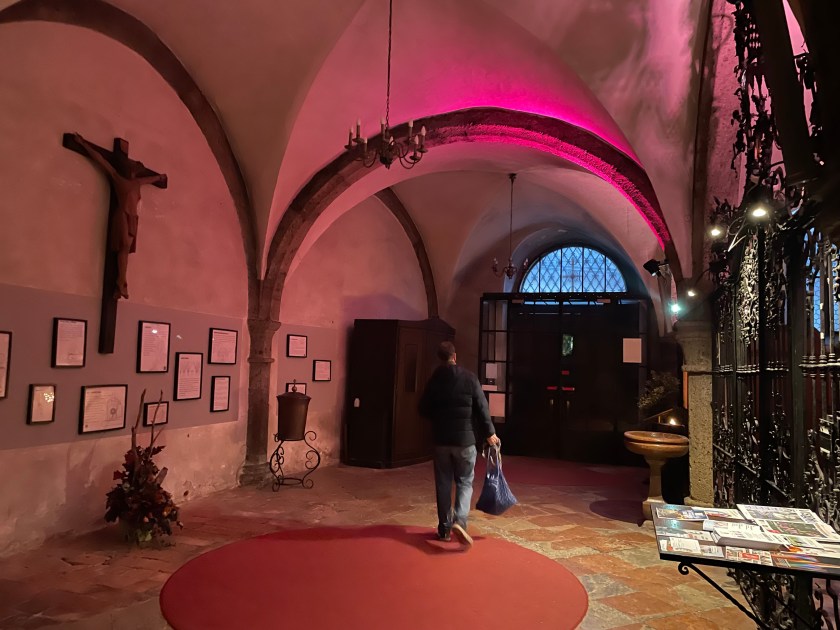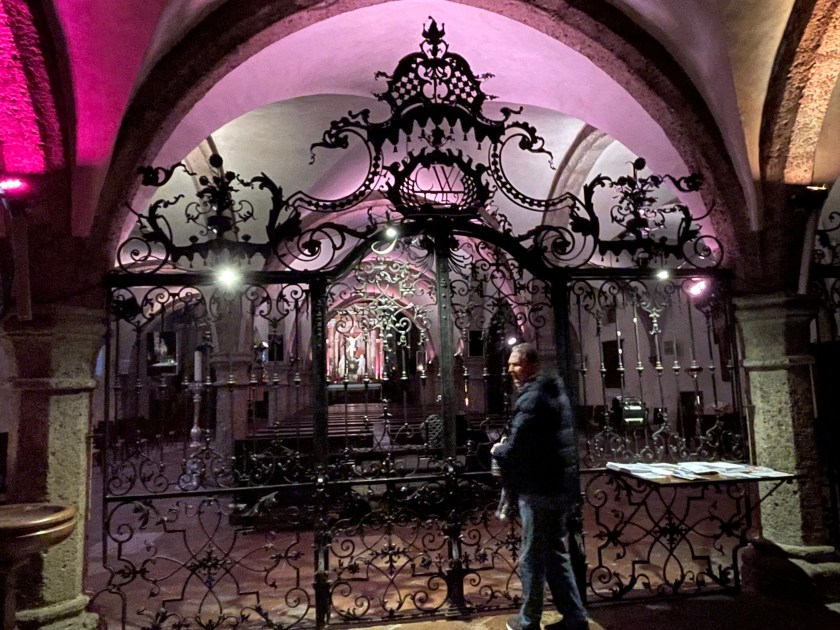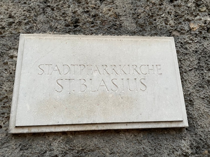 At the end of the street we went into the very old Stadtpfarrkirche. It was gated inside, so you could only look in on the chapel. The gate was intricate and beautiful. We do not tire of seeing inside all these churches.