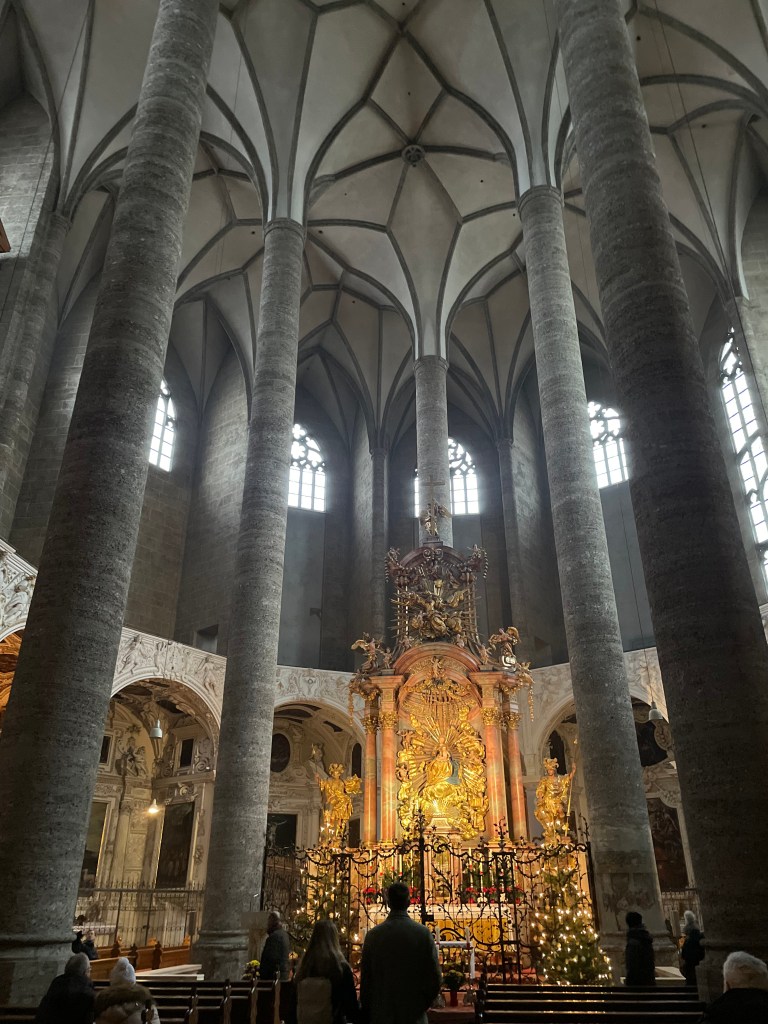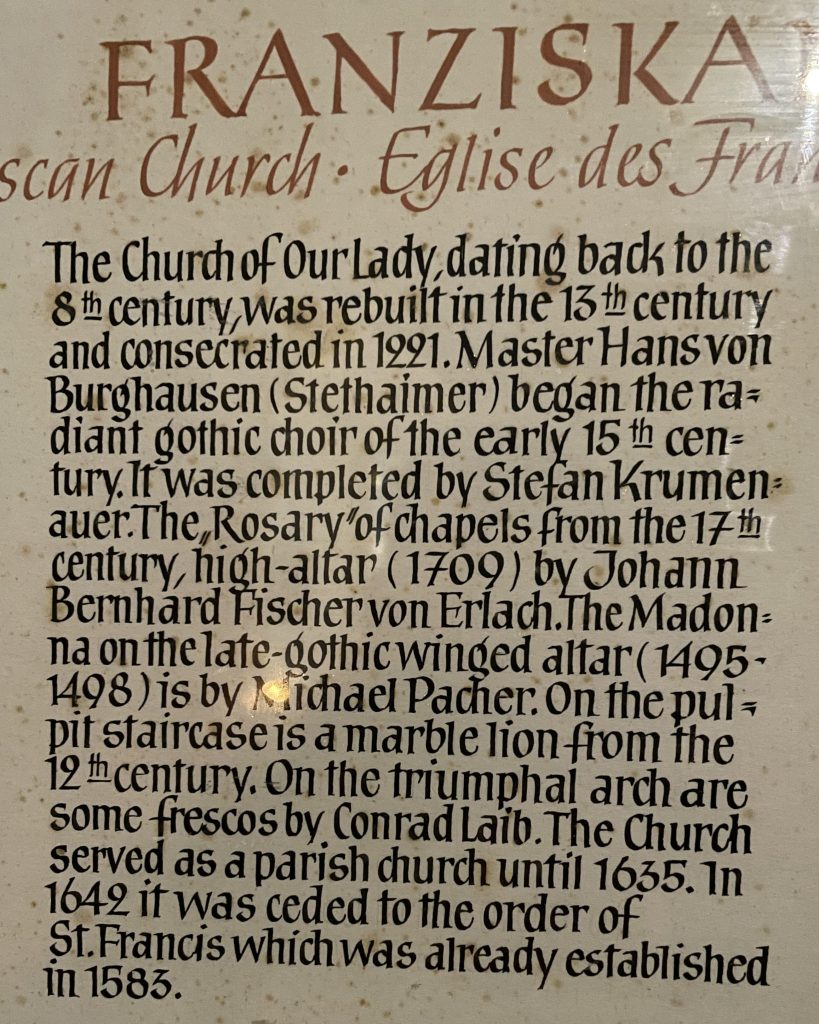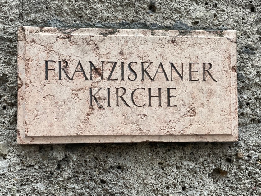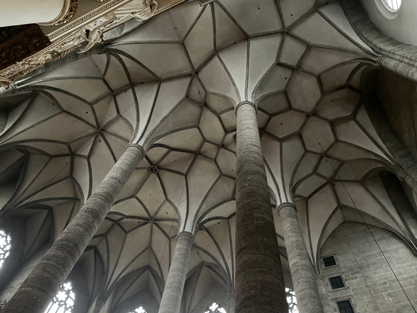 Then we went to the Franziskaner Kirche, another one not far away that we’d not gone into yet. It was first built in the 8th century, then rebuilt and dedicated in 1221. Spectacular old Gothic, then Baroque added later. The ceiling–Wow!