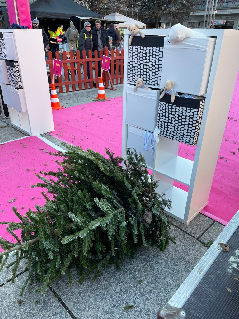Have you ever seen a Christmas Tree Shot Put? This very fun activity was going on in the plaza. I’m calling it “Shot Put Christmas Trees.” They call it “Baumweitwurfmeisterschaft” (tree far throw master). The contest area was laid out like a shot put field (all in pink). The meter distances were marked. Anyone could try. Ikea was a sponsor and the top 3 winners got gift cards for 100, 50 and 20 Euro to Ikea. They had 2 or 3 different size old dead crispy Christmas trees for small, medium and large people to throw like a javelin. It was pretty fun to watch.