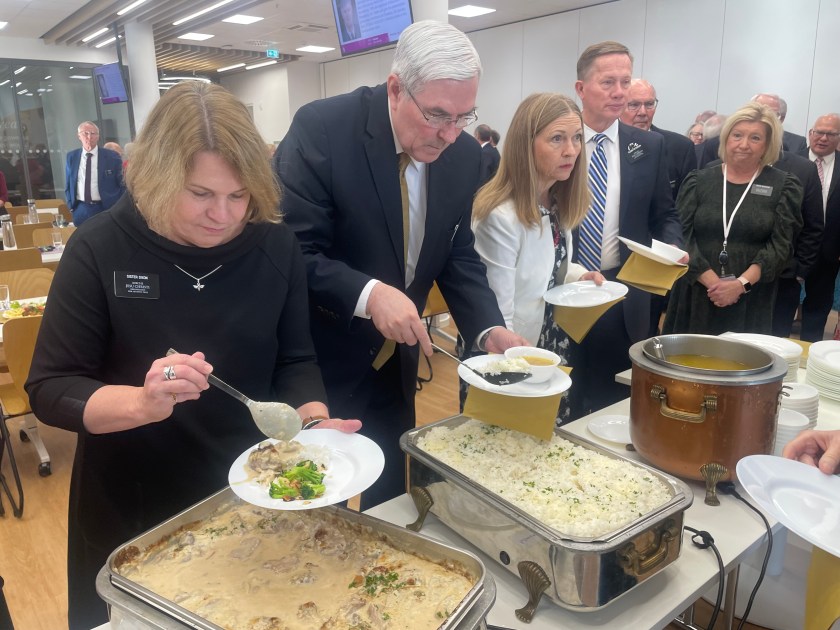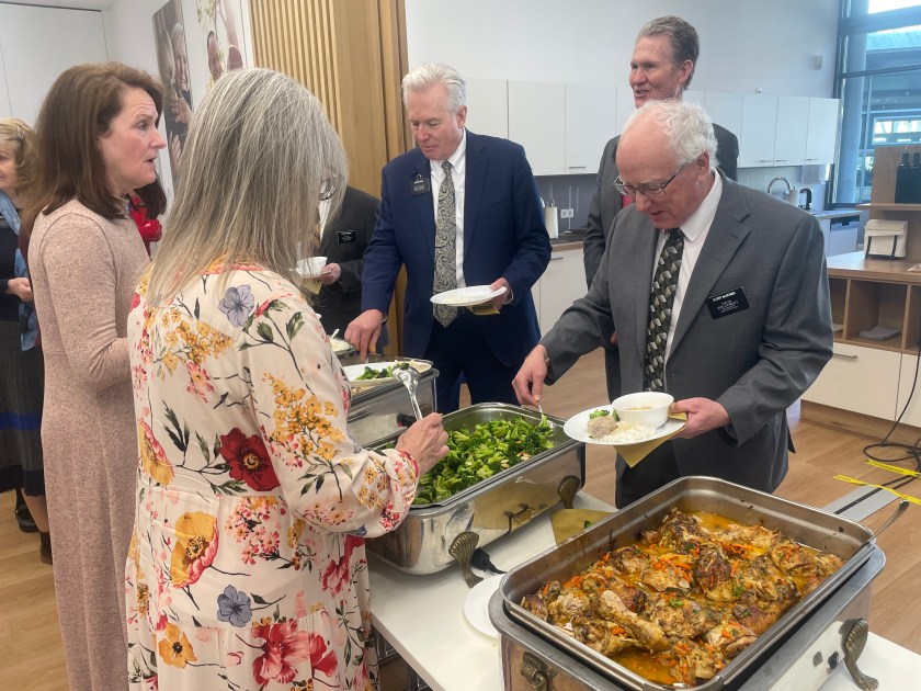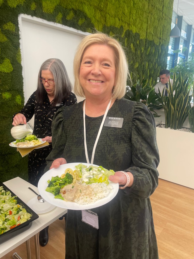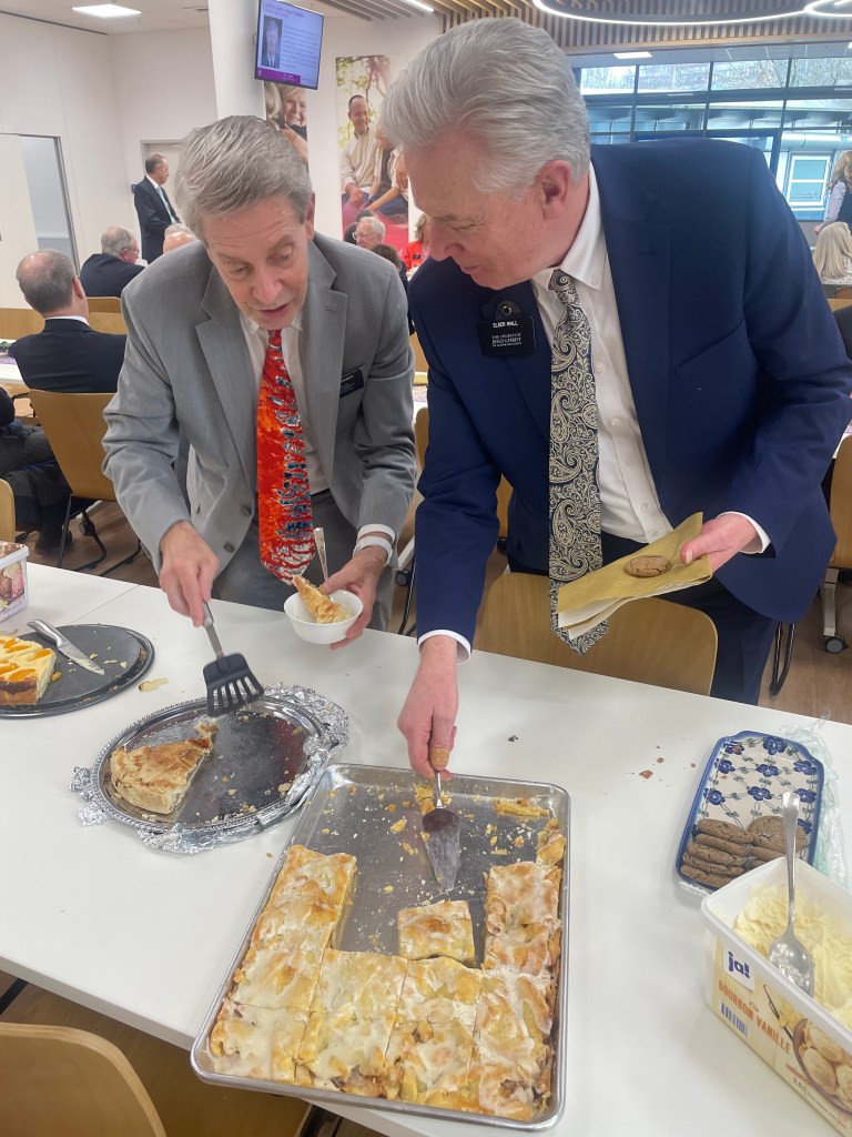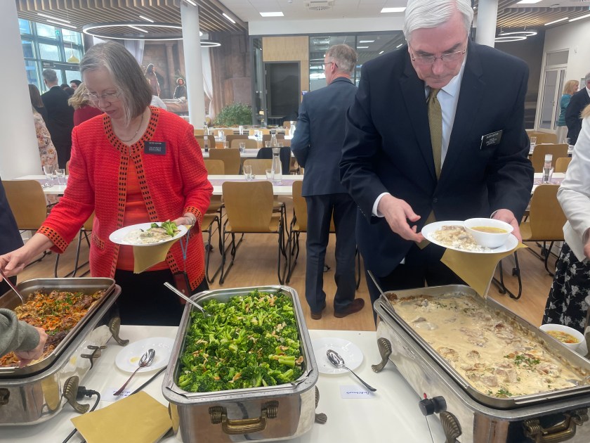 After the meeting we took a group photo, then had a delicious catered lunch. Pork loins in a mushroom sauce, rice, chicken and Spaetzle, broccoli and green salad. Also soup. We had volunteers bring desserts.