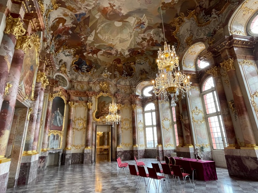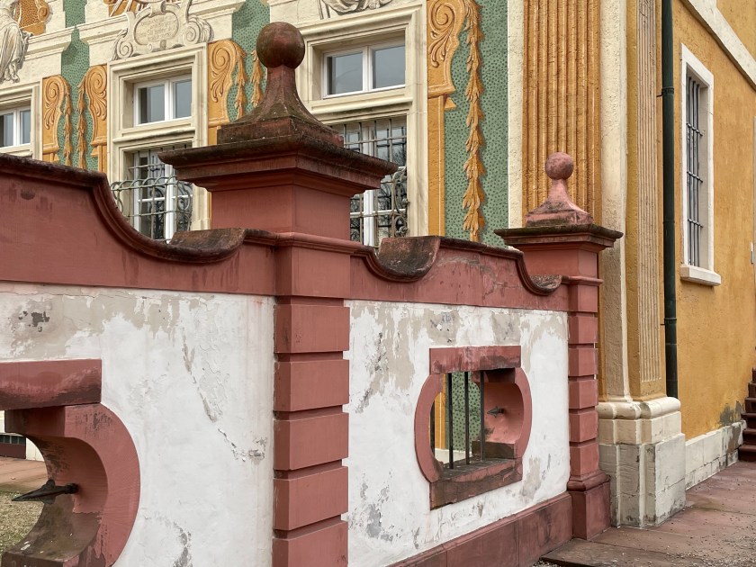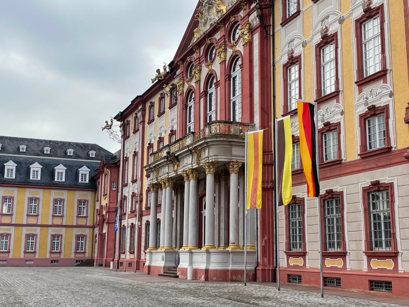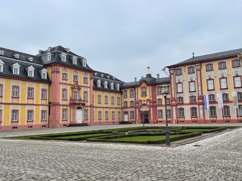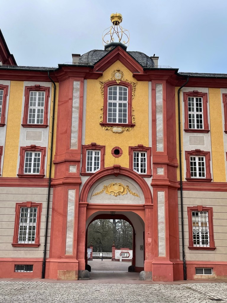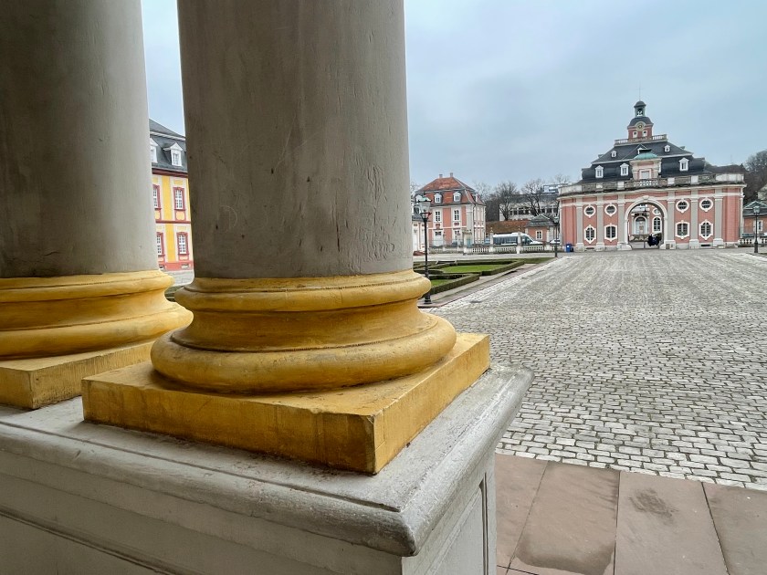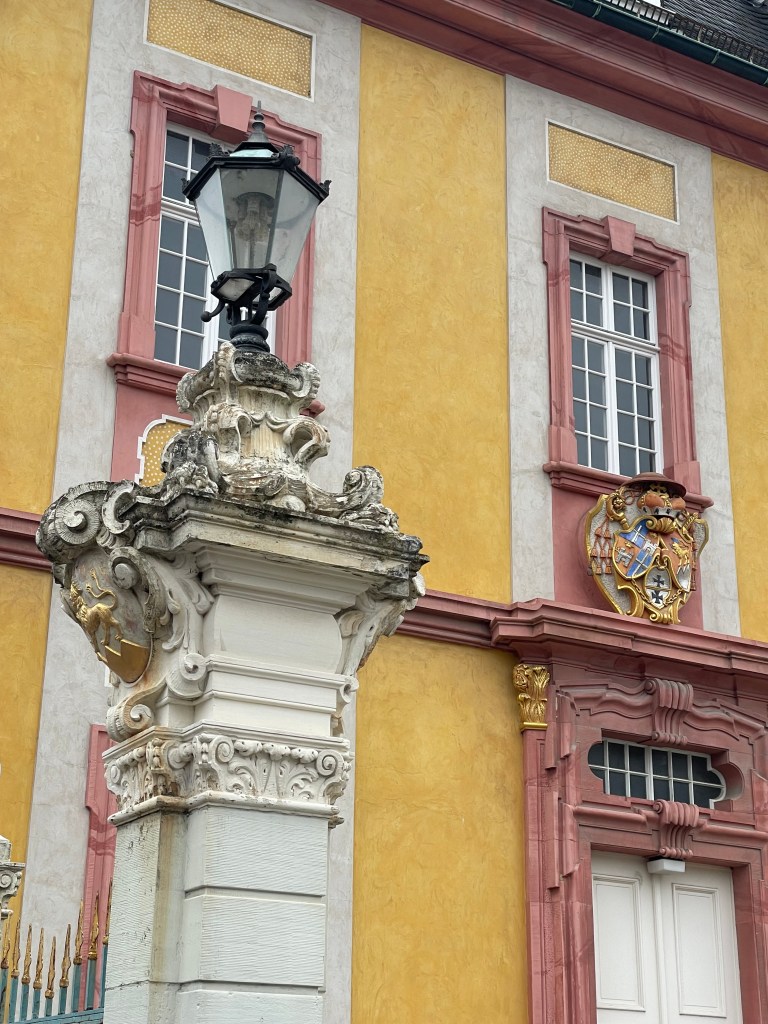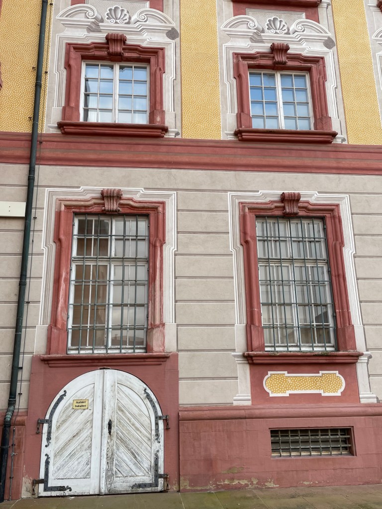 Bruchsal Schloss was our first destination today, about 1.4 hours south of Frankfurt. This is a large castle/palace complex filled with colorful pink and yellow 1700s buildings. Symmetrical, orderly, stately.
