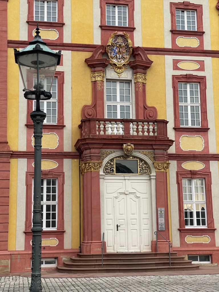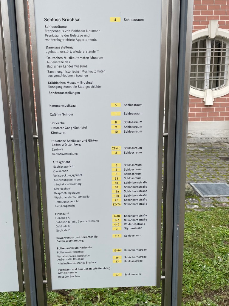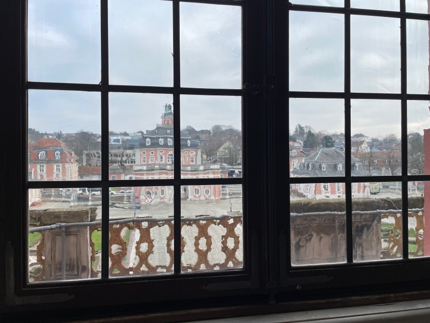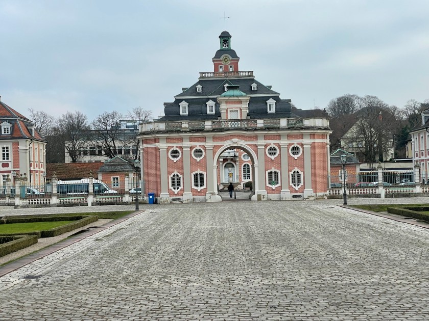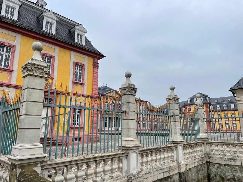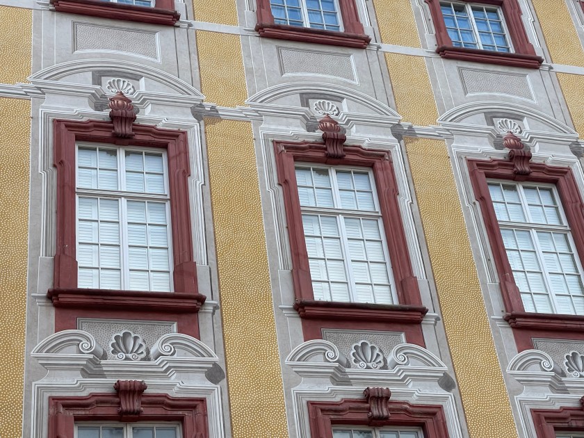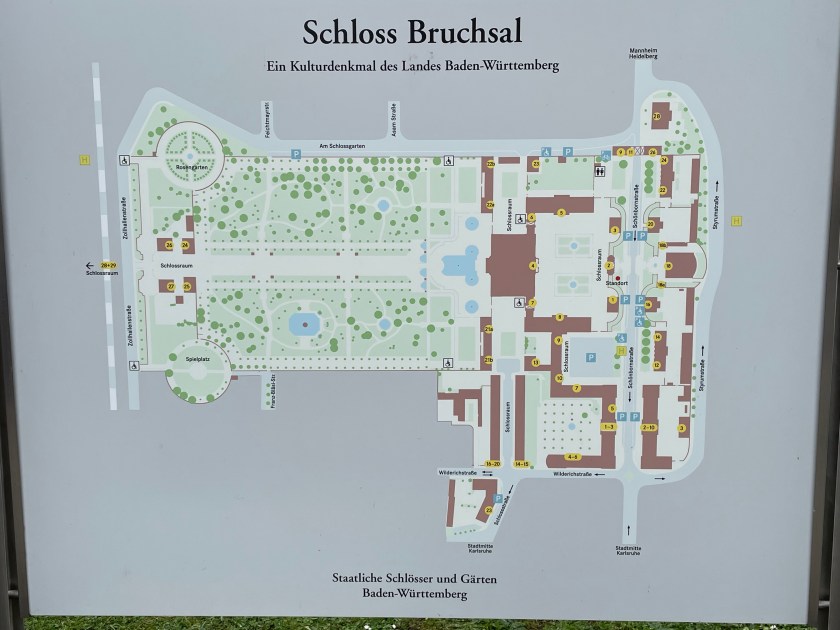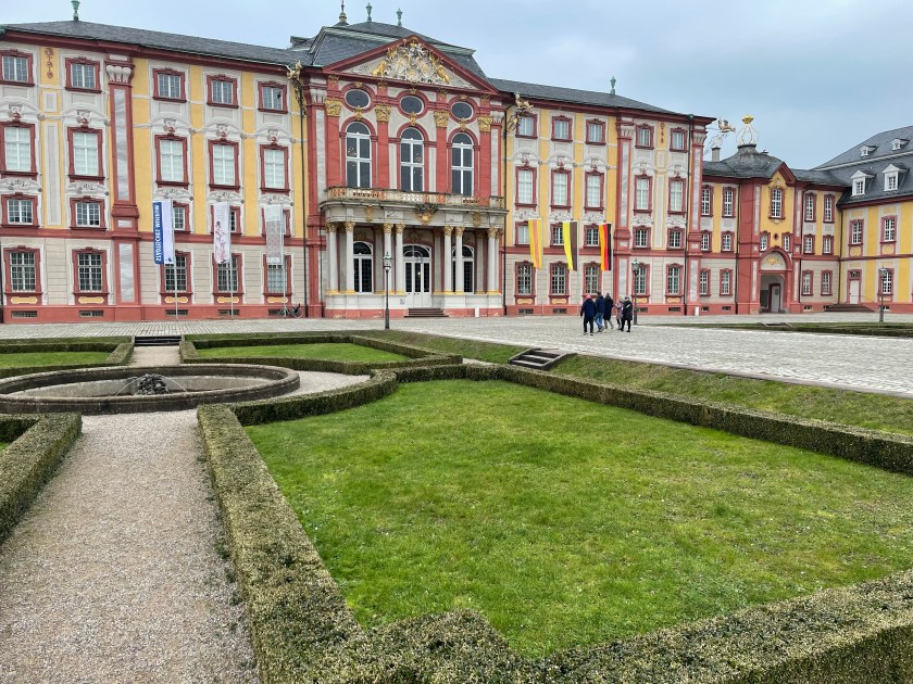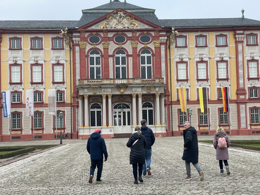 Bruchsal Schloss was our first destination today, about 1.4 hours south of Frankfurt. This is a large castle/palace complex filled with colorful pink and yellow 1700s buildings. Symmetrical, orderly, stately.