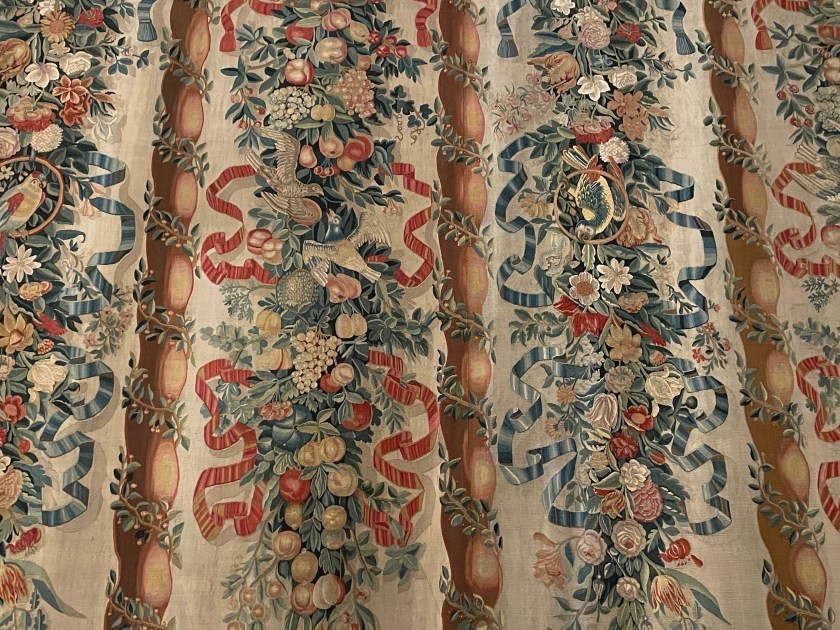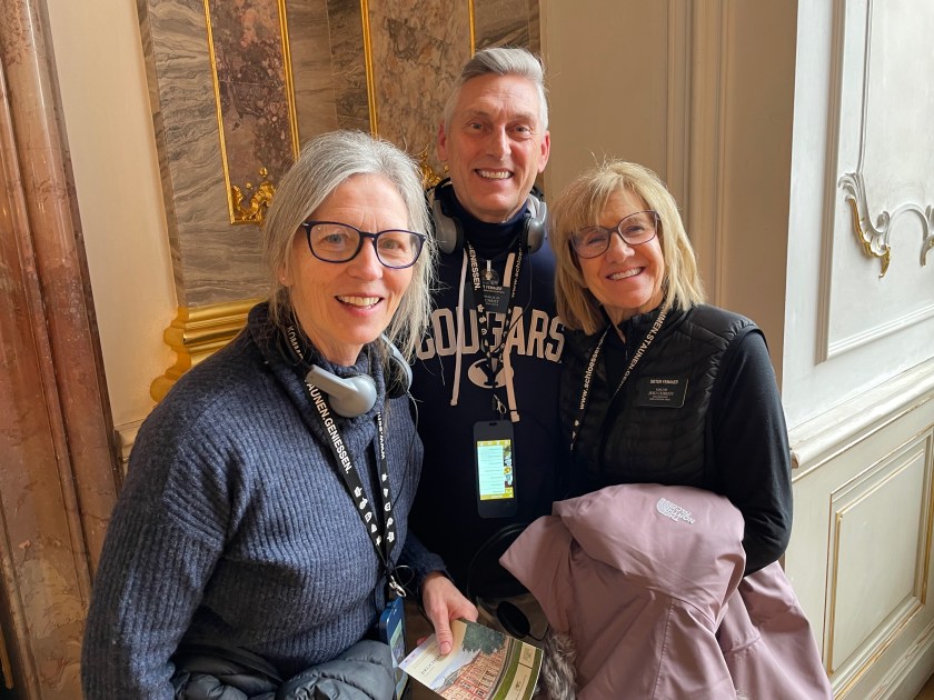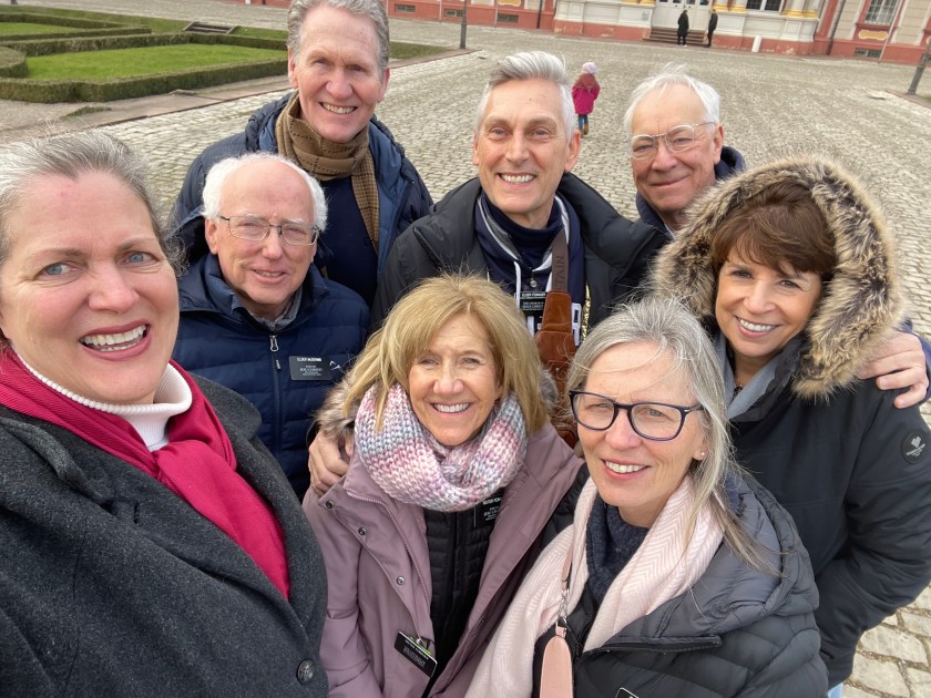 It was nice to be in a group of friends as we moved through the place with our headphones on. The tour included 2 floors of ball rooms, living spaces, receiving rooms, bedrooms, dressing rooms, servants’ rooms, and a music room where Mozart played as a young boy. We never saw a kitchen, but we saw doors they said were back passages for the servants to come and go, stoking the fires in the wood stoves in each room. There was nice artwork and lots of portraits of the people, but mostly the tapestries. Many of the rooms had fabric on the walls.