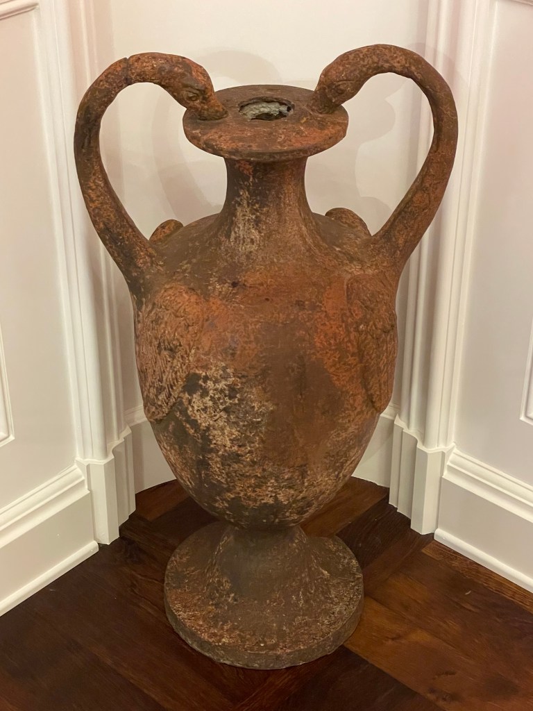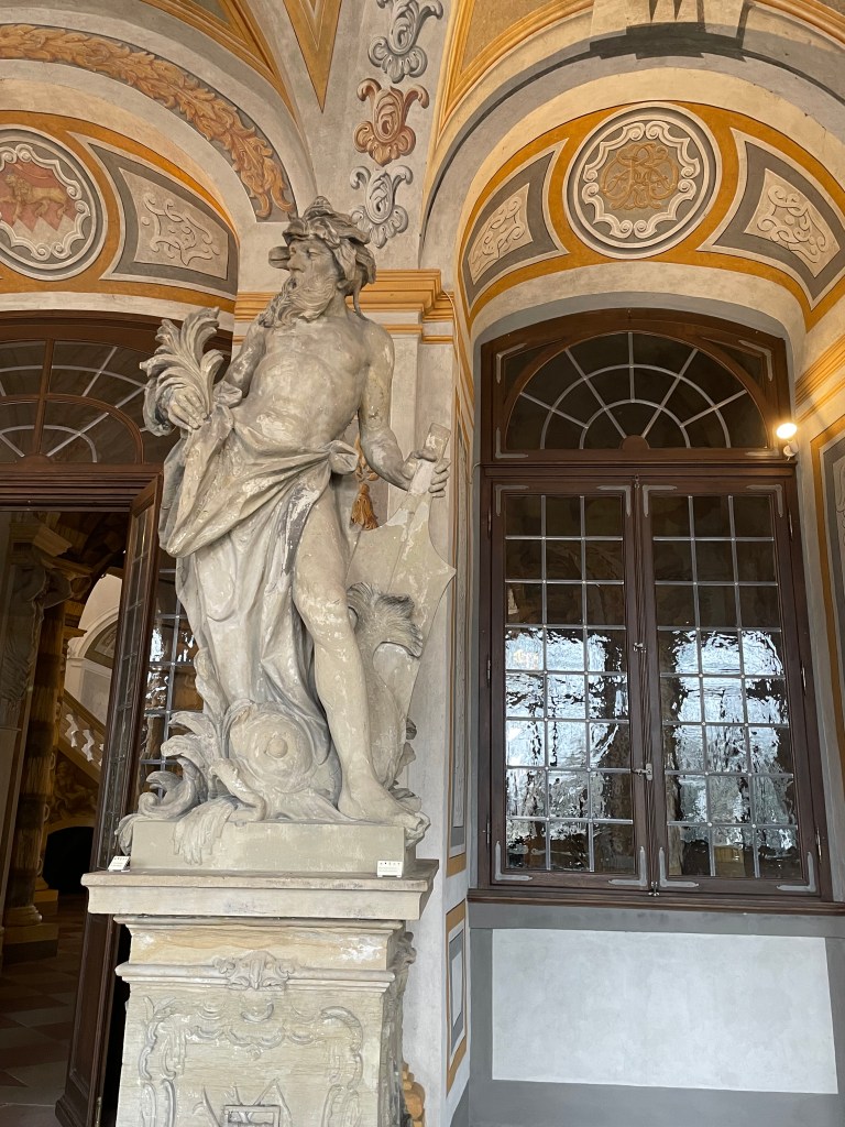 This grotto is dimly lit in imitation of a cave and decorated with murals of plant life, shells, and river deities beneath a ceiling fresco of a bird-filled sky. The Grotto, damaged by fire, was restored after World War II, but not in the neighboring Garden Hall, which survived the war but suffered water and frost damage. The ceiling fresco remains unrestored in a permanent exhibition of the palace’s destruction in 1945.