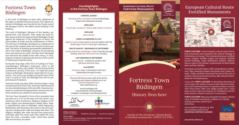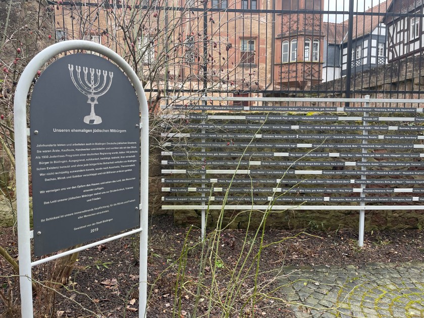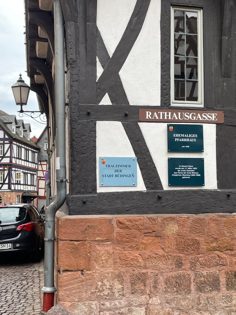 A Jewish Memorial, listing Büdingen Jews killed in the wars. A brass plaque on the historic town hall commemorates the fate of the Büdingen Jews: In memory of the dead, as a warning to the living – “In memory and remembrance of our persecuted and murdered fellow citizens of the Jewish community in Büdingen who were deprived of their livelihood by the National Socialist dictatorship – We mourn the suffering of all Büdingen Jews.”