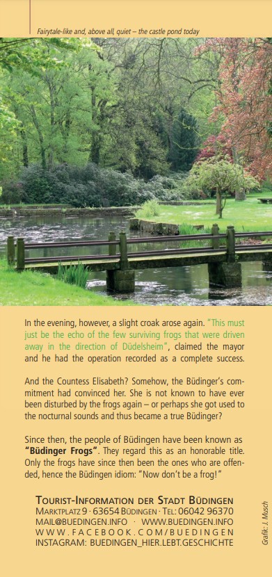 Büdingen is known as the City of Frogs. A popular folktale says that days into the marriage of the Count of Büdingen and Elizabeth of Wied, the new Countess could not sleep because of the deafening sounds of croaking frogs. In the 1500s, Büdingen was not only fortified, but had a moat (which was later filled). The Count rallied the citizens to rid the town of the frogs and save his marriage. Some versions record a successful expulsion of the frogs, while others claim they came back louder than ever. The city has kept the frog as a mascot-like symbol for hundreds of years.