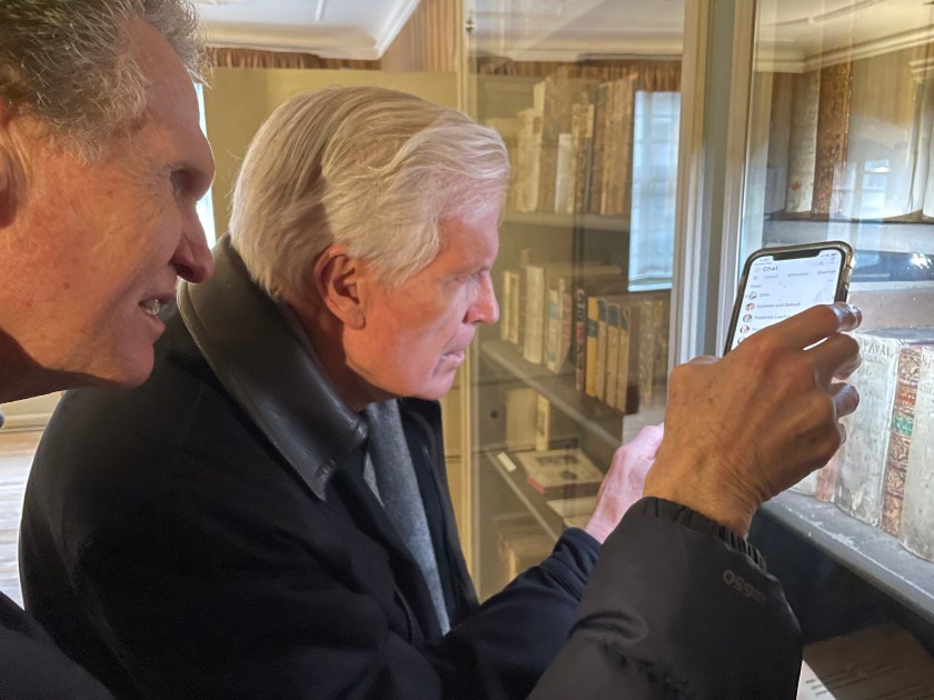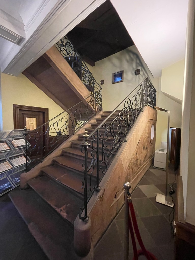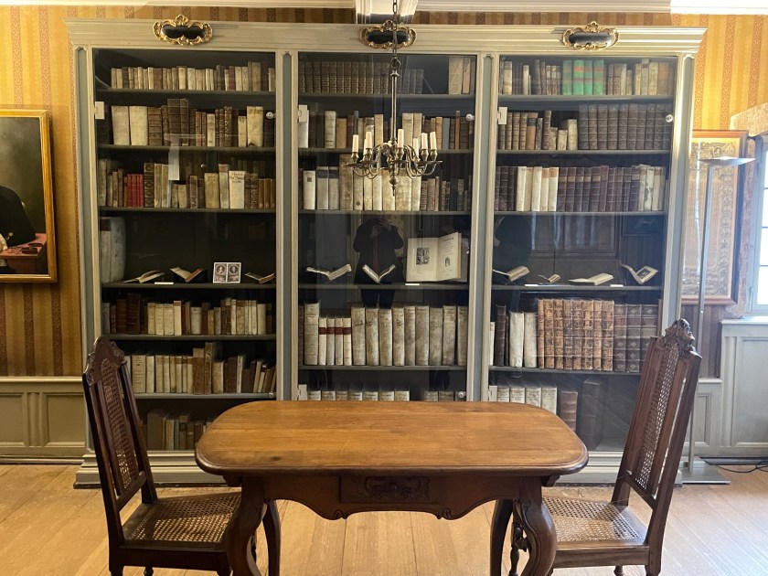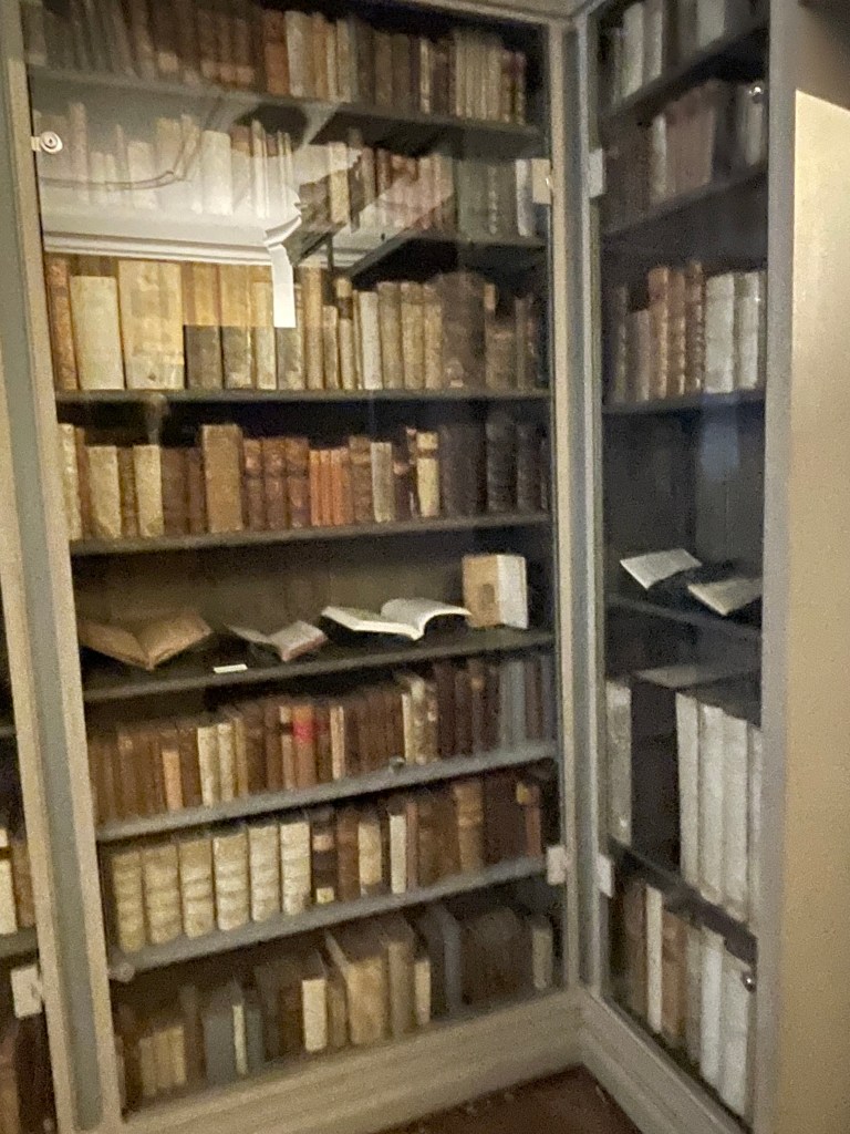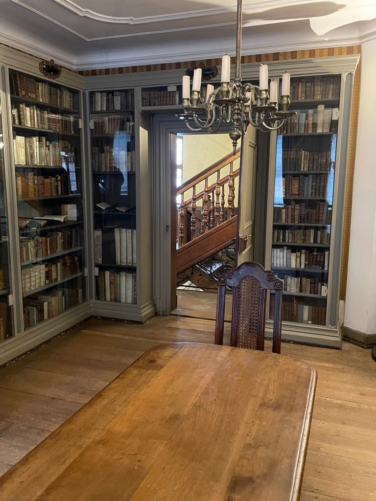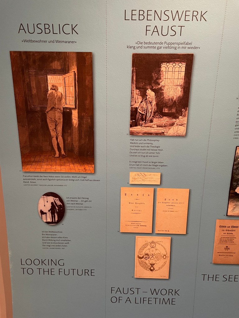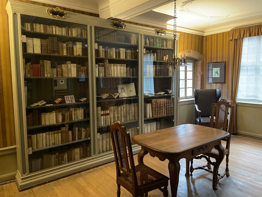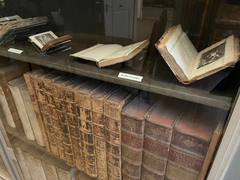 The museum desk was in front of these bookshelves filled with copies of Goethe’s words.
