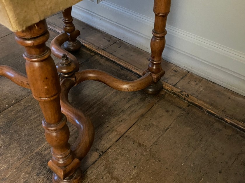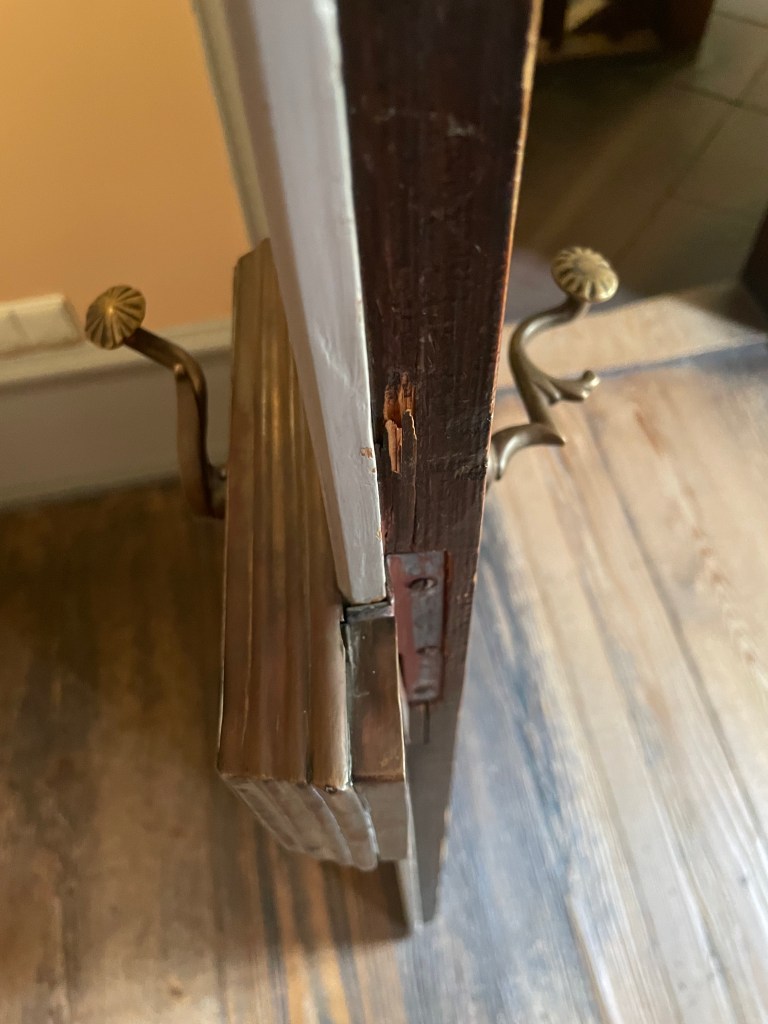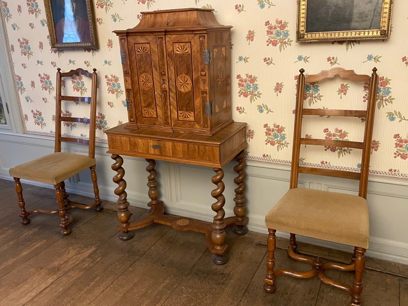 Here’s another interesting feature. Look at the strip of wood nailed to the floor around the edges of the room. Instead of a wainscot to keep chairs from damaging the wallpaper, these strips stopped the chairs from being pushed too close to the walls.