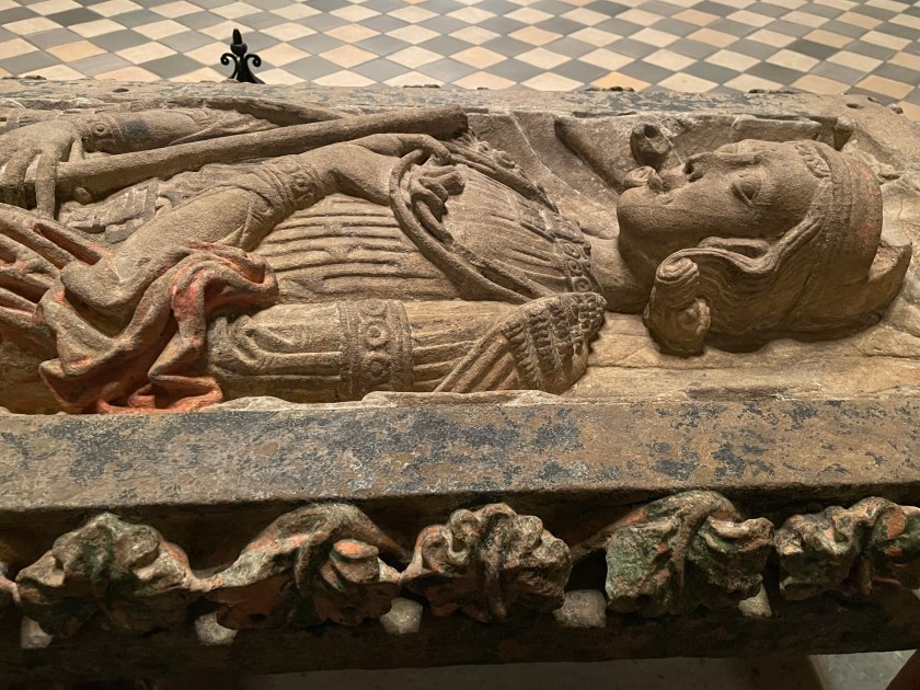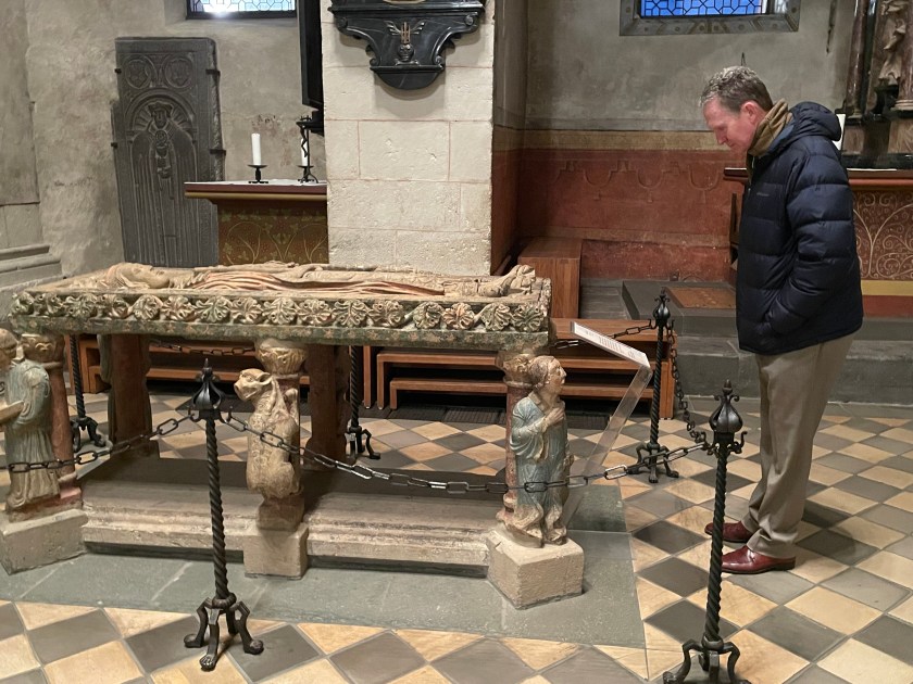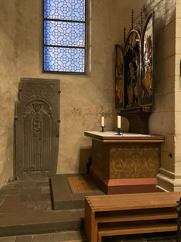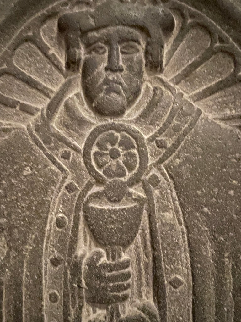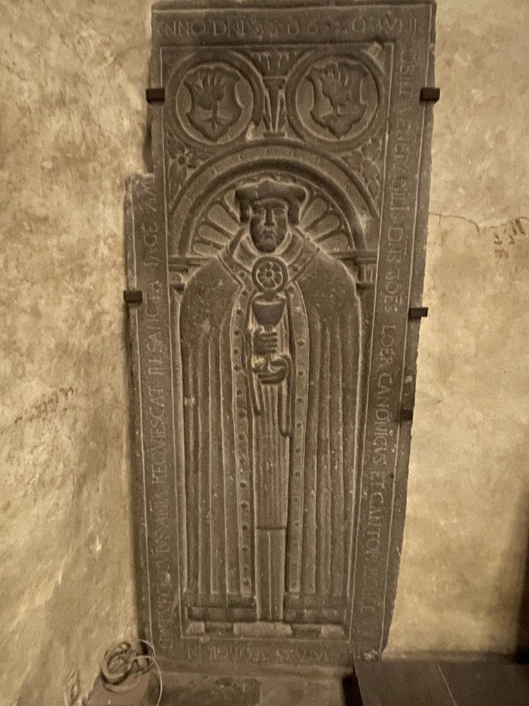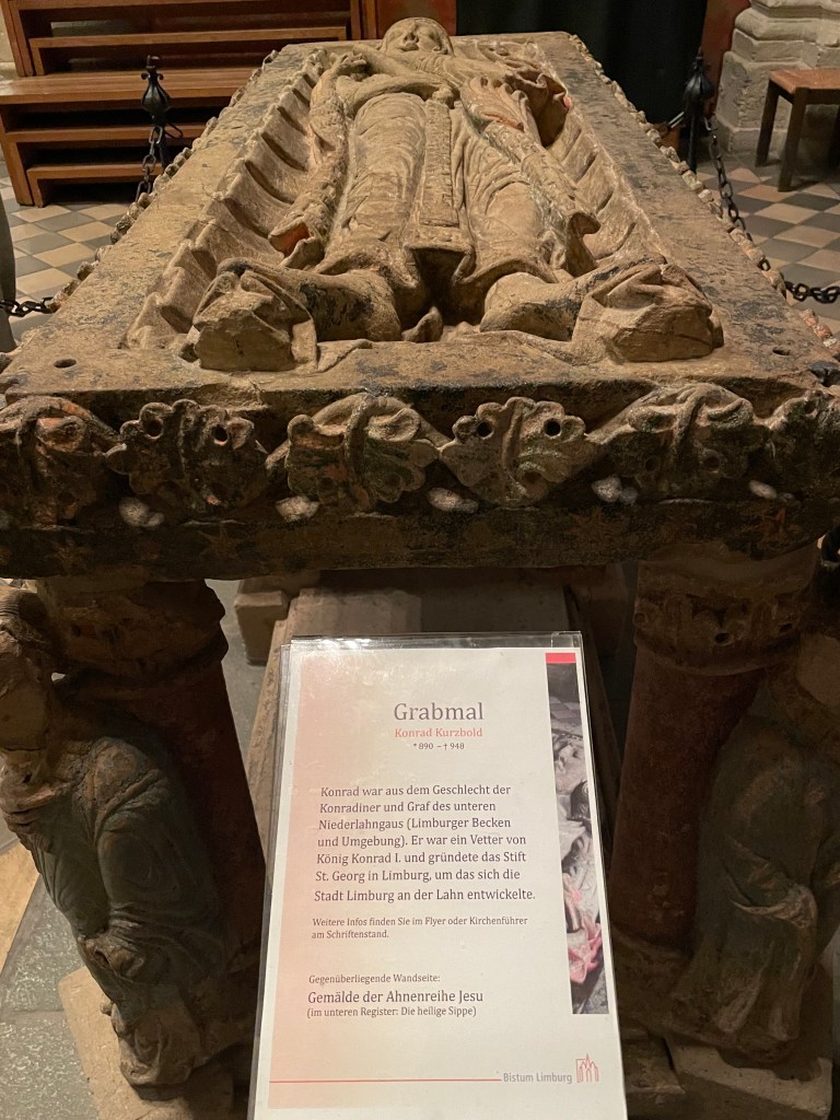 This grave marker is for Konrad Kurzbold who was born in 890 and died in 948.