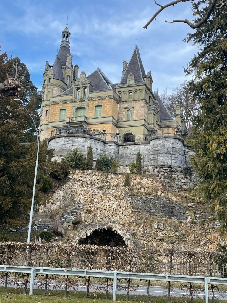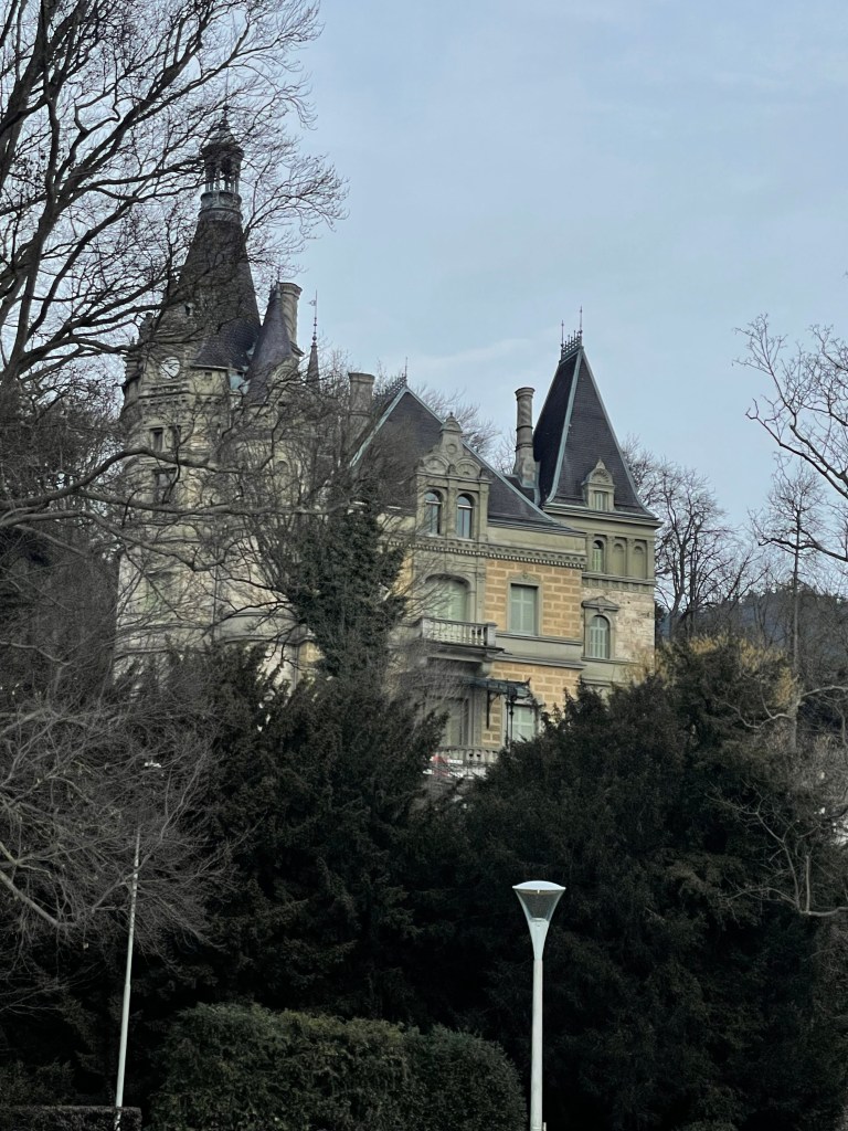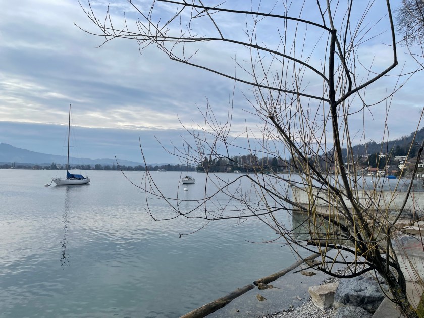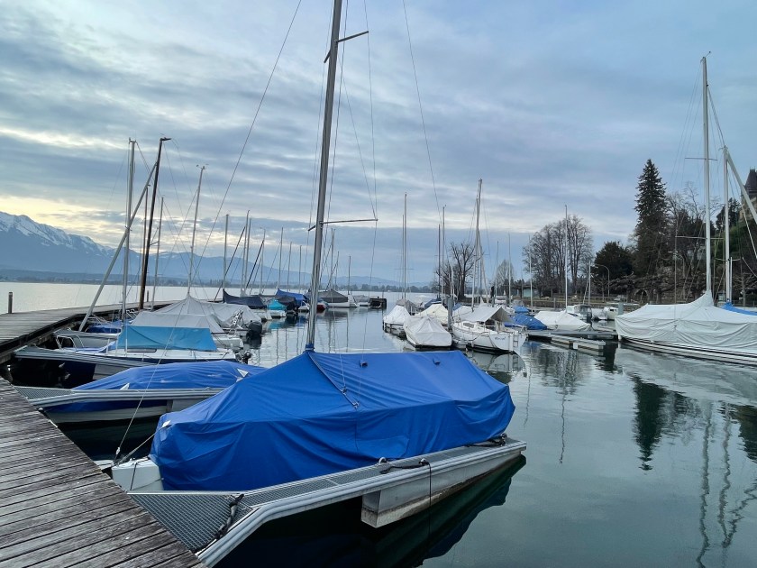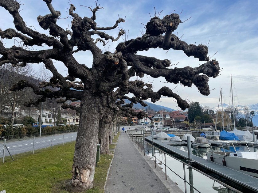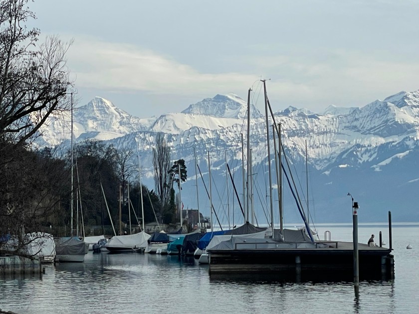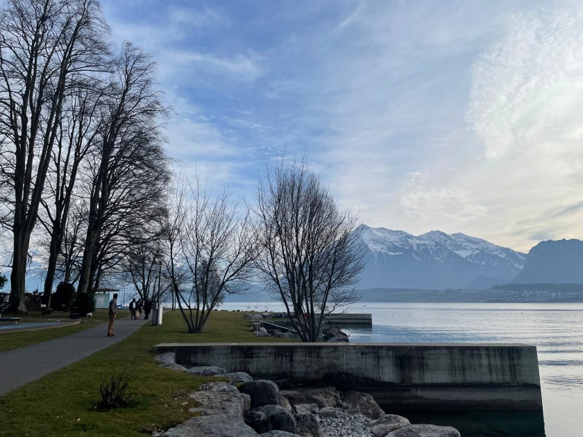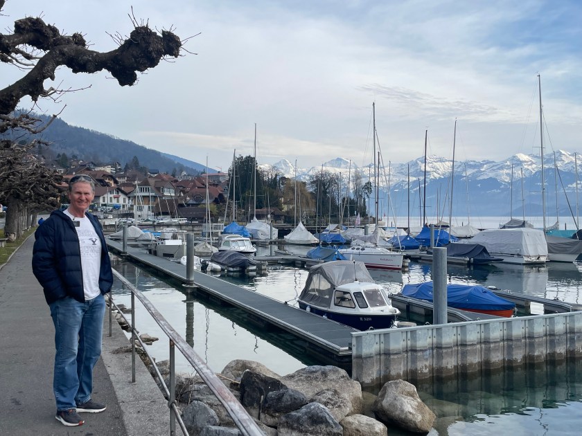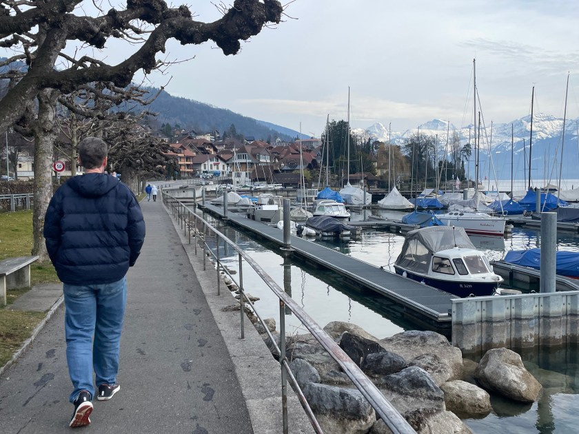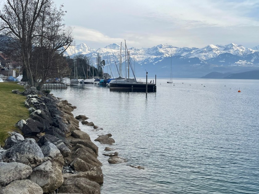 Next we drove from Basel to Interlaken, along the Thuner See. It is so beautiful. We stopped once or twice (Hiltersfingen) to get out and walk along the water a bit. We could see the Alps in the distance, covered in snow. The drive was about 1.5 hours through this beautiful lake country.
