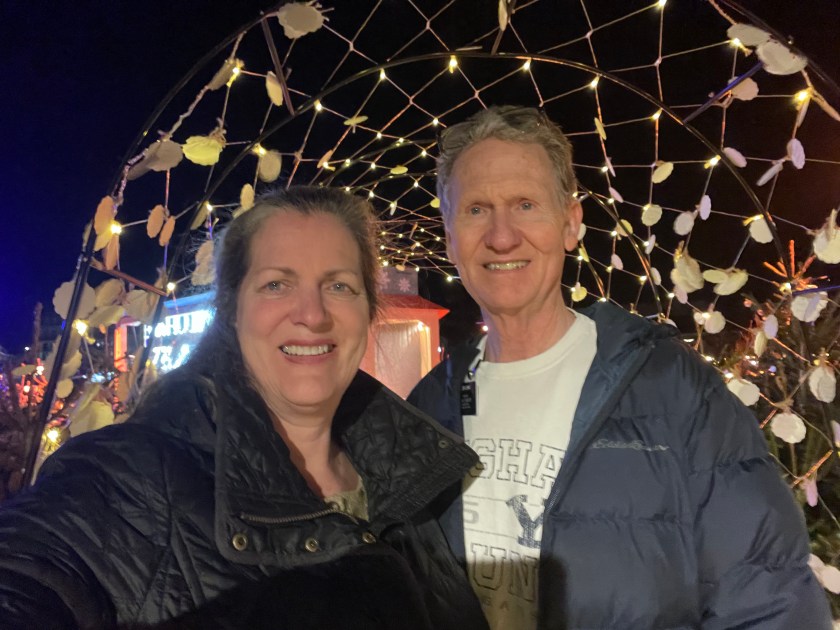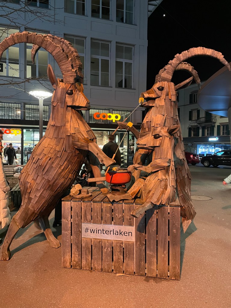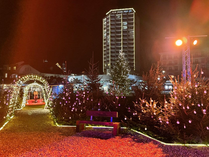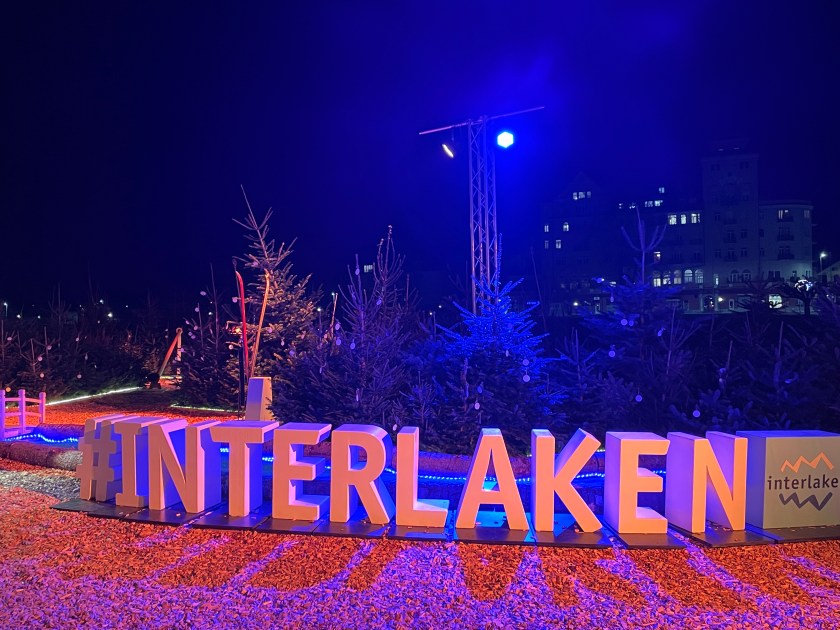This evening we went to the big park in Interlaken where John did his very first street contacting many years ago. There was an interesting thing going on in the park–an area you could walk through where unsold Christmas trees were brought and set up with lights and paths through them. You could write wishes for the new year on ornament tags and hang them on the trees. It’s a conservation thing sponsored by a power company.